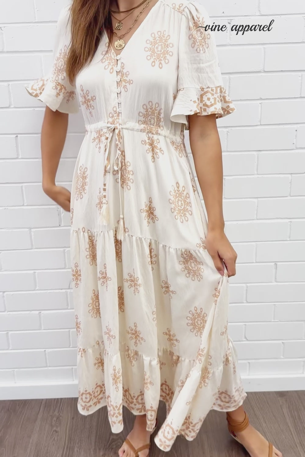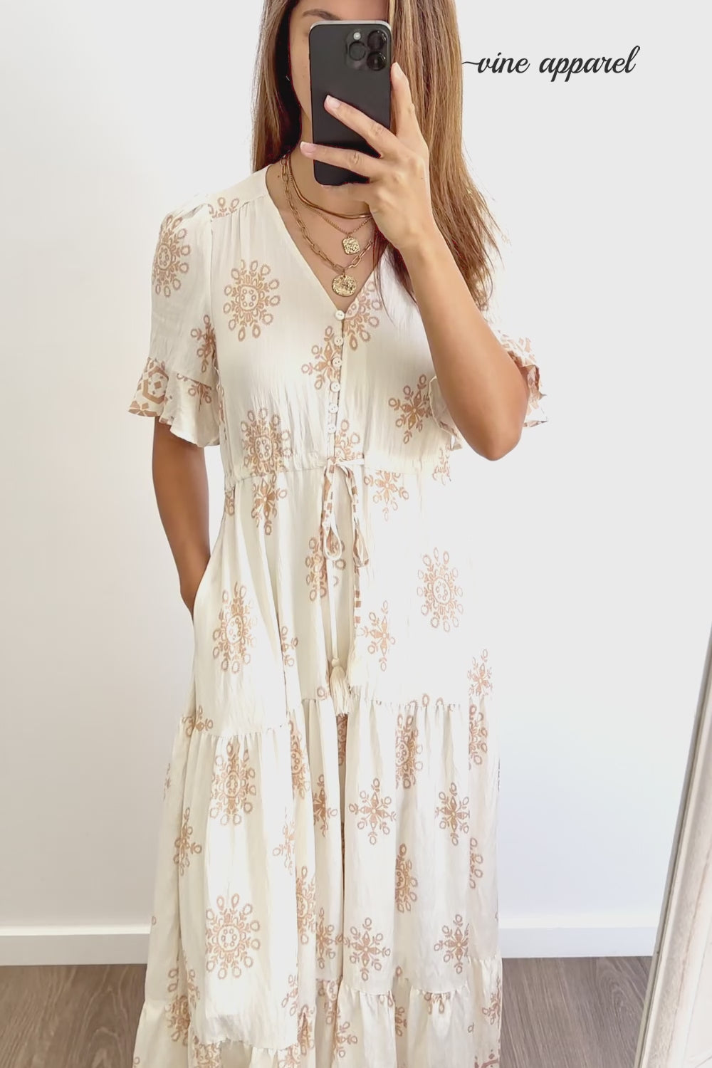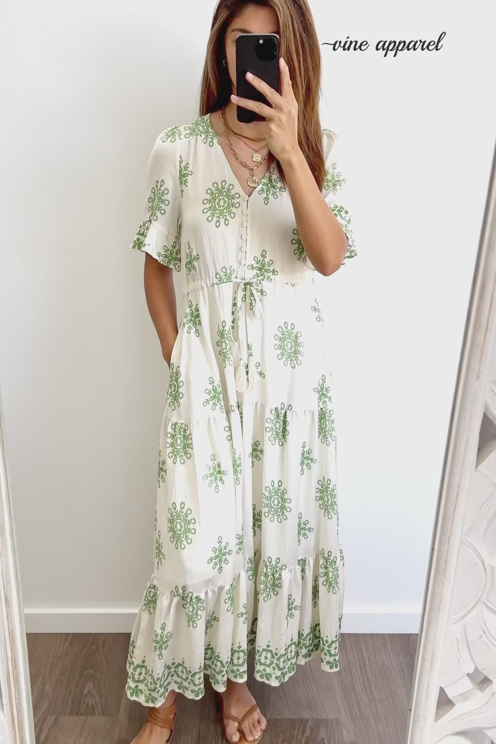 A simple maxi in a lovely shape in a pretty print with functional buttons at the bust, elastic under the bust, and pretty sleeves. It is lined from the waist down and it has pockets.