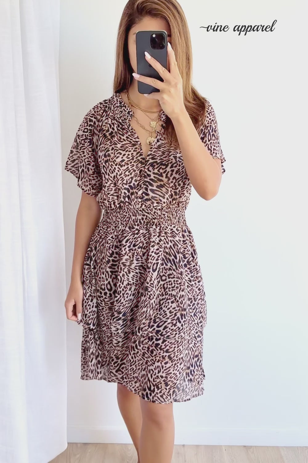 This flirty leopard print dress is the perfect mix of fun and effortless. The waist is stretchy and with the floaty silhouette, and ruffled skirt, it compliments all the right places while keeping you comfortable. The sleeves fluttery and there are functional buttons at the bust. So cute!