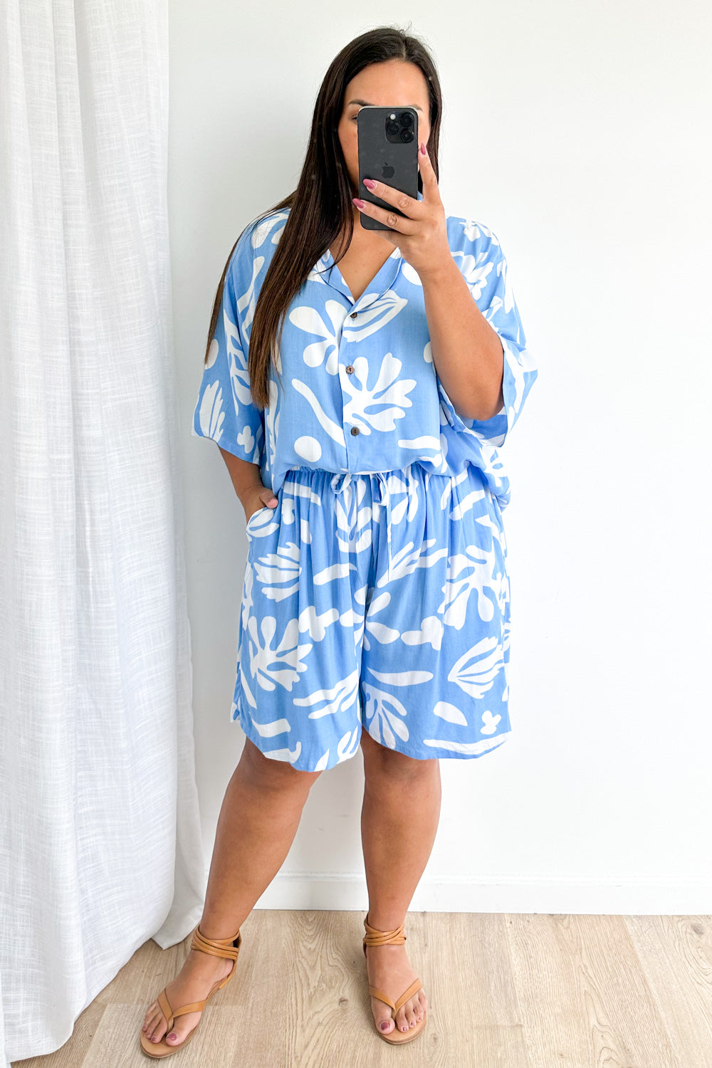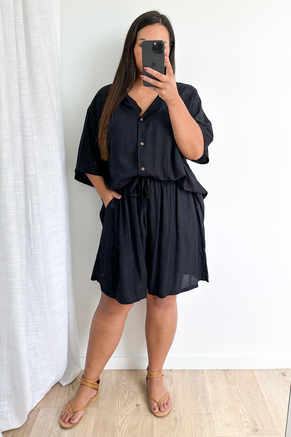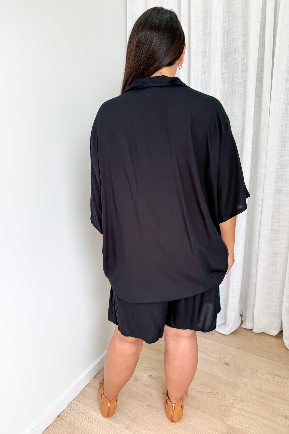 Oversized shorts and a loose, light weight shirt - so comfy, so good. The shorts feature an elastic waist, and the shirt looks good open or done up. It’s good.