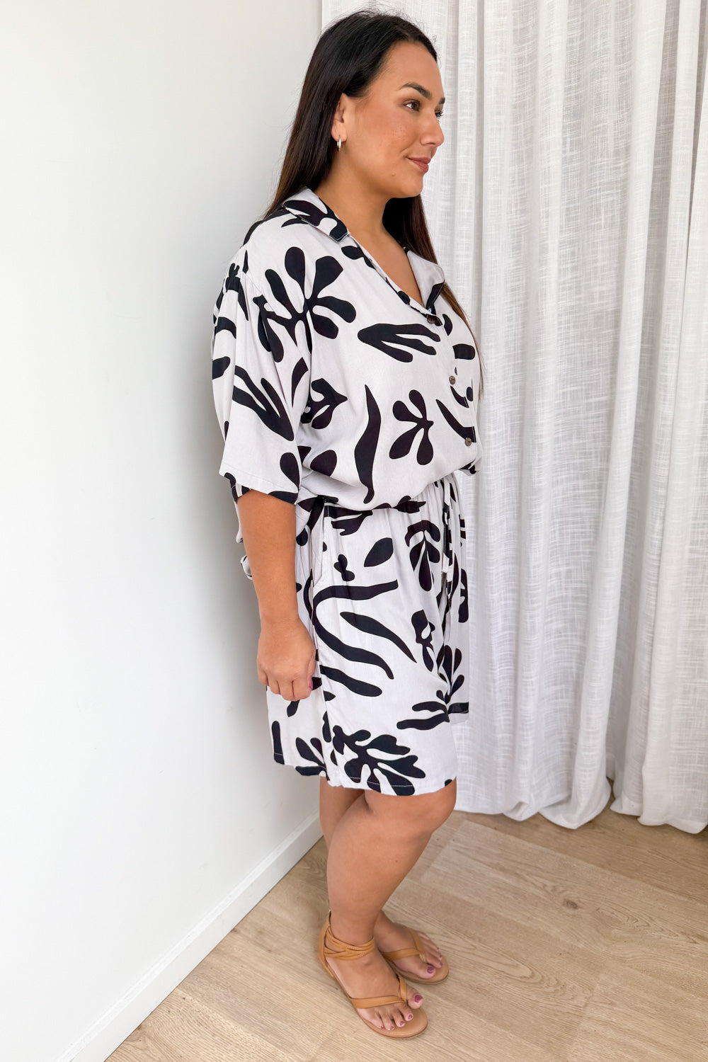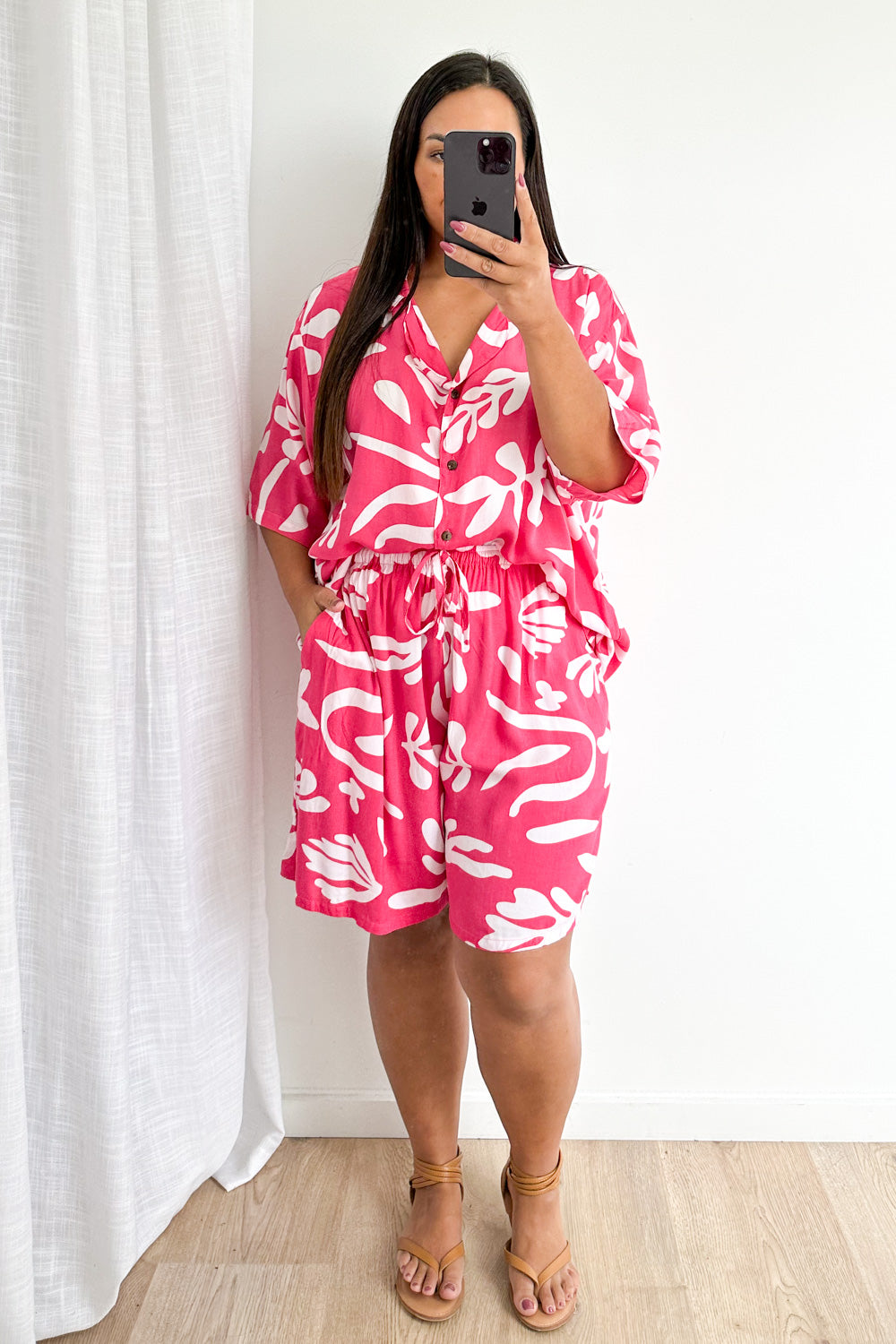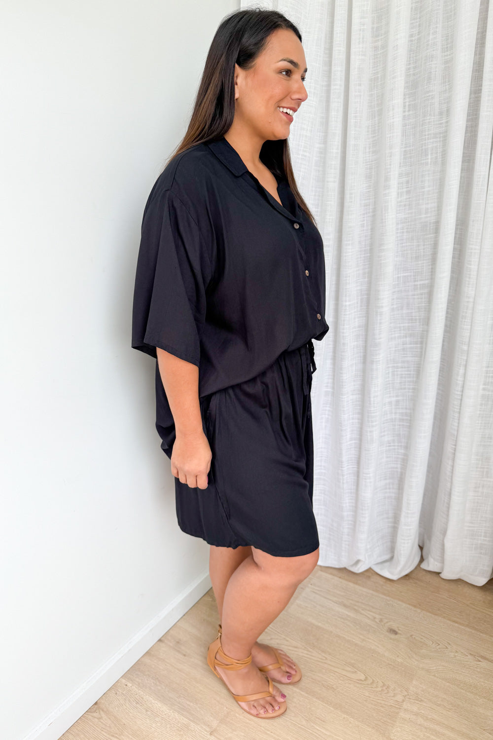 Oversized shorts and a loose, light weight shirt - so comfy, so good. The shorts feature an elastic waist, and the shirt looks good open or done up. It’s good.