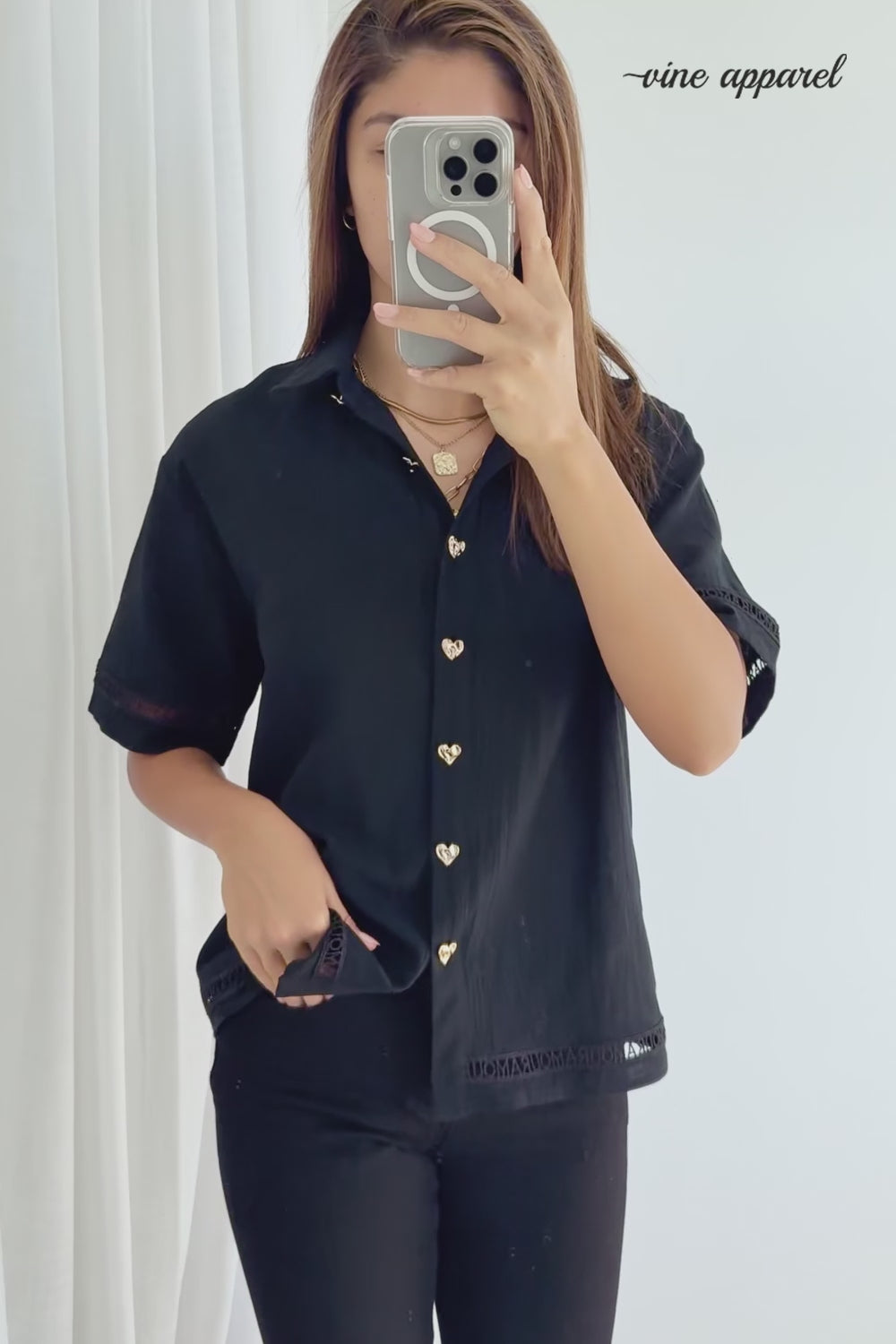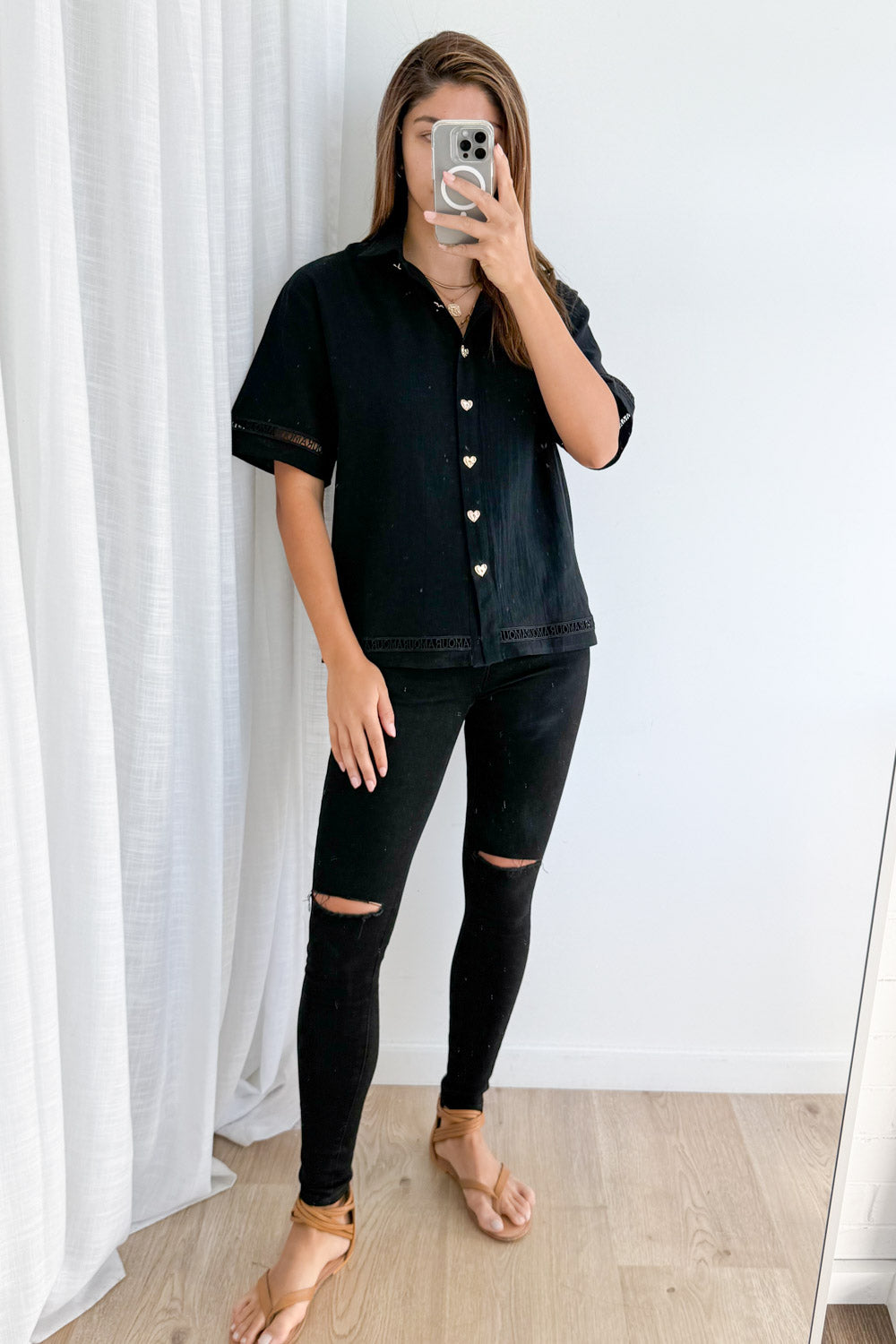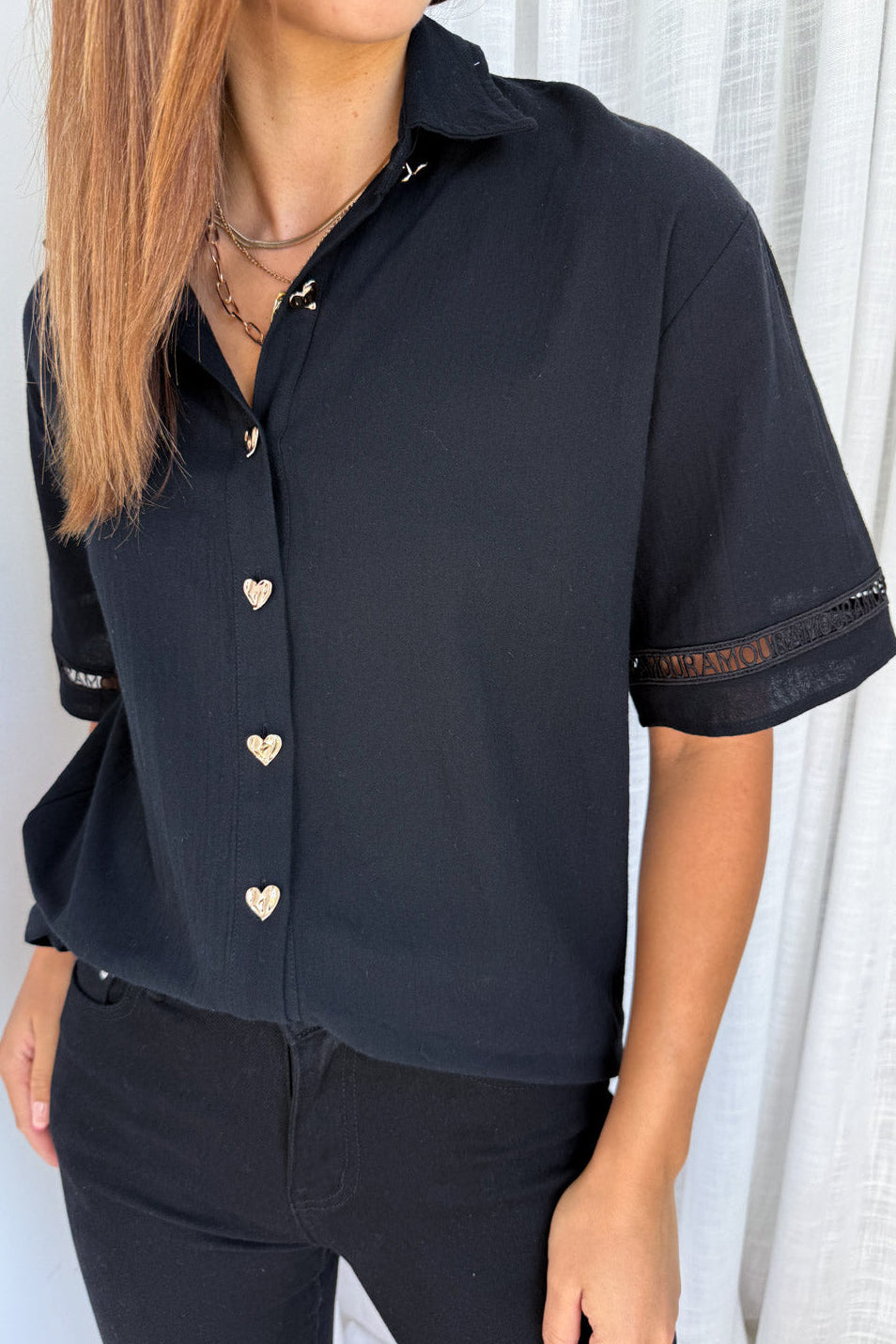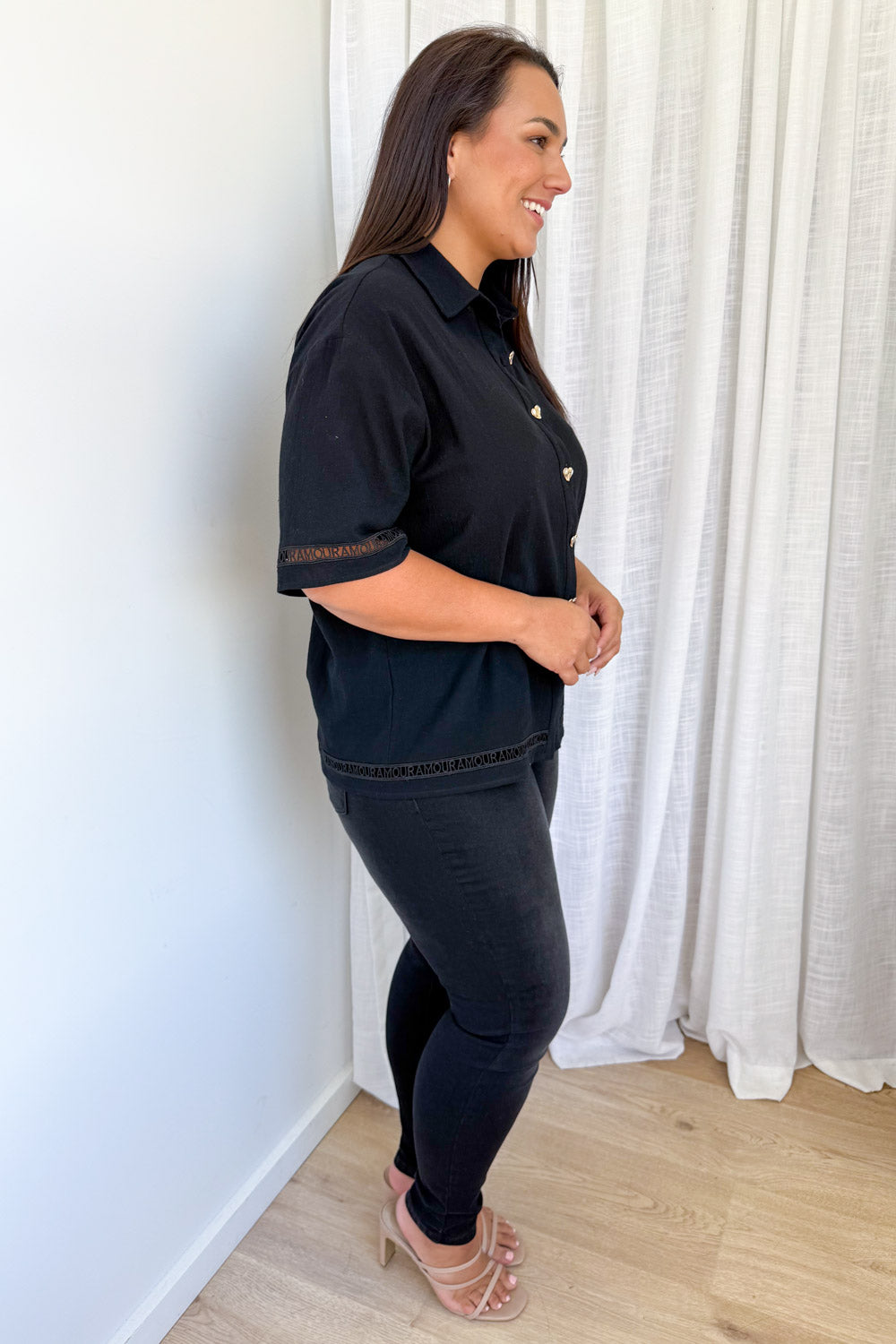 A loose yet not too big shirt which is a good length and has good arm allowance, we love it. The heart buttons are gorgeous, and the amour detail around the sleeve and base of the shirt is lovely.