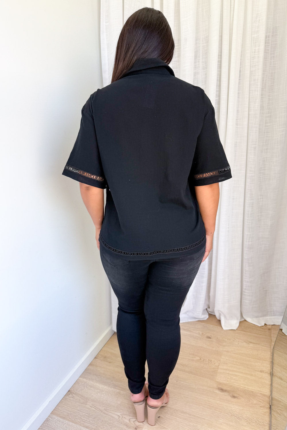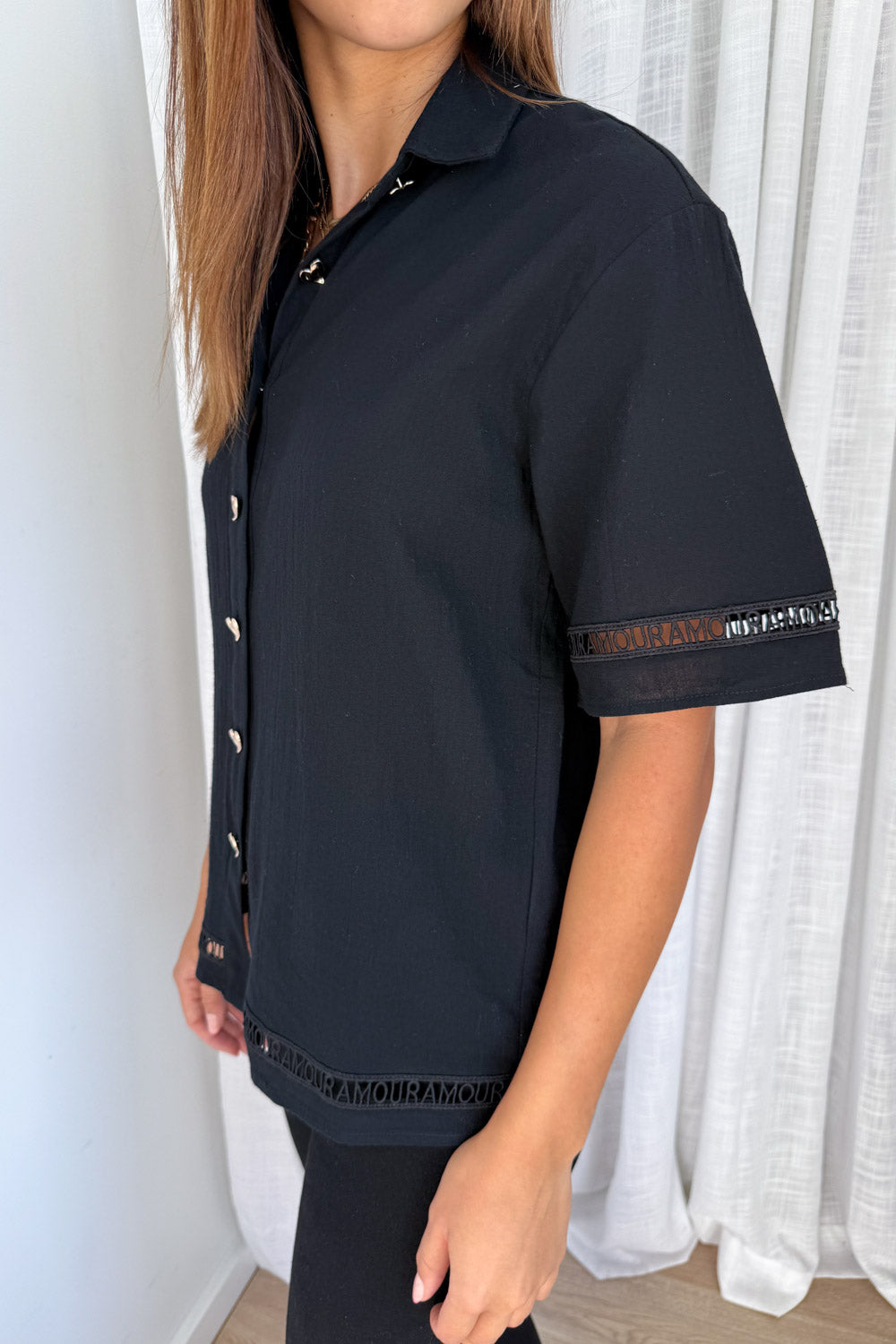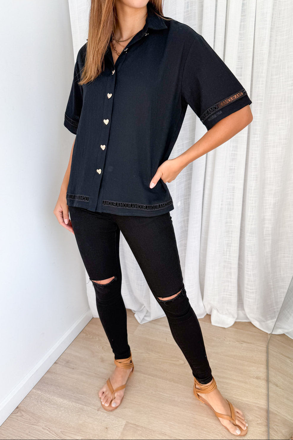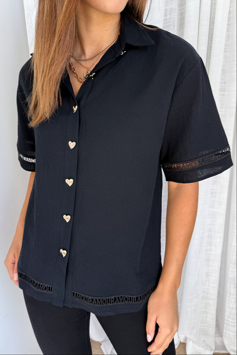 A loose yet not too big shirt which is a good length and has good arm allowance, we love it. The heart buttons are gorgeous, and the amour detail around the sleeve and base of the shirt is lovely.