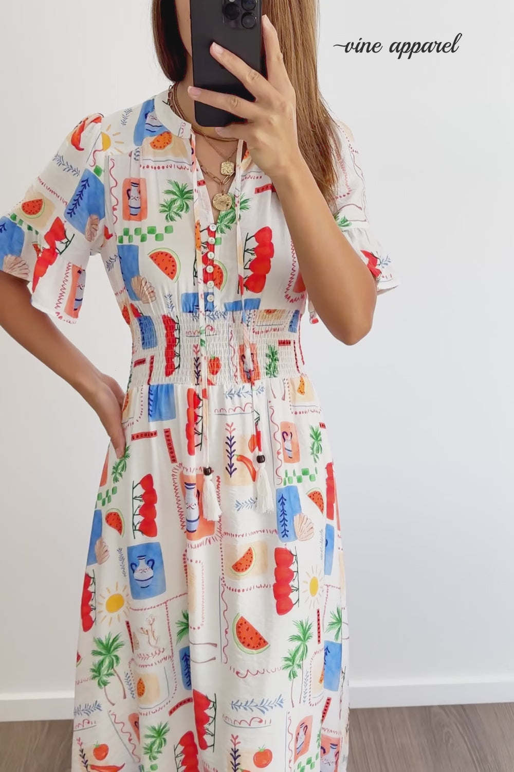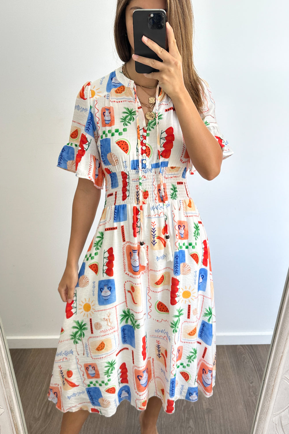 An effortless White Multi throw-on that’s a little bit boho yet totally wearable. Elastic rouching around the waist, and the sleeves are fluttery and nice. The length is good, the dress itself is lovely and flowy, and it feels nice on.