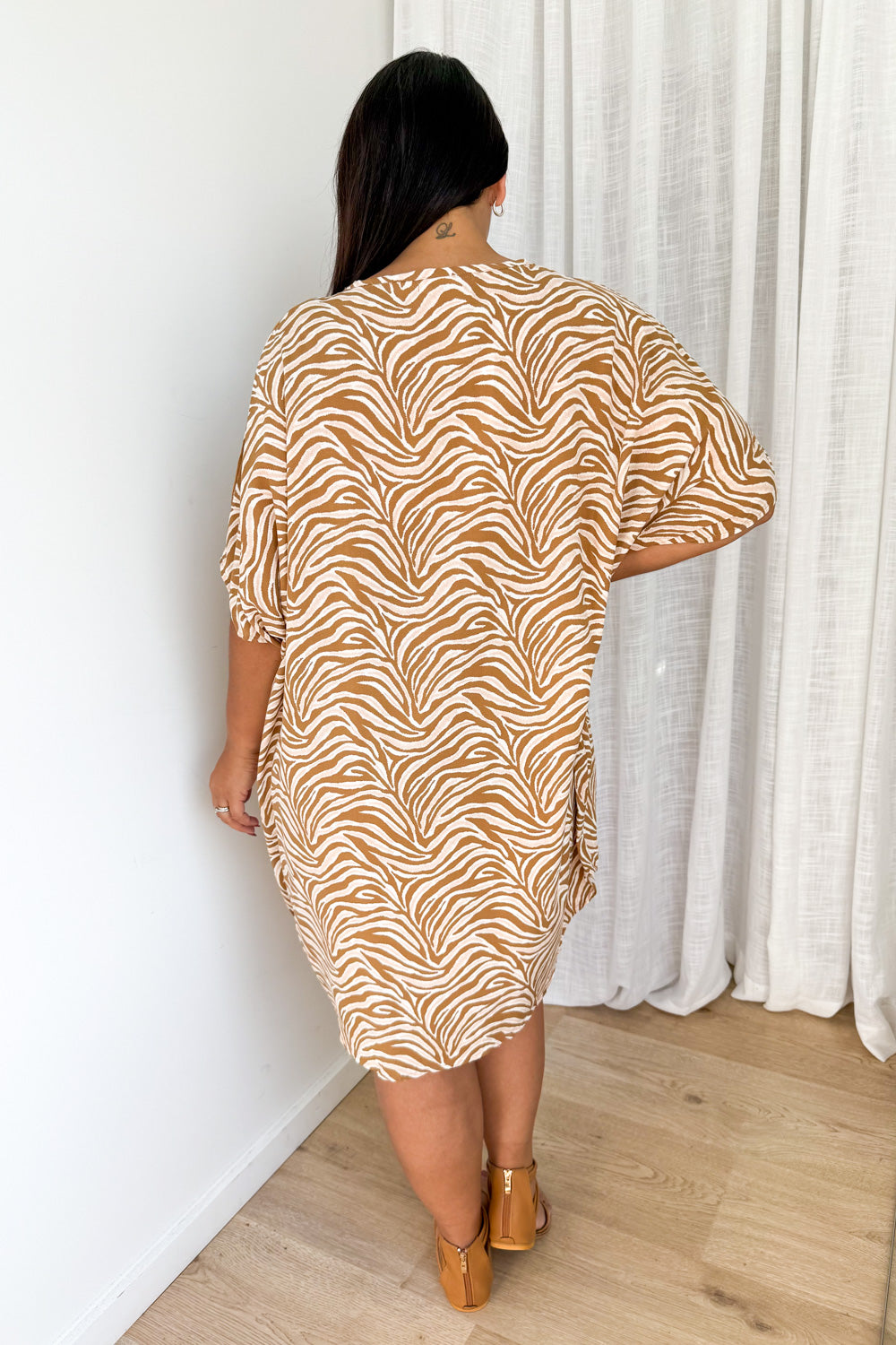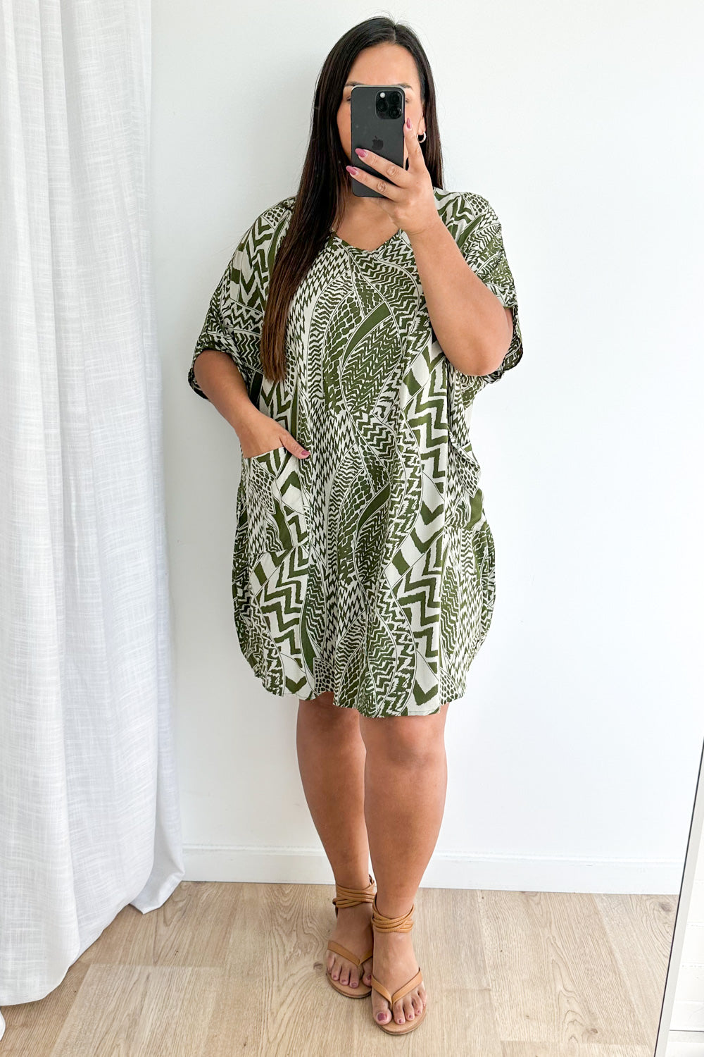 So, on me it comes down to the bottom of my knees - I'm 173cm. This is one size and it will fit a size 8 to a size 20, which sounds ridiculous, but it's roomy and yet still has shape.