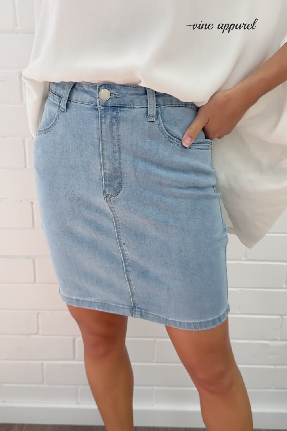 Just a simple easy denim skirt, with stretch, pockets, and it isn't short. It's not long, but it's definitely not short. The length is good, the stretch means it moves with you, and it's just comfy.