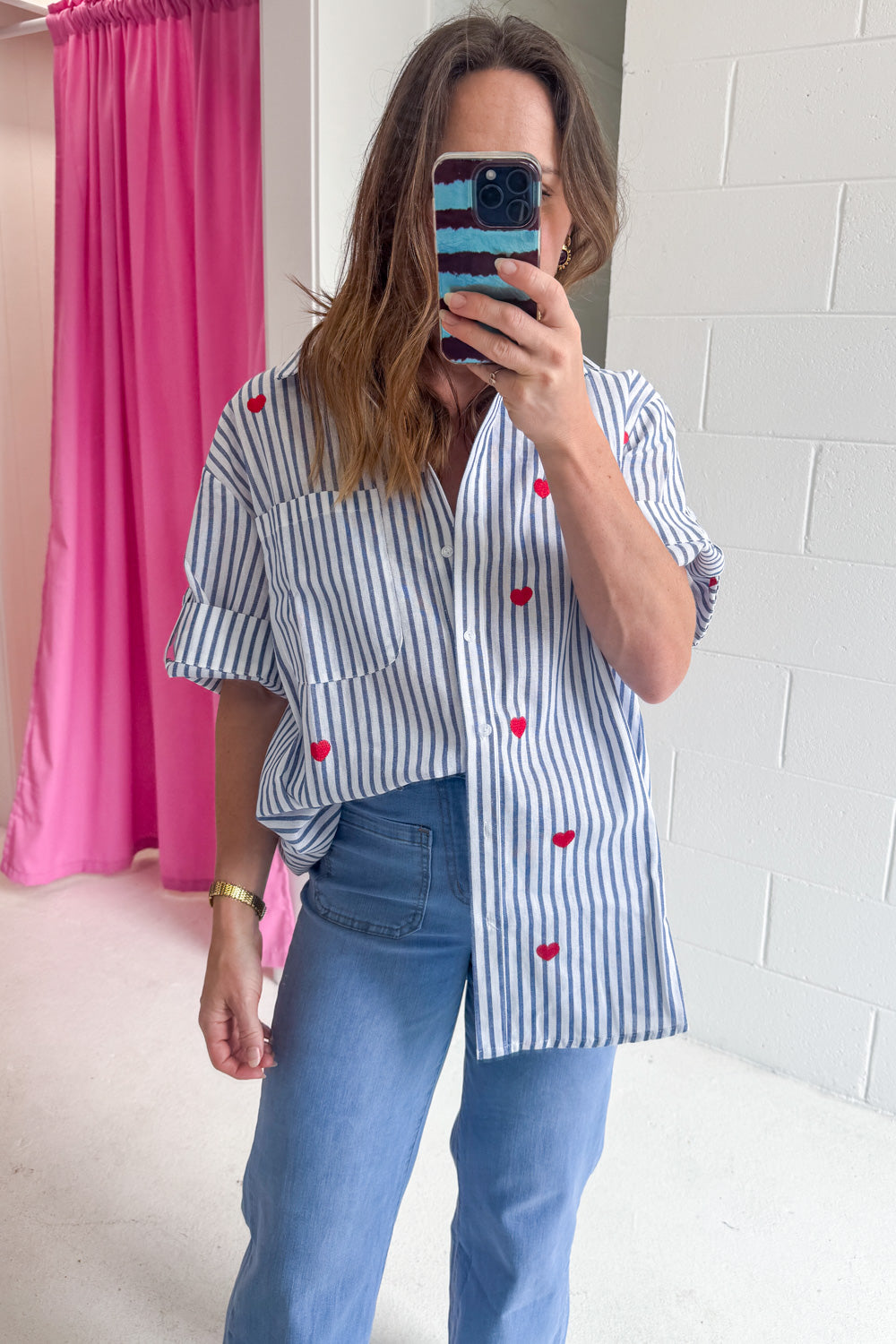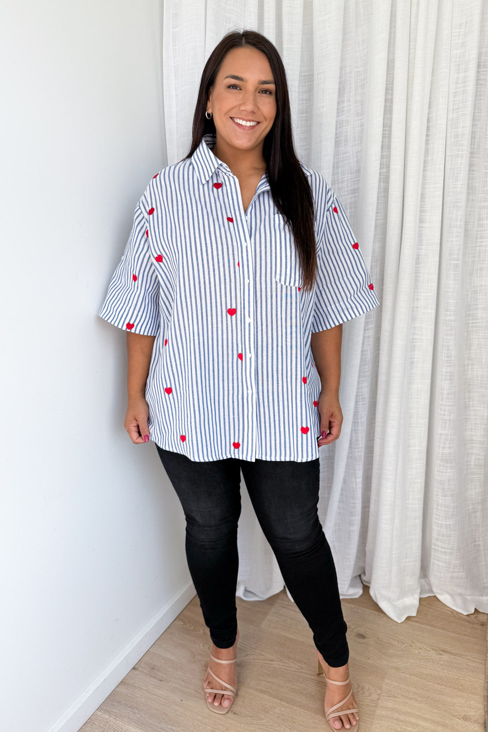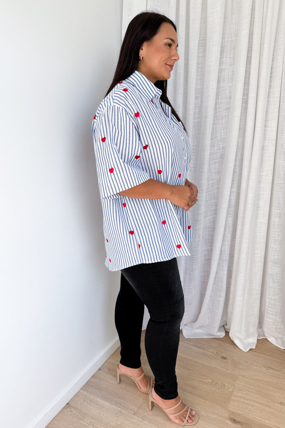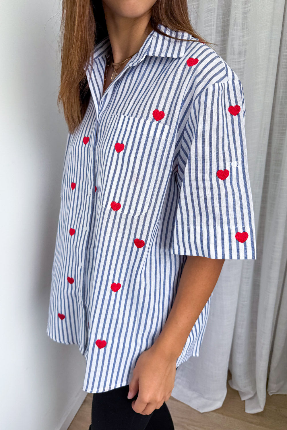 How cute is this! A classic stripe shirt with the CUTEST little hearts embroidered all over it – love love love love love. A lovely fabric and a good, flattering cut, it has good arm allowance and is a good length – you can wear it loose or tuck it in.