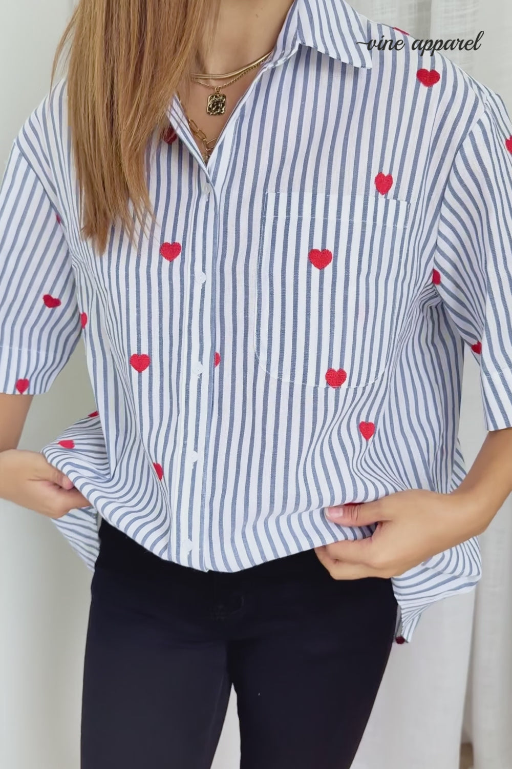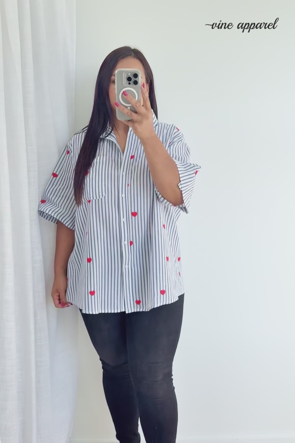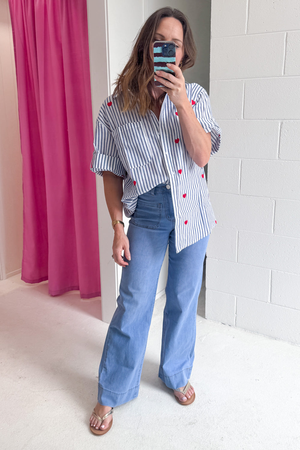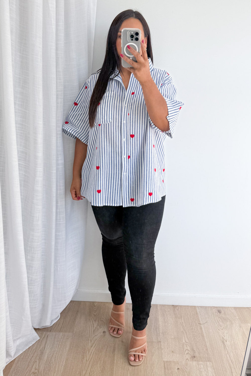 How cute is this! A classic stripe shirt with the CUTEST little hearts embroidered all over it – love love love love love. A lovely fabric and a good, flattering cut, it has good arm allowance and is a good length – you can wear it loose or tuck it in.