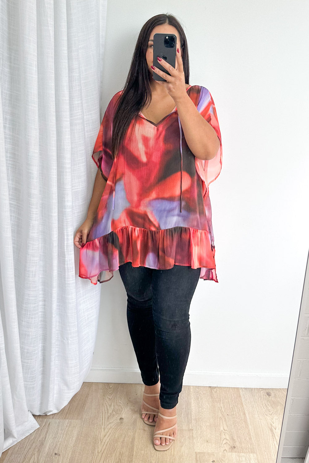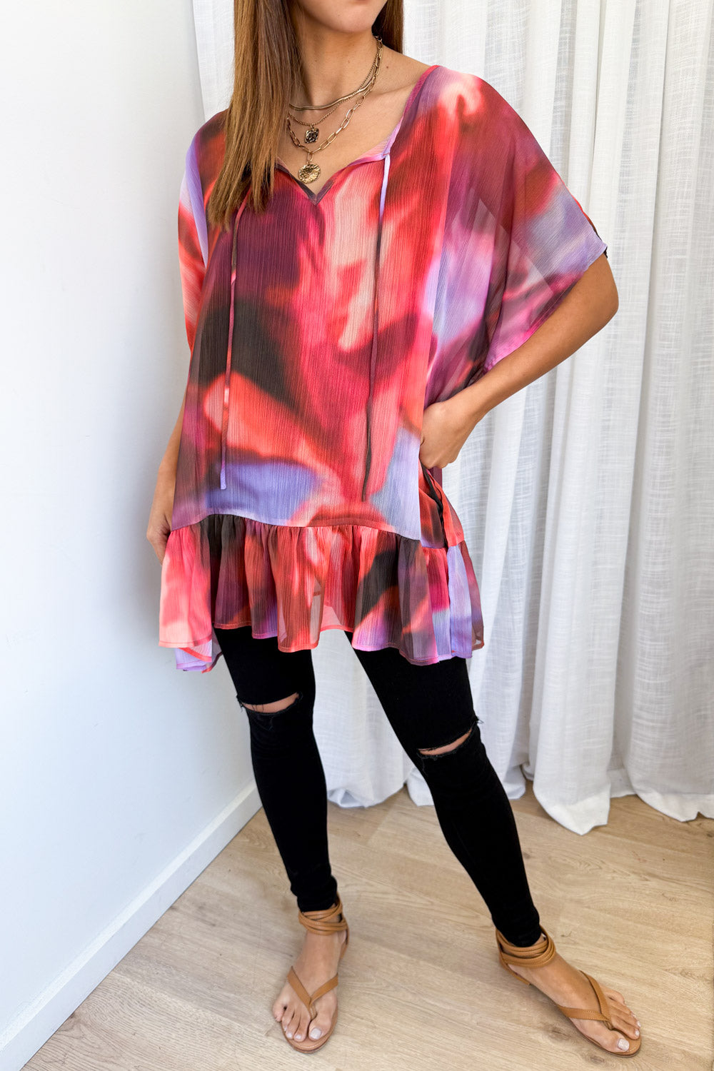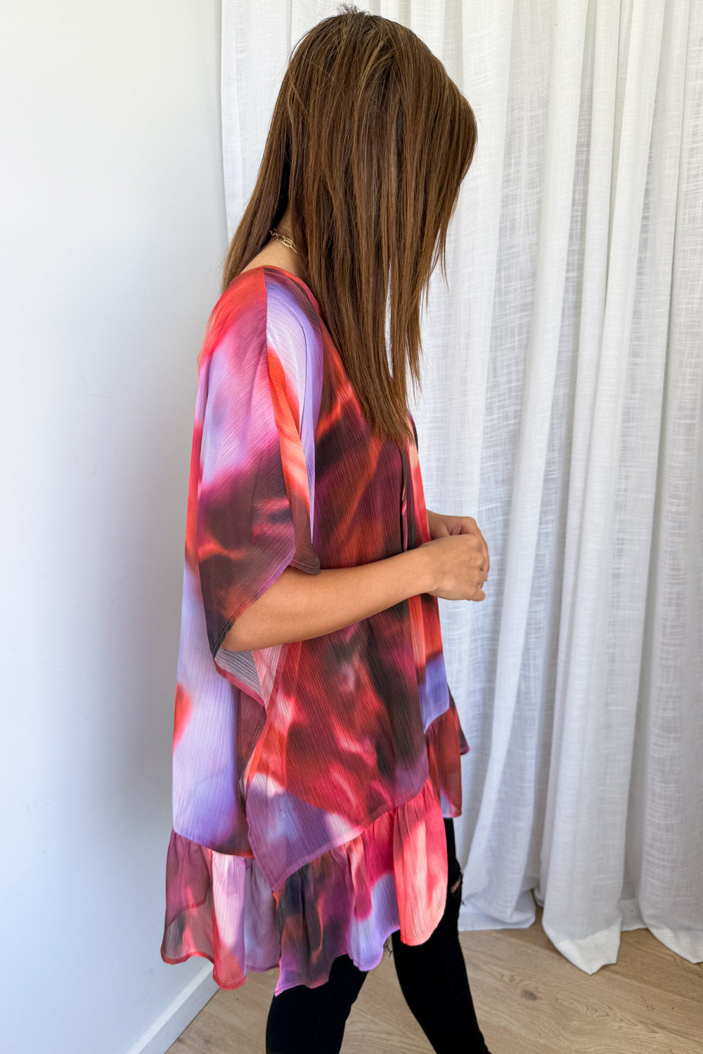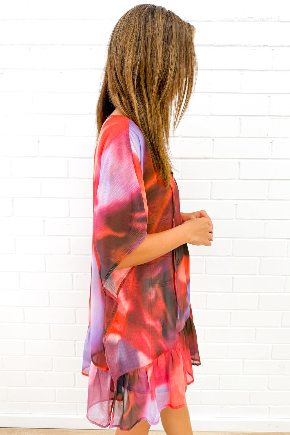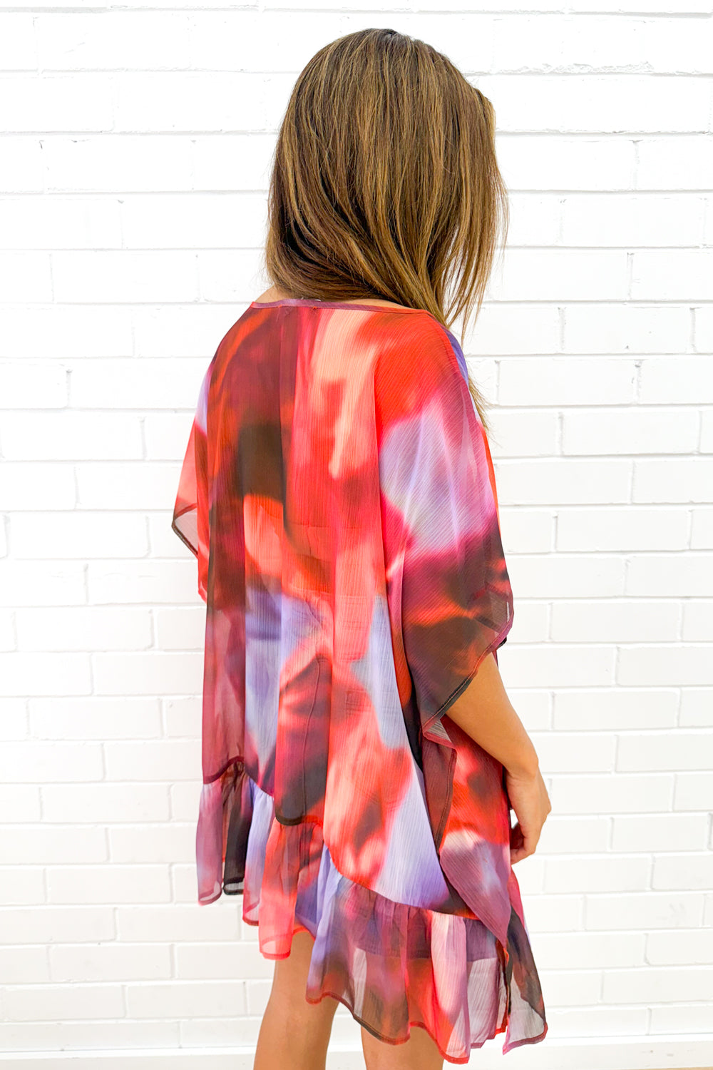Oversized and just so nice on on, it’s a lovely shape which drapes beautifully. The frill detail down the bottom is pretty, the arm allowance is good, and it can be worn anywhere from over a cossie at the pool, or out for drinks with the gals.