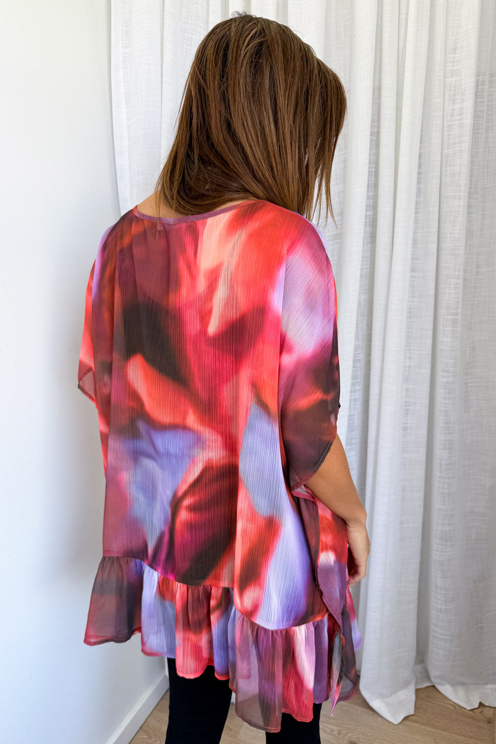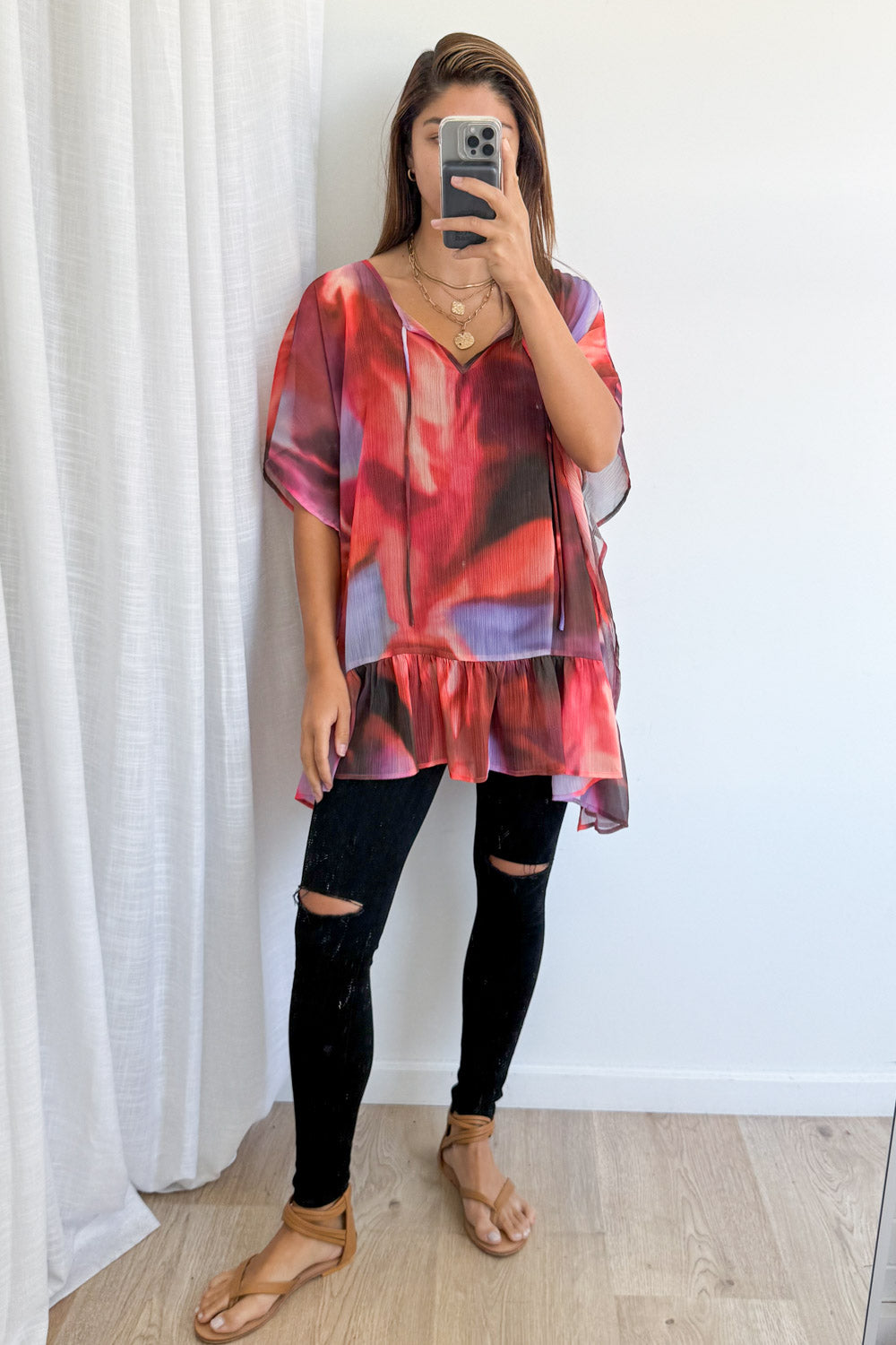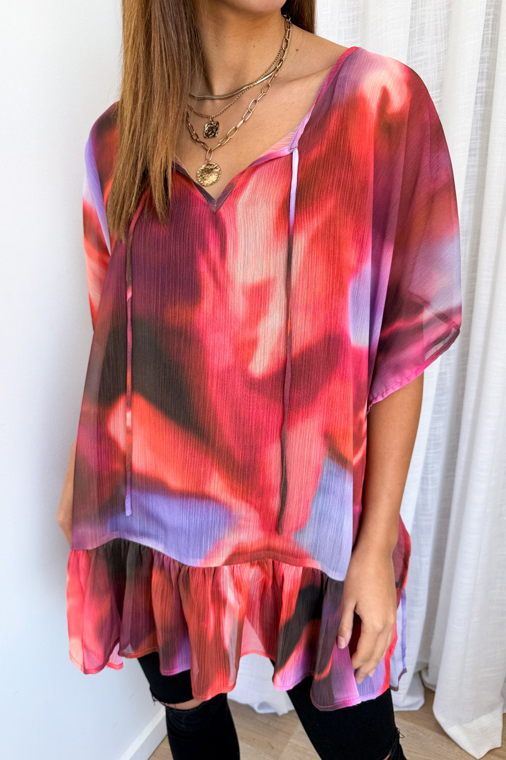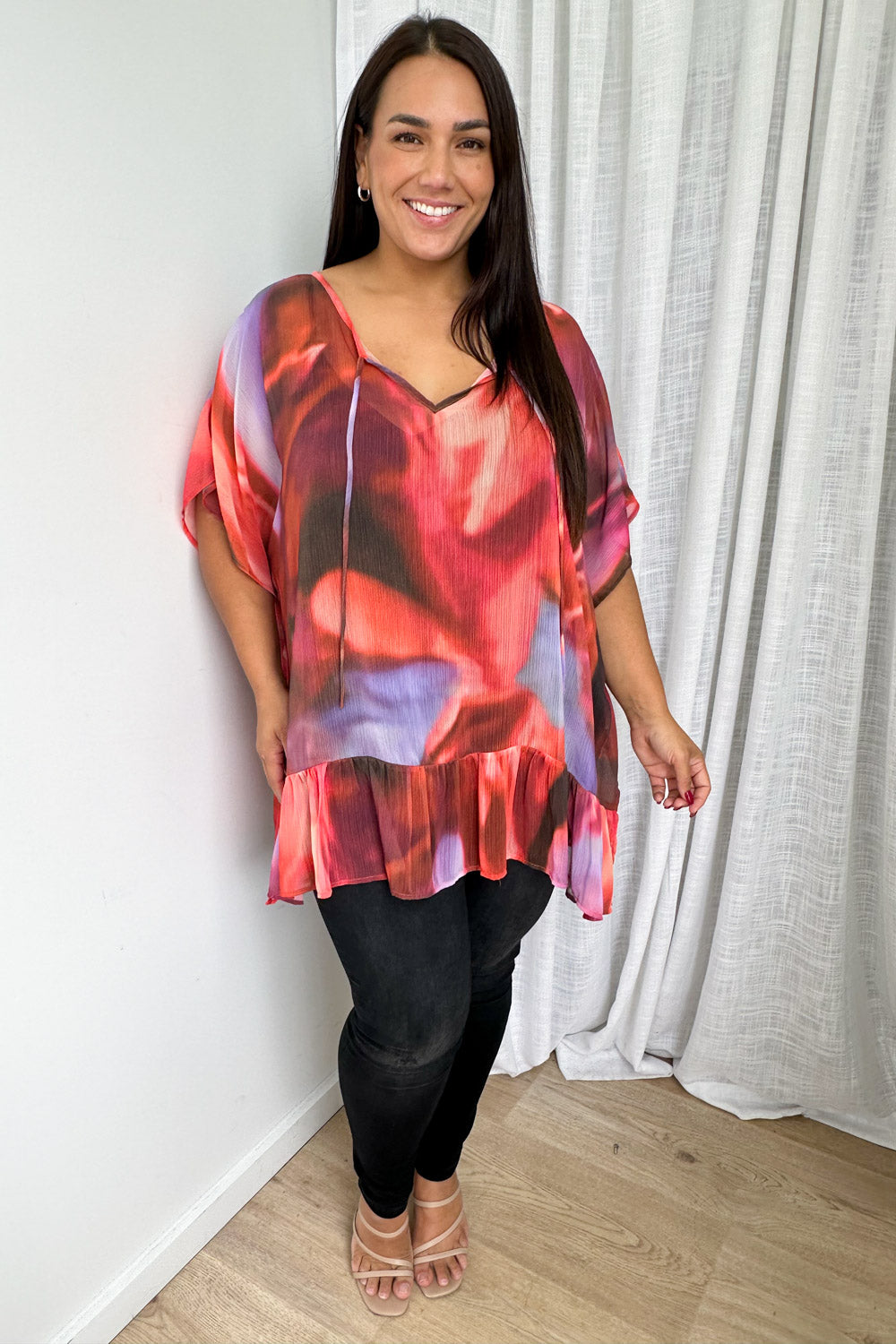 Oversized and just so nice on on, it’s a lovely shape which drapes beautifully. The frill detail down the bottom is pretty, the arm allowance is good, and it can be worn anywhere from over a cossie at the pool, or out for drinks with the gals.