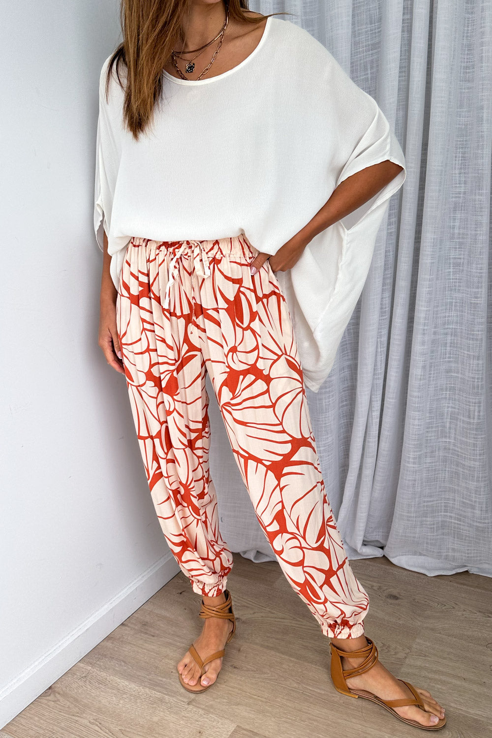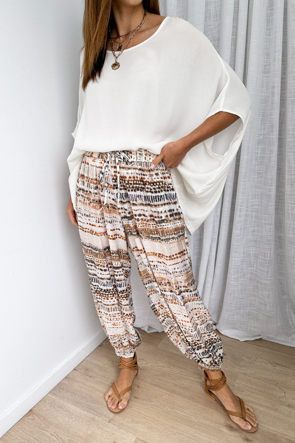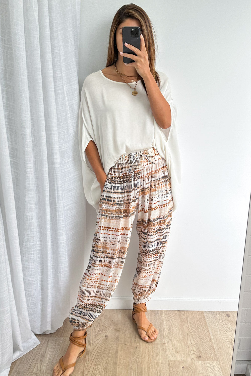 Lightweight, soft and just so nice on, these flatter all shapes and sizes, and are perfect regardless of your height. The waist is elastic, a really nice stretchy elastic, and it has a drawstring. The bottoms are cuffed, not a thick cuff but about a 2cm elastic cuff, so they can be worn long or pulled up the calf. They look AND feel good on, and they’ve got pockets of course :)