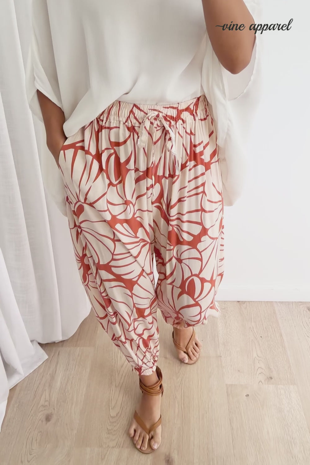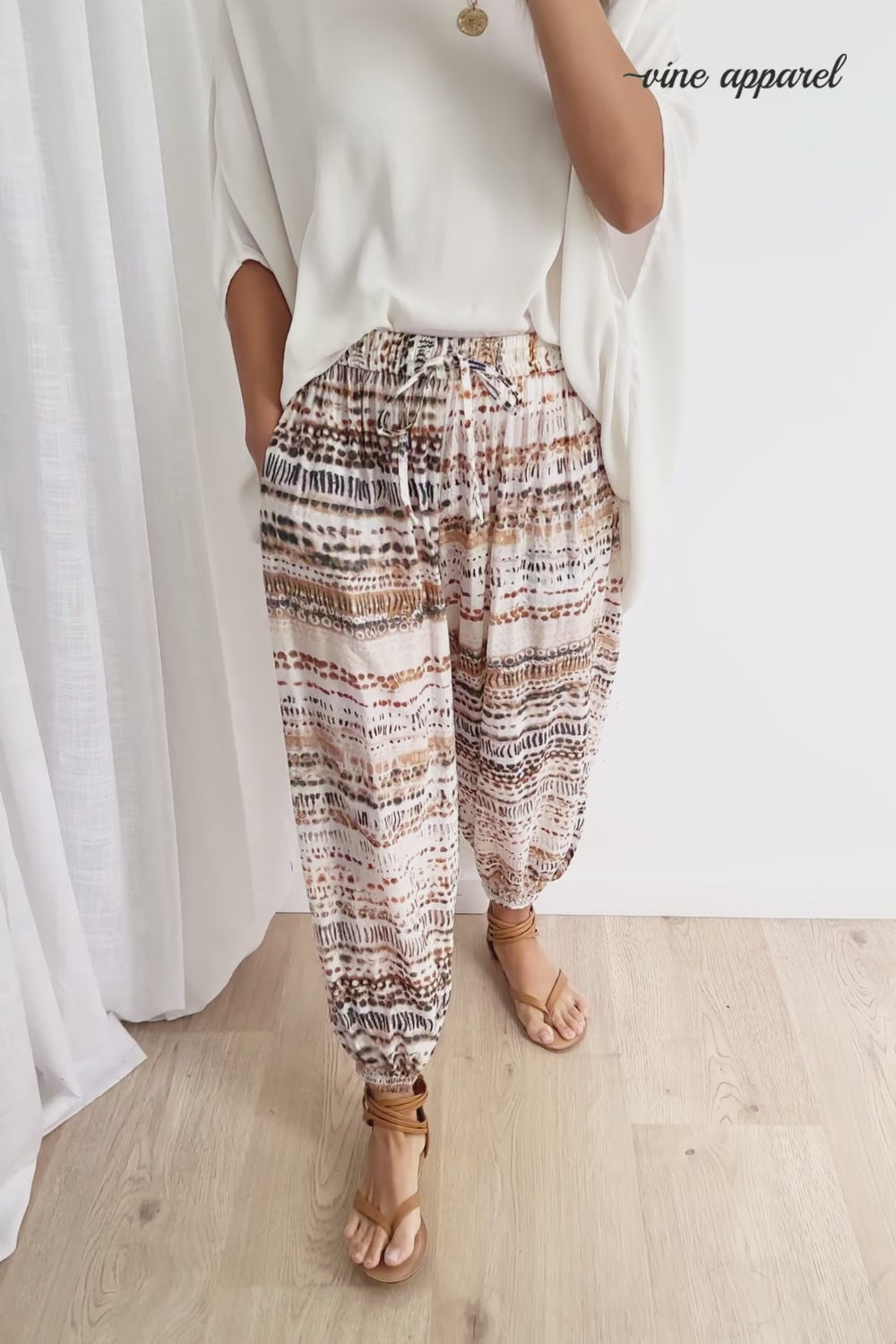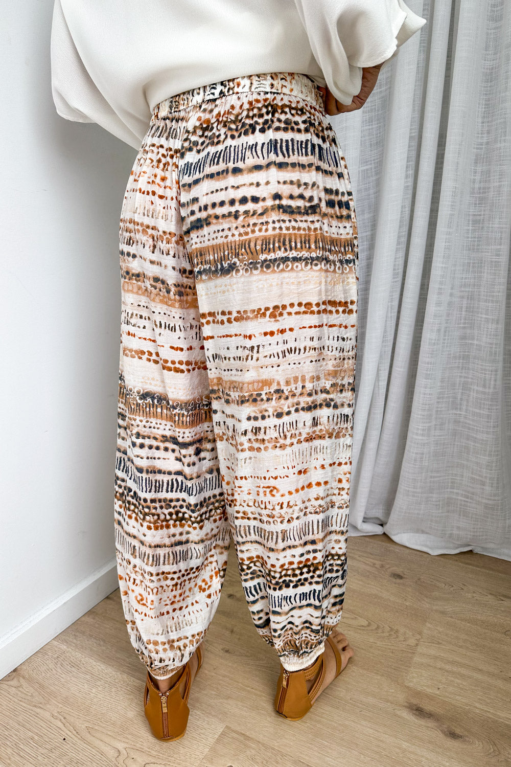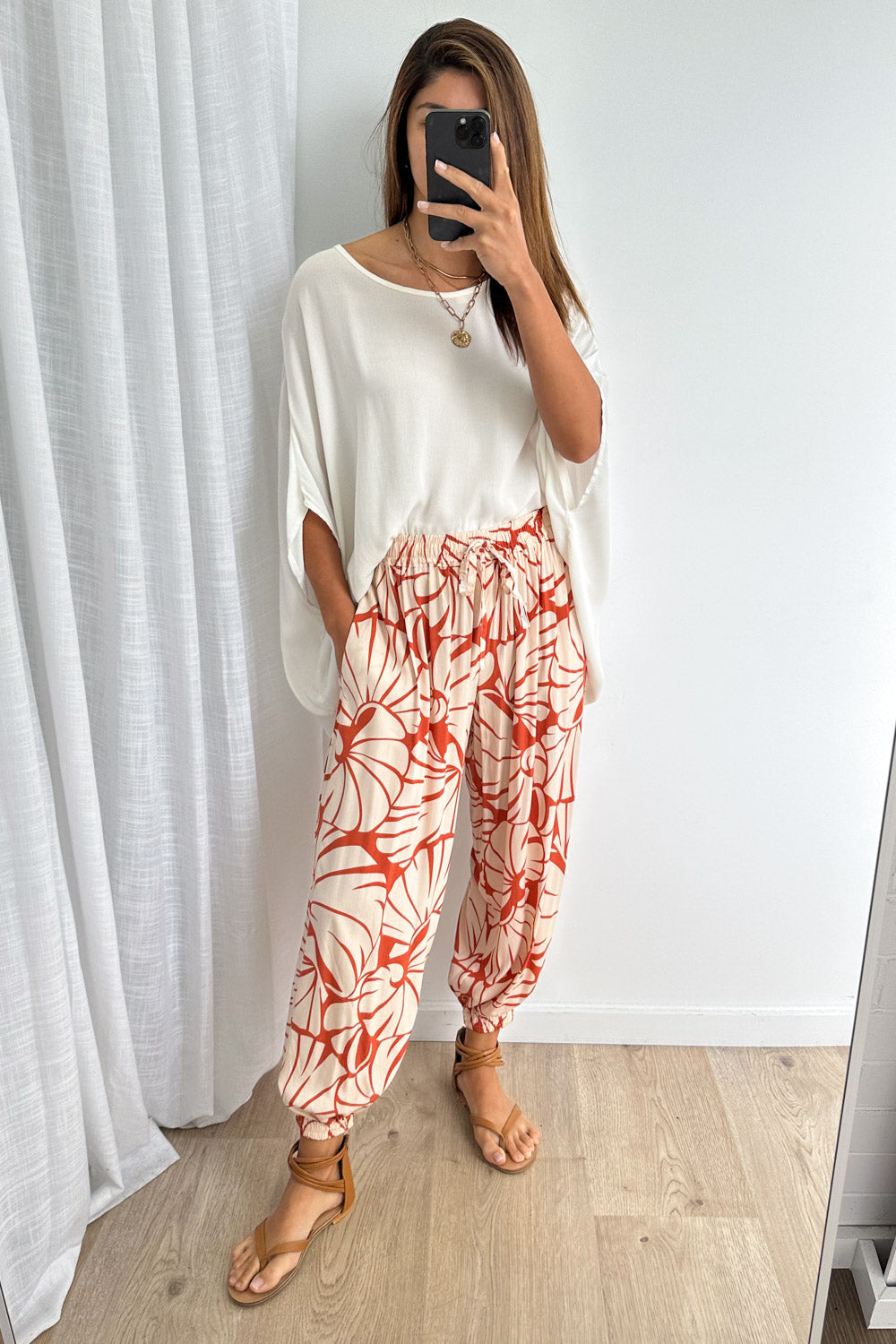 Lightweight, soft and just so nice on, these flatter all shapes and sizes, and are perfect regardless of your height. The waist is elastic, a really nice stretchy elastic, and it has a drawstring. The bottoms are cuffed, not a thick cuff but about a 2cm elastic cuff, so they can be worn long or pulled up the calf. They look AND feel good on, and they’ve got pockets of course :)