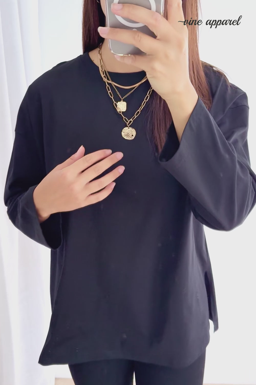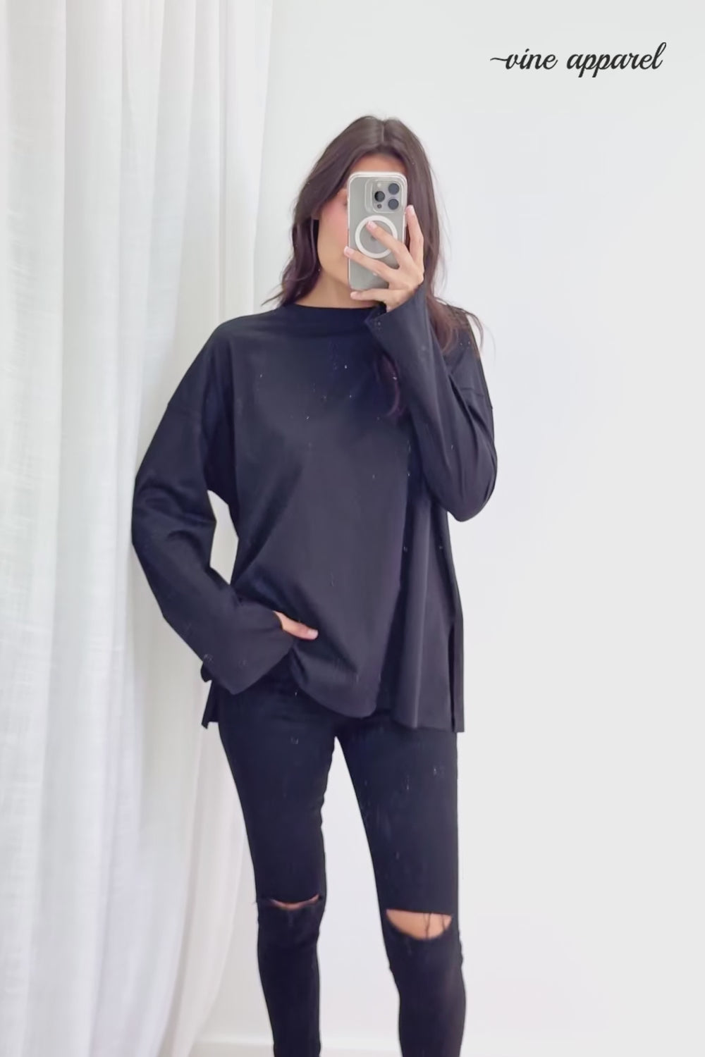 An easy basic this long sleeve is one you’ll reach for again and again. A boxy shape which is flattering, a good length, and the thumb holes add a nice detail. It layers beautifully or works perfectly on its own, easy, practical, and so good to wear.