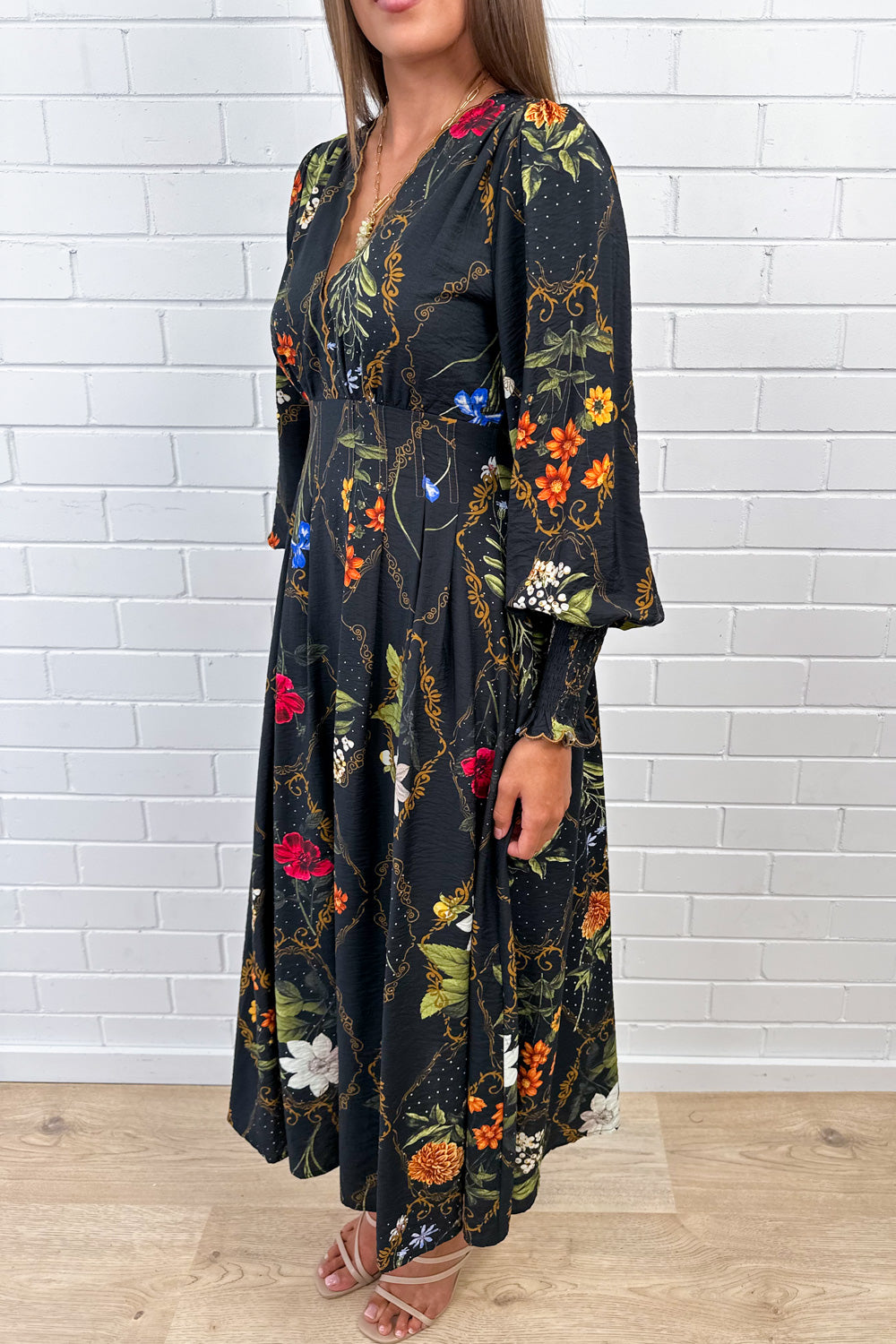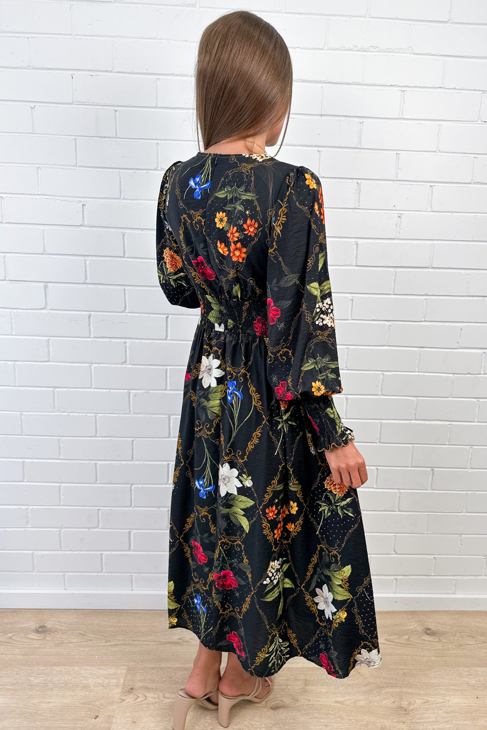 This black floral dress in this beautiful floral print is such an easy favourite. The stretchy cuffs and back waist make it super comfortable, and the scalloped V-neckline with the little hook-and-eye detail at the bust adds the prettiest touch. It’s the kind of dress that makes you feel pretty the second you put it on.