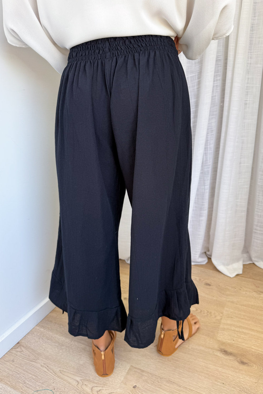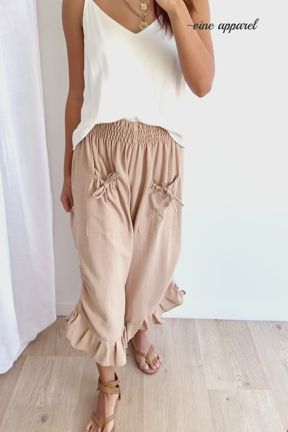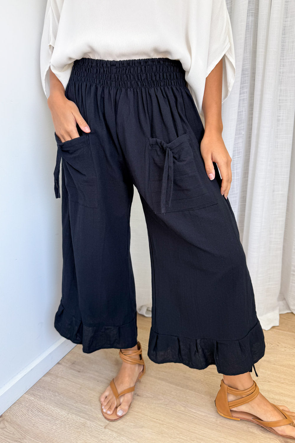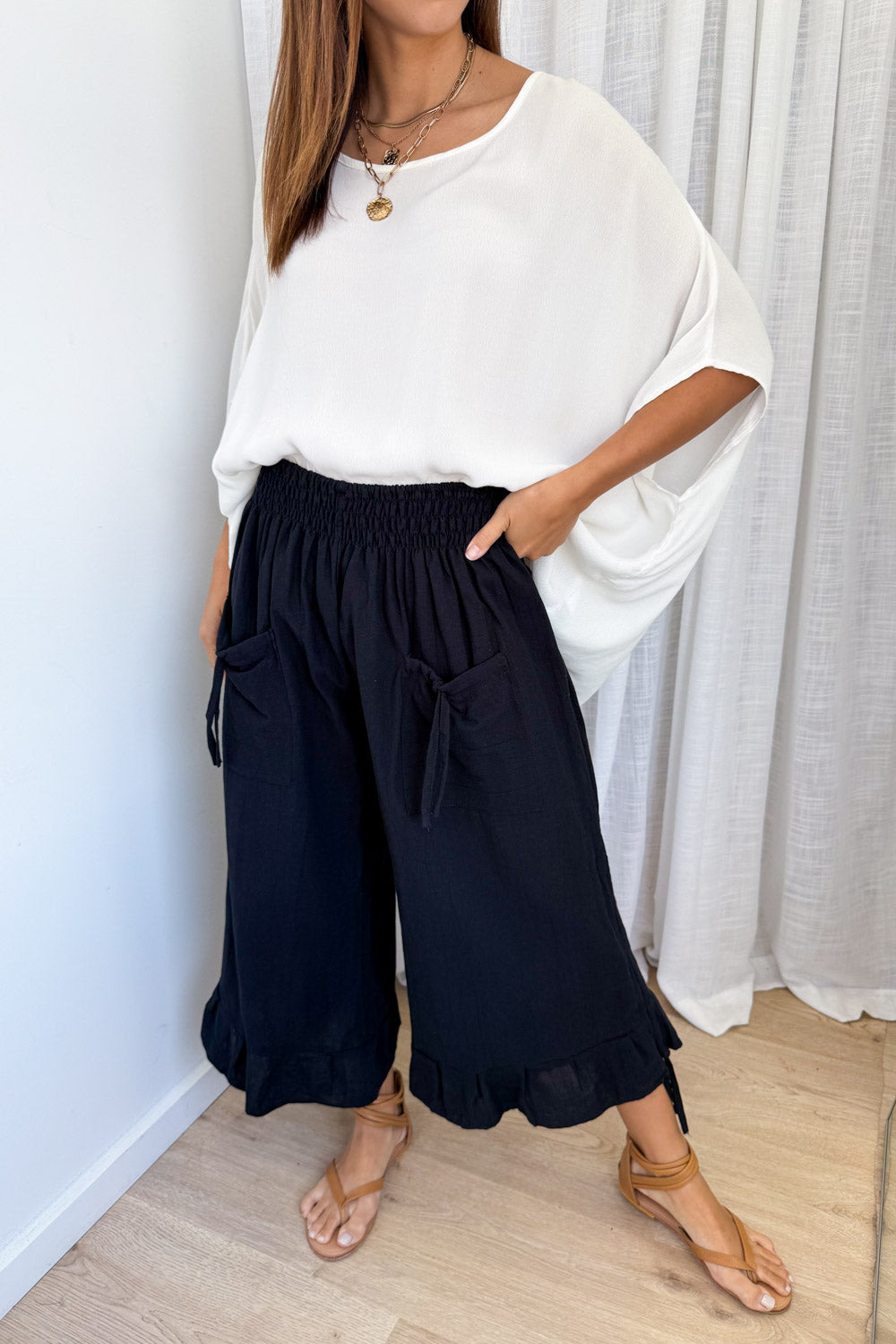 These are SO CUTE! So so cute. On the hanger, no one liked them. Then I tried them on, and one after another every person in our buying and marketing team fell head over heels in love with them. They are SO fun. An elastic waist and a drawstring on the side so you can pull them up or wear them long, pockets and the cutest frill ever, we looooove them!