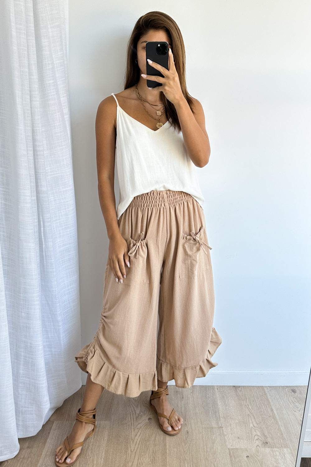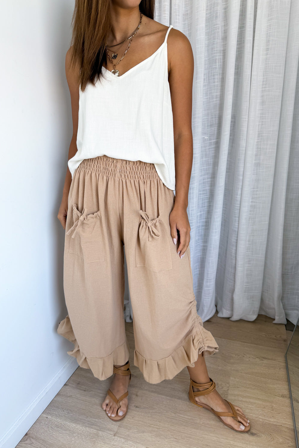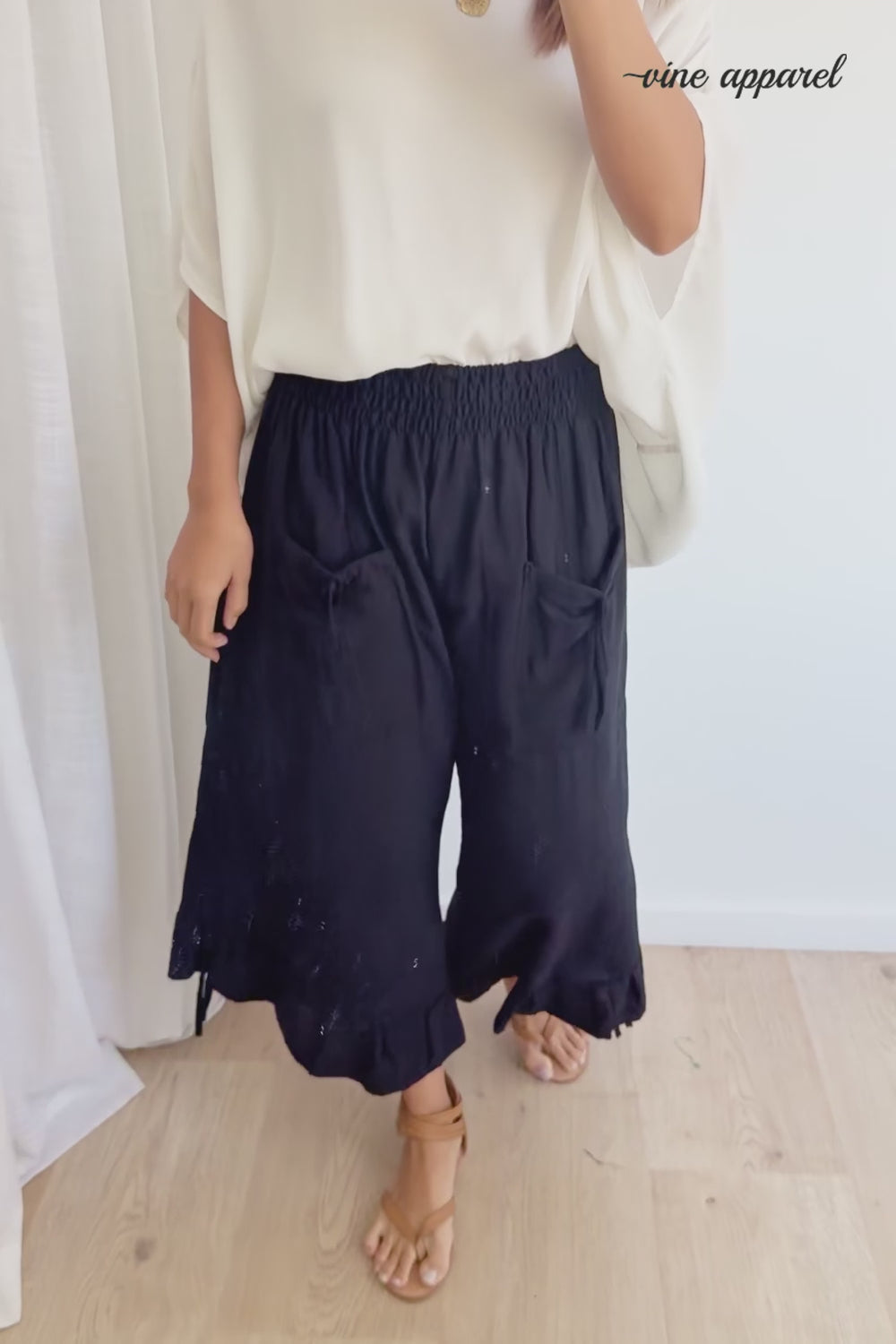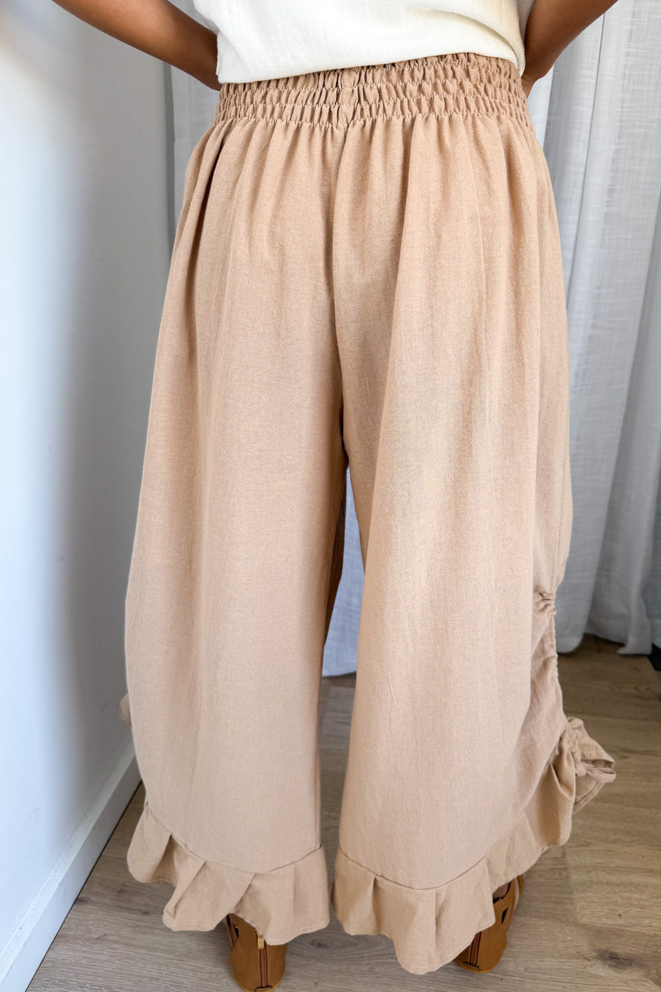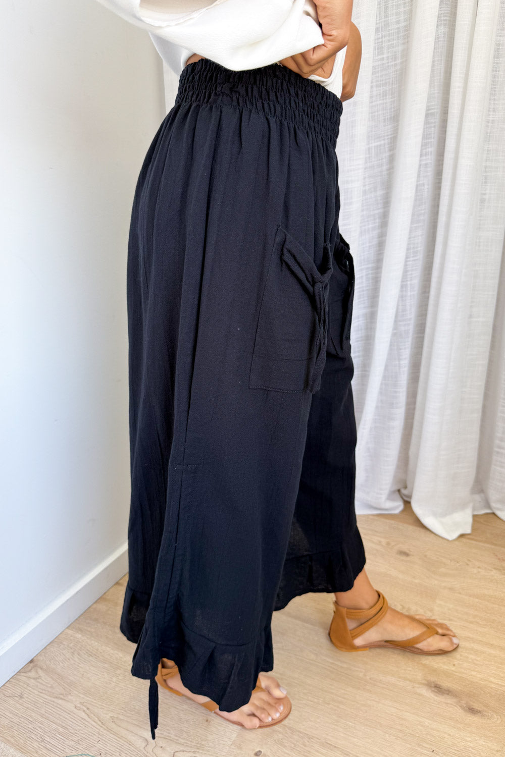 These are SO CUTE! So so cute. On the hanger, no one liked them. Then I tried them on, and one after another every person in our buying and marketing team fell head over heels in love with them. They are SO fun. An elastic waist and a drawstring on the side so you can pull them up or wear them long, pockets and the cutest frill ever, we looooove them!