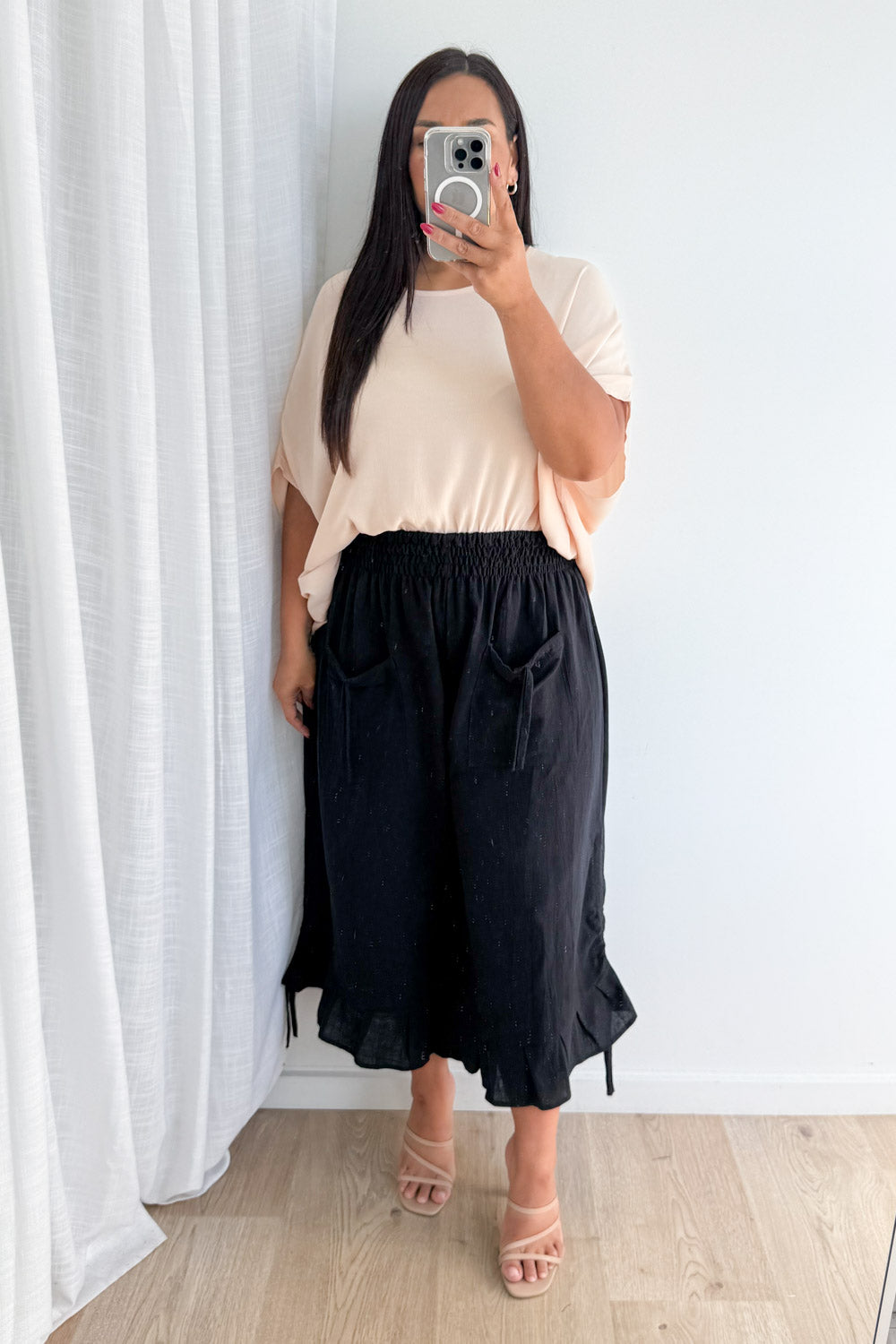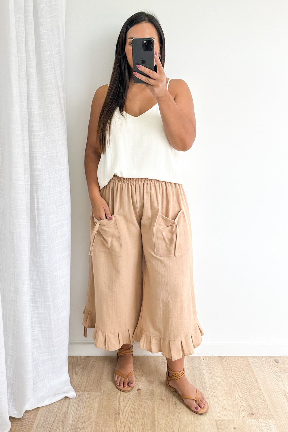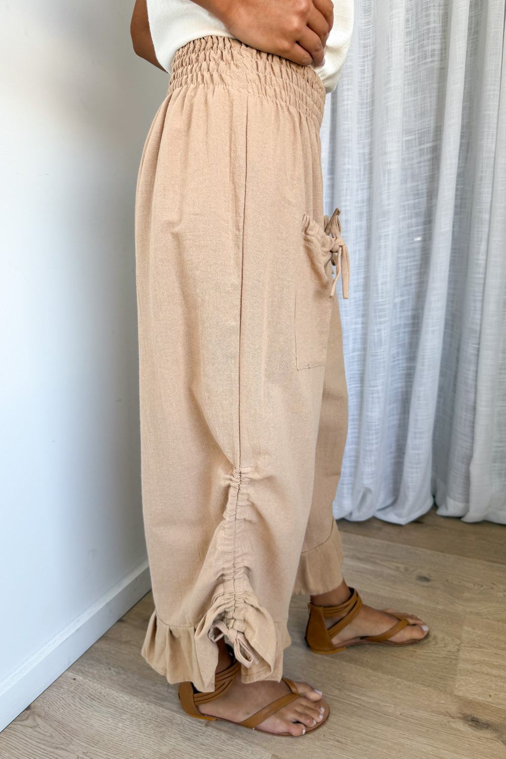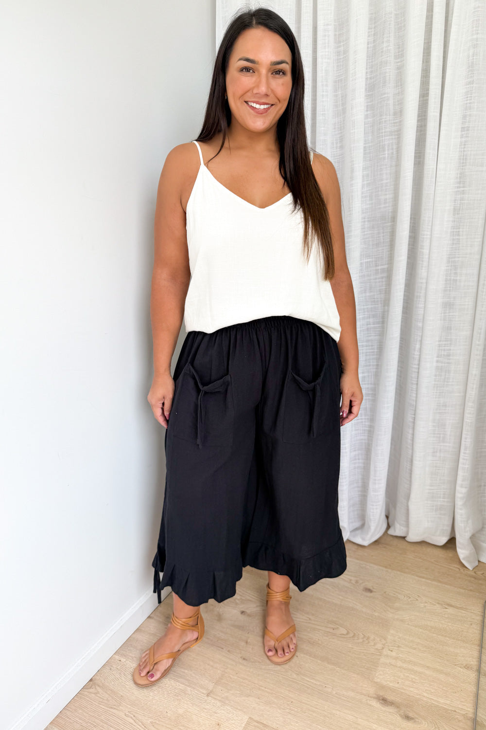 These are SO CUTE! So so cute. On the hanger, no one liked them. Then I tried them on, and one after another every person in our buying and marketing team fell head over heels in love with them. They are SO fun. An elastic waist and a drawstring on the side so you can pull them up or wear them long, pockets and the cutest frill ever, we looooove them!