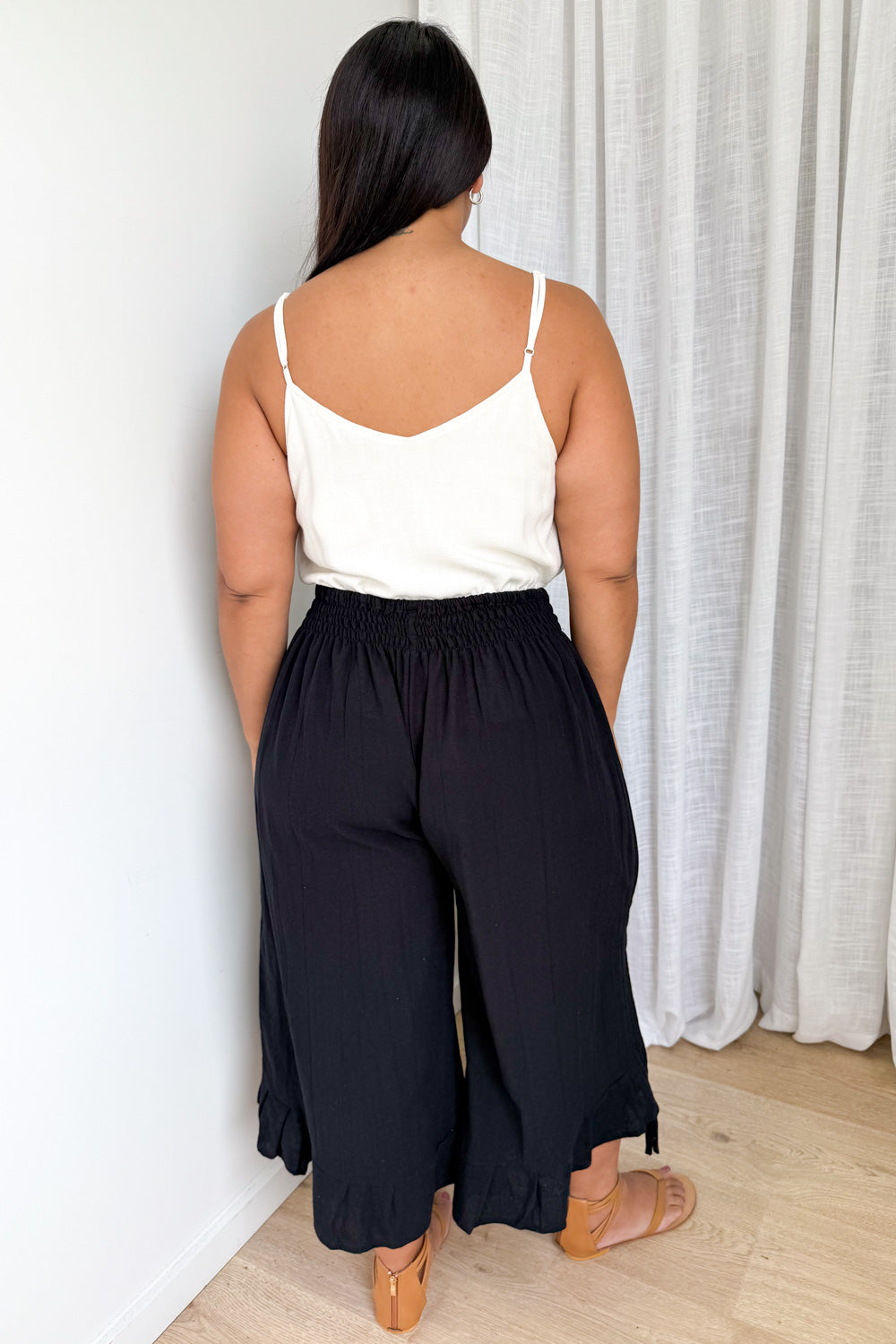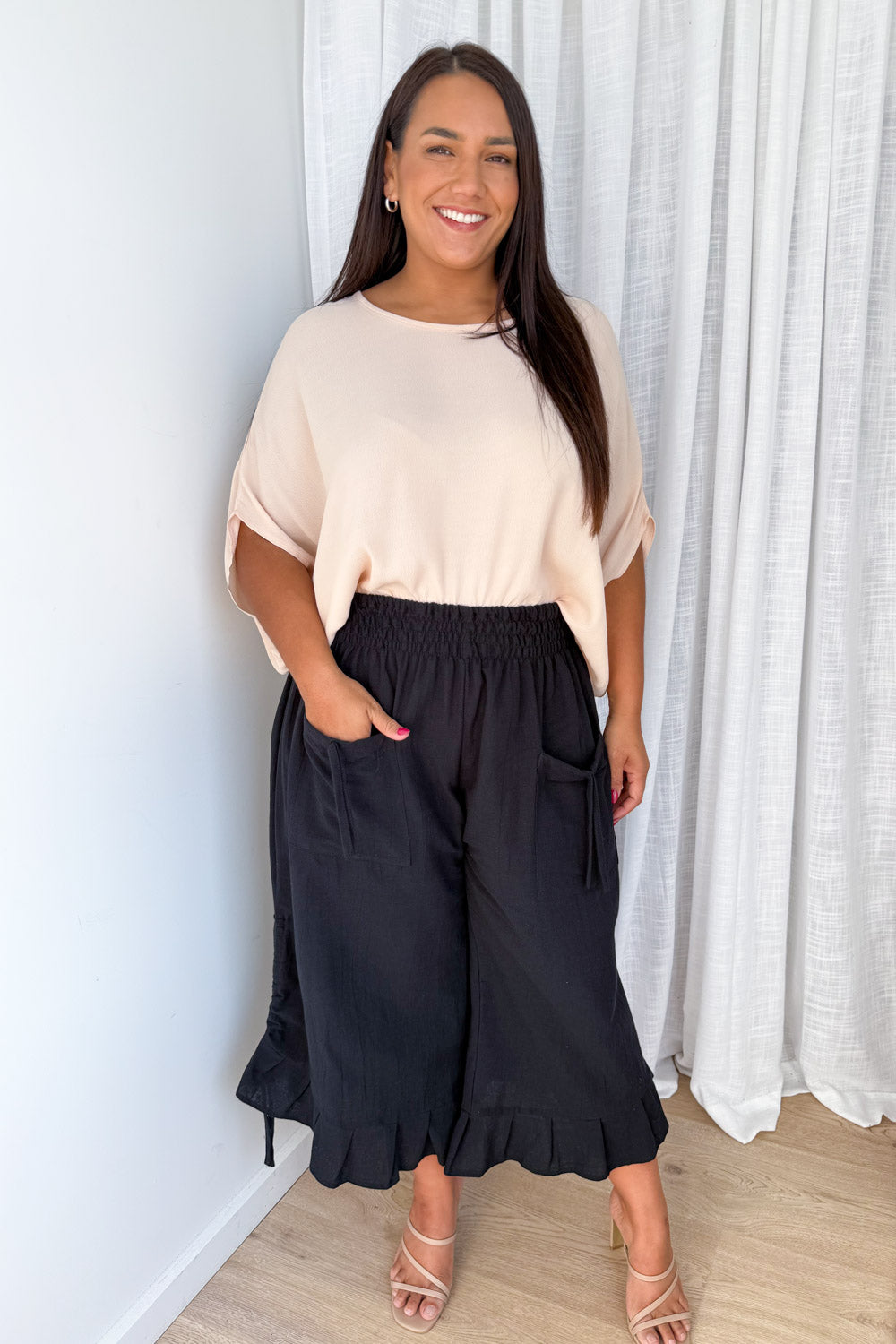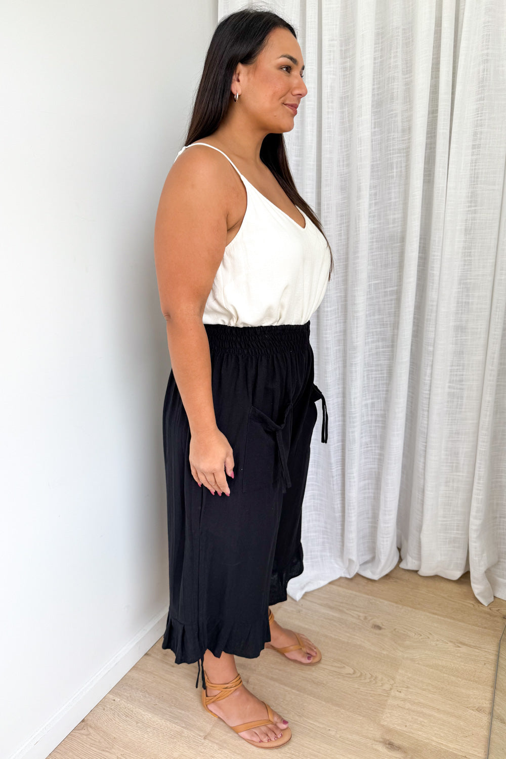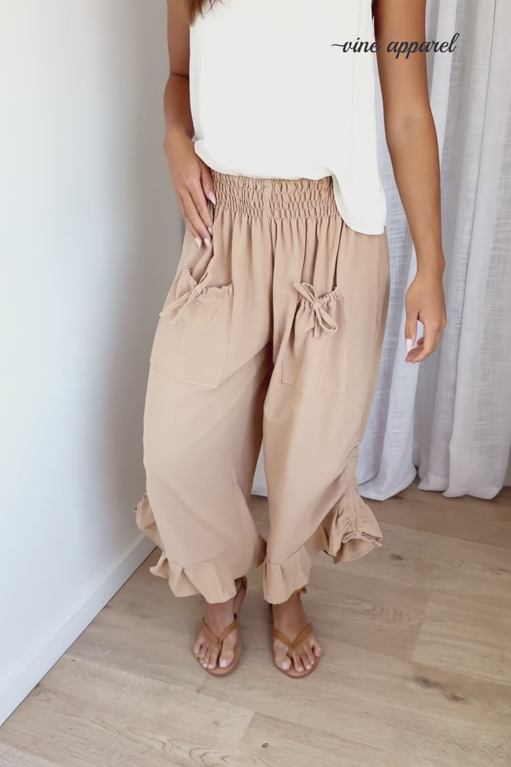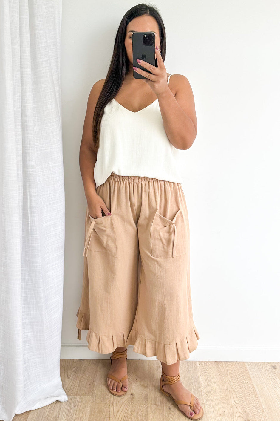 These are SO CUTE! So so cute. On the hanger, no one liked them. Then I tried them on, and one after another every person in our buying and marketing team fell head over heels in love with them. They are SO fun. An elastic waist and a drawstring on the side so you can pull them up or wear them long, pockets and the cutest frill ever, we looooove them!