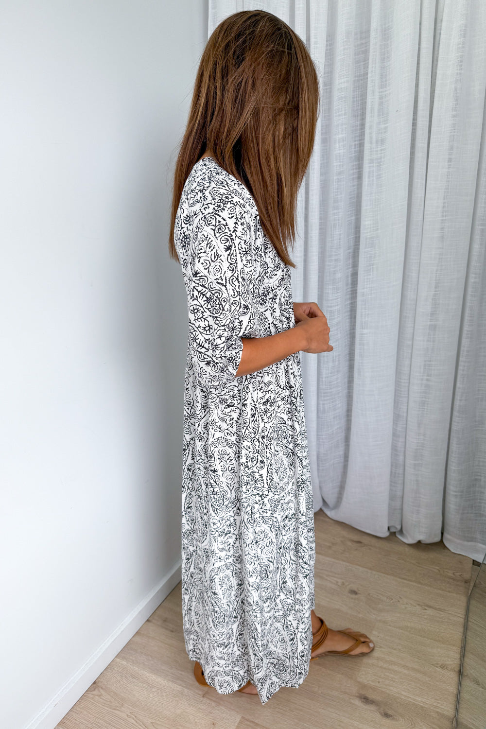 This dress is just so beautiful, we love the fit at the top, then how it drapes into beautiful looseness. Really comfy and such a pretty, flattering, loose style – and the fabric is light so will be gorgeous even on hot days.