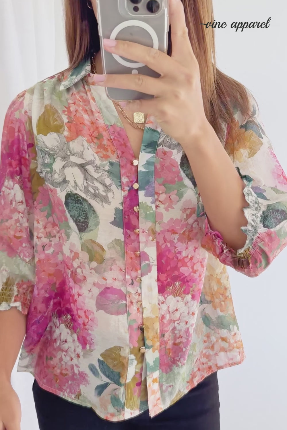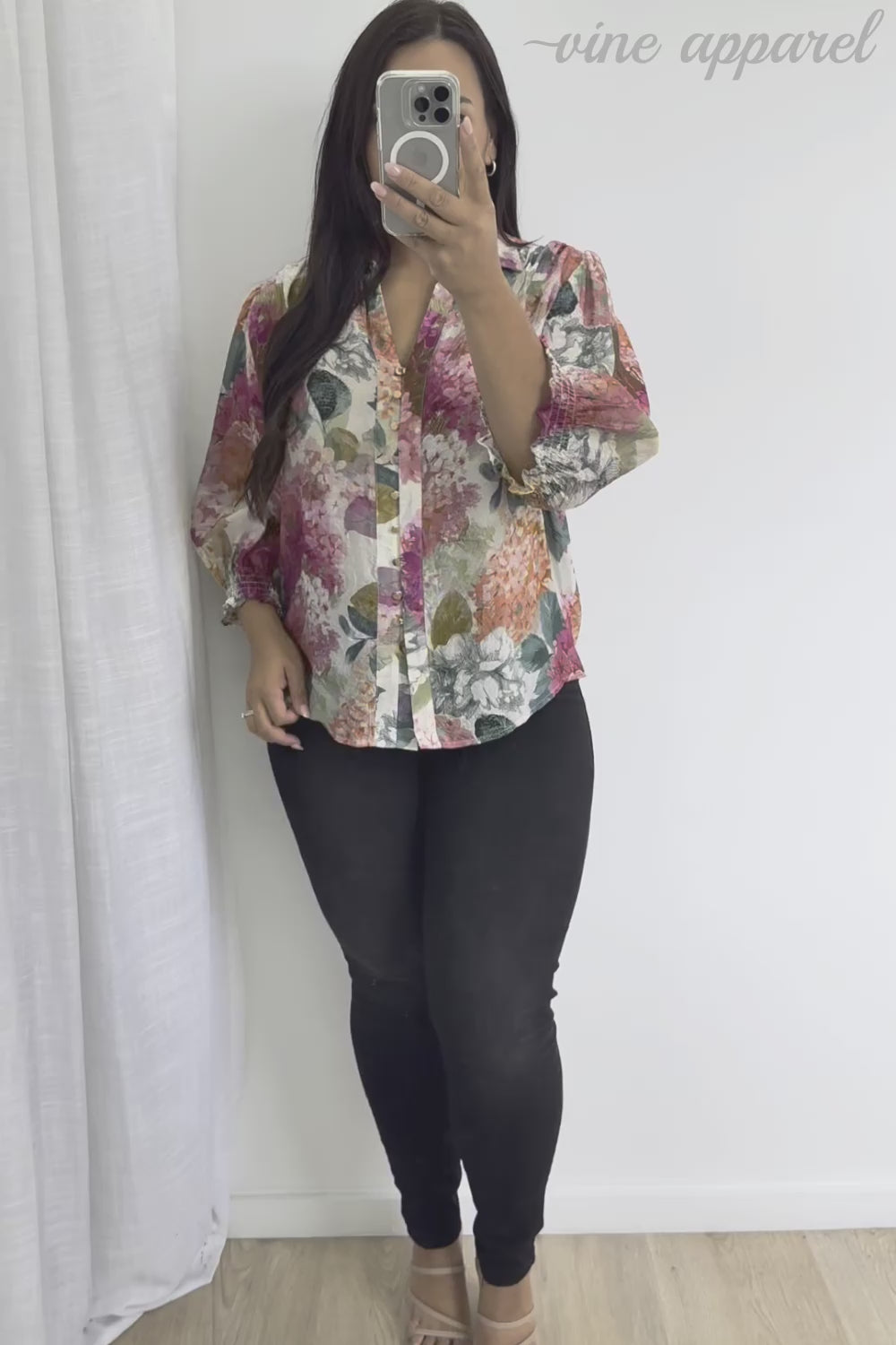 Soft and drapey with lovely feature buttons, the sleeve is half length with elastic at the cuff. Lovely for work, weekends, and everything in between.