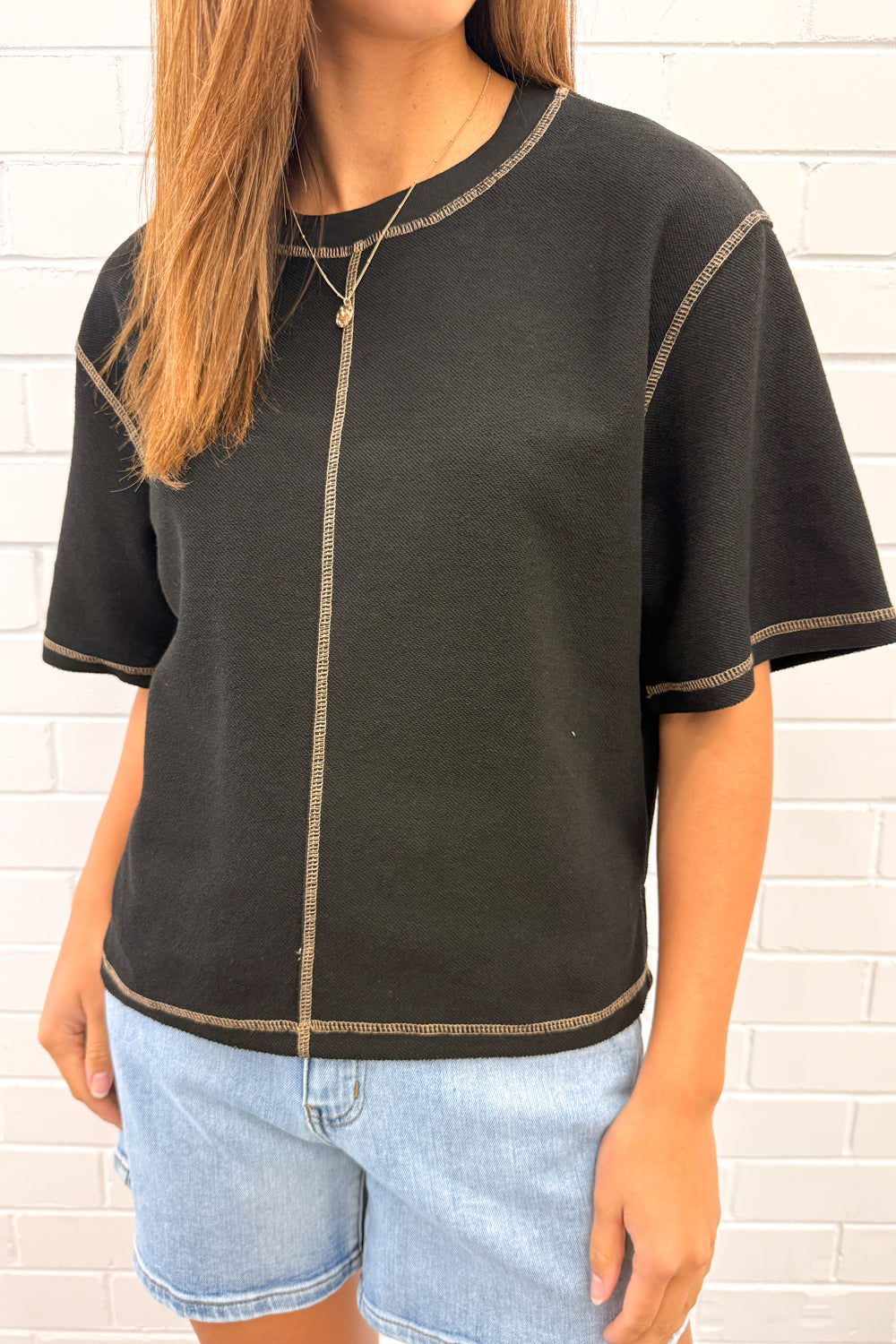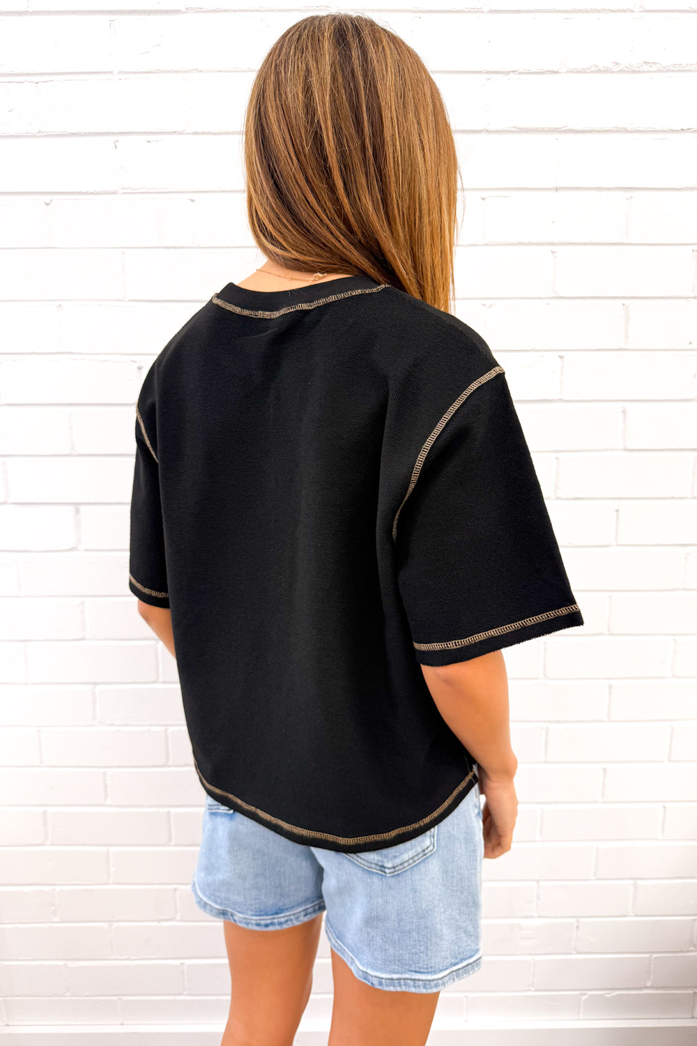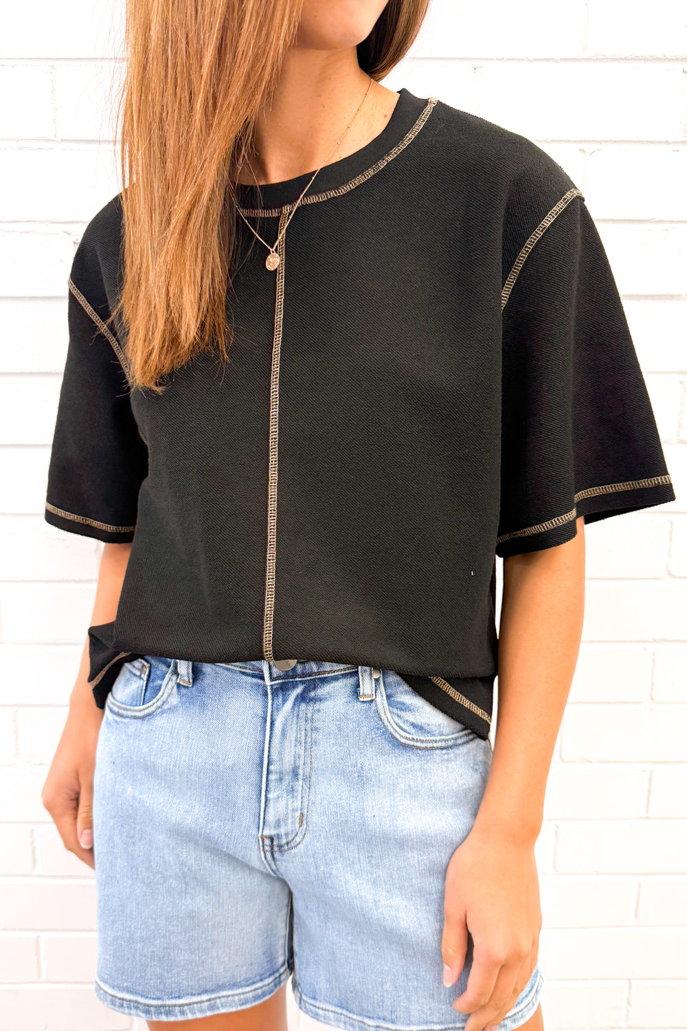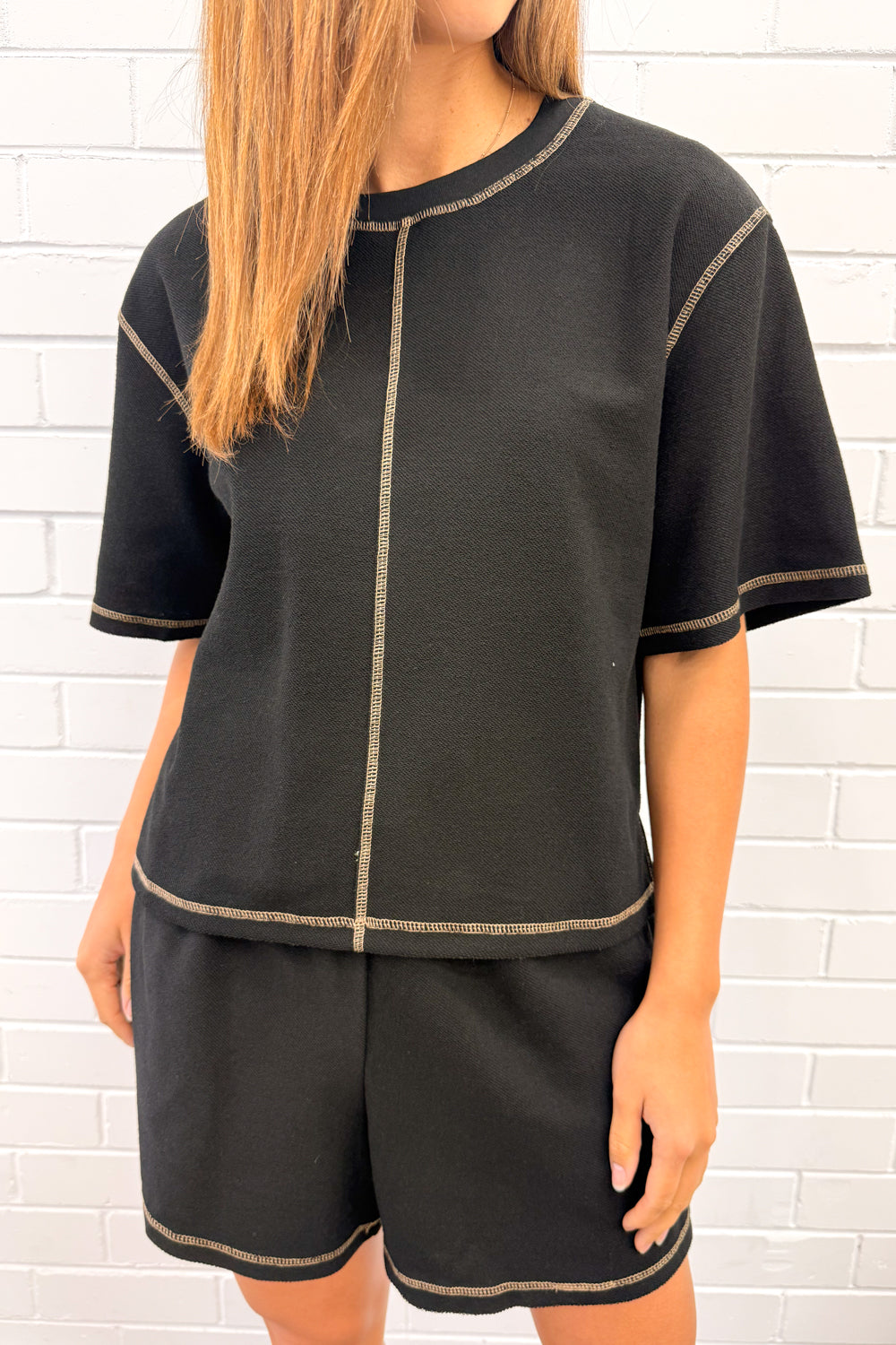 A thicker knit basic tee with contrasting embroidery, the shape is good, the length is good, and it can be dressed up or worn casually. We also have matching shorts if you happen to like sets :)