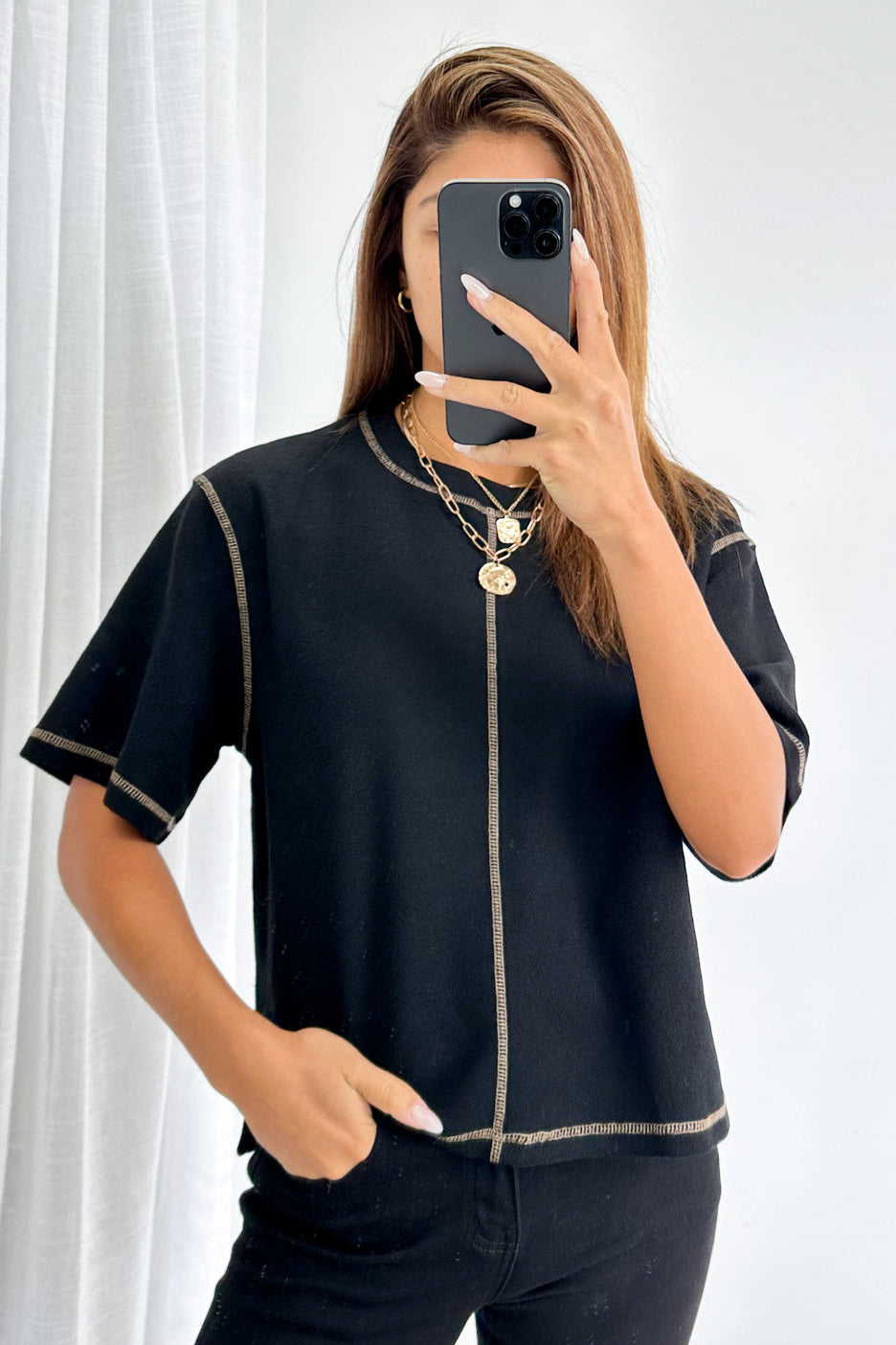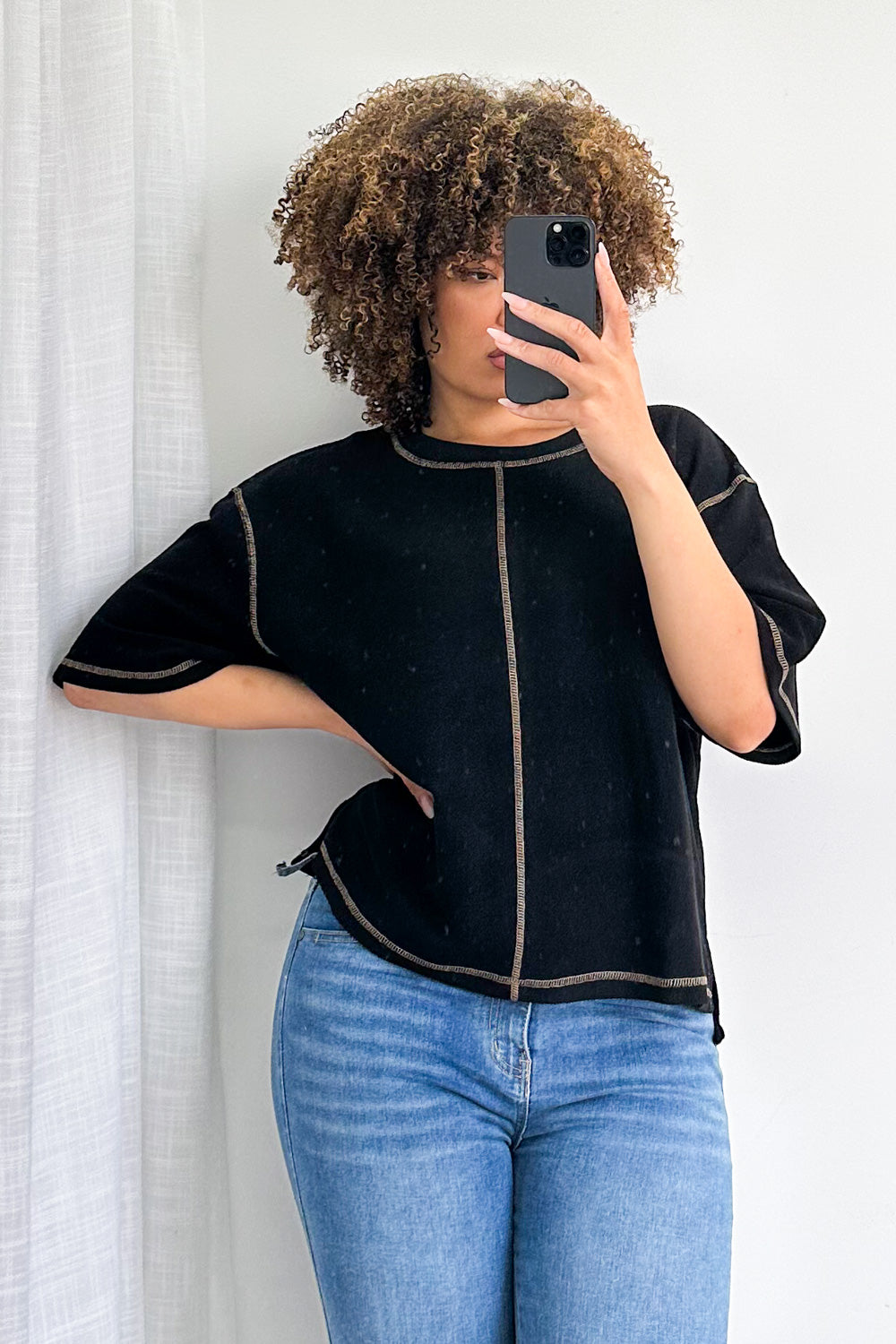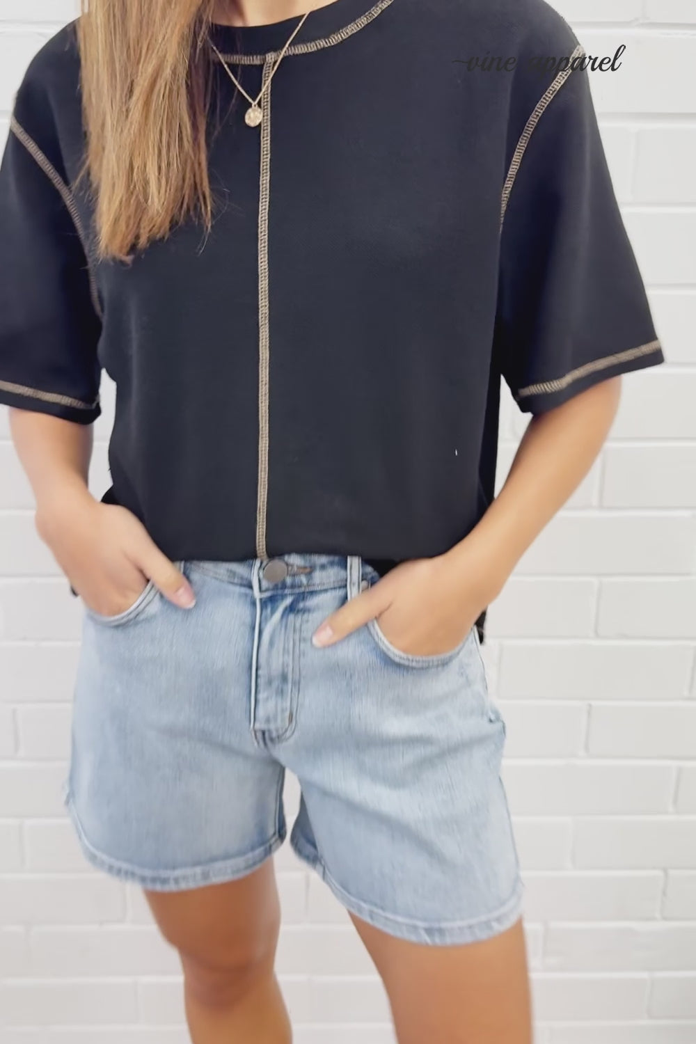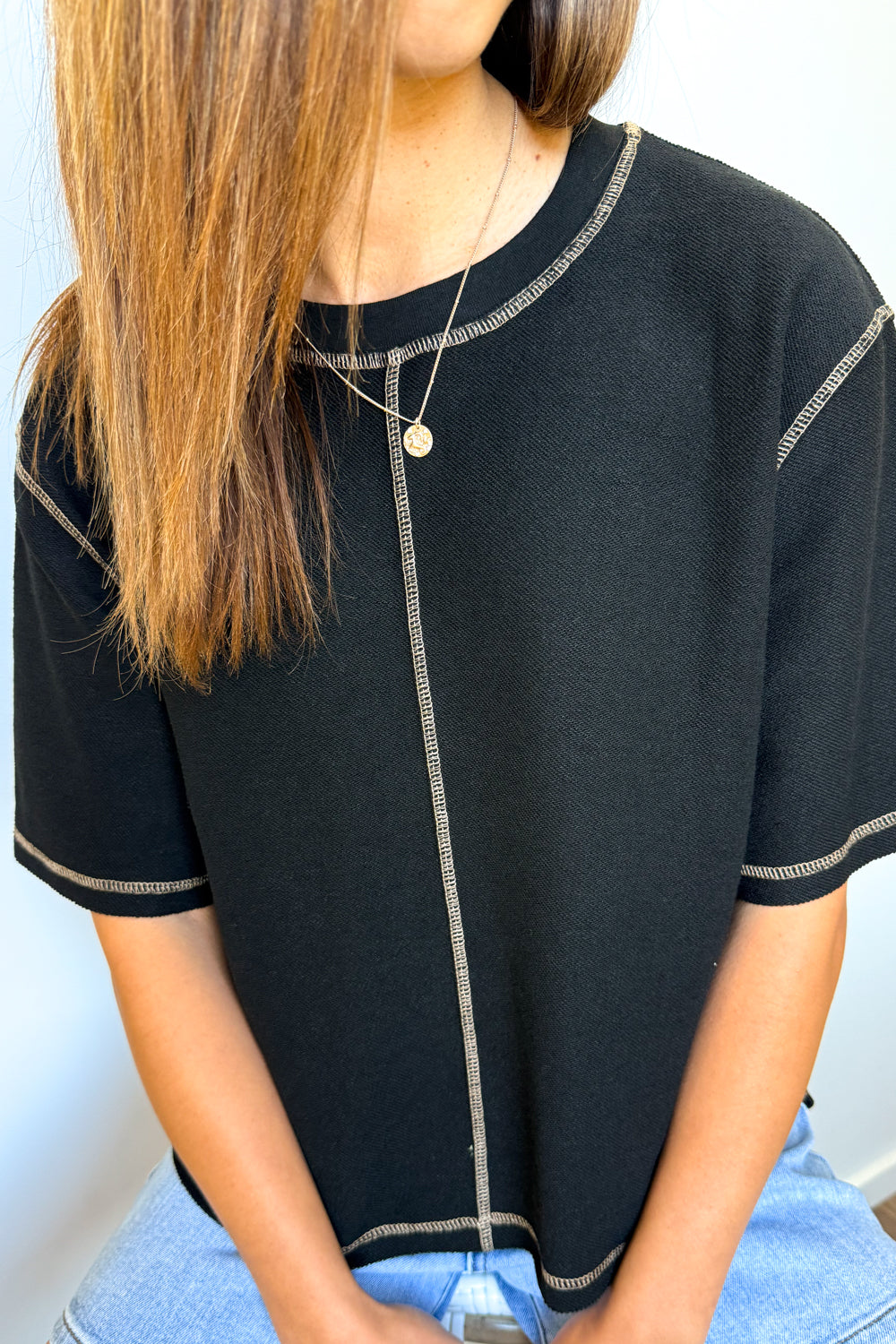 A thicker knit basic tee with contrasting embroidery, the shape is good, the length is good, and it can be dressed up or worn casually. We also have matching shorts if you happen to like sets :)