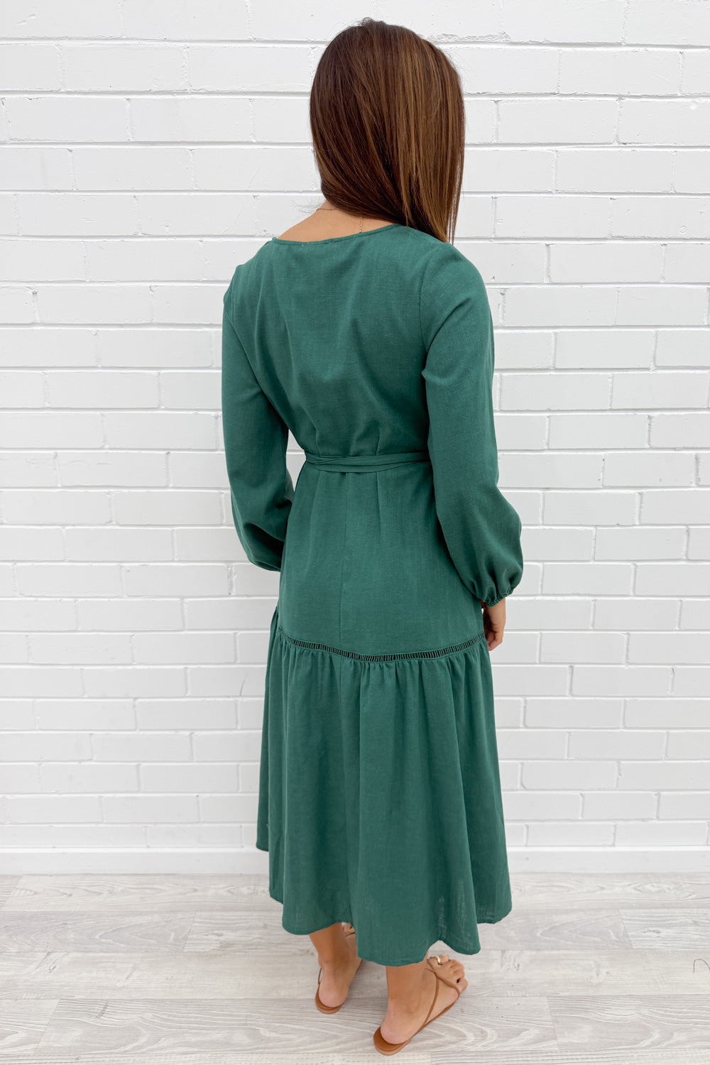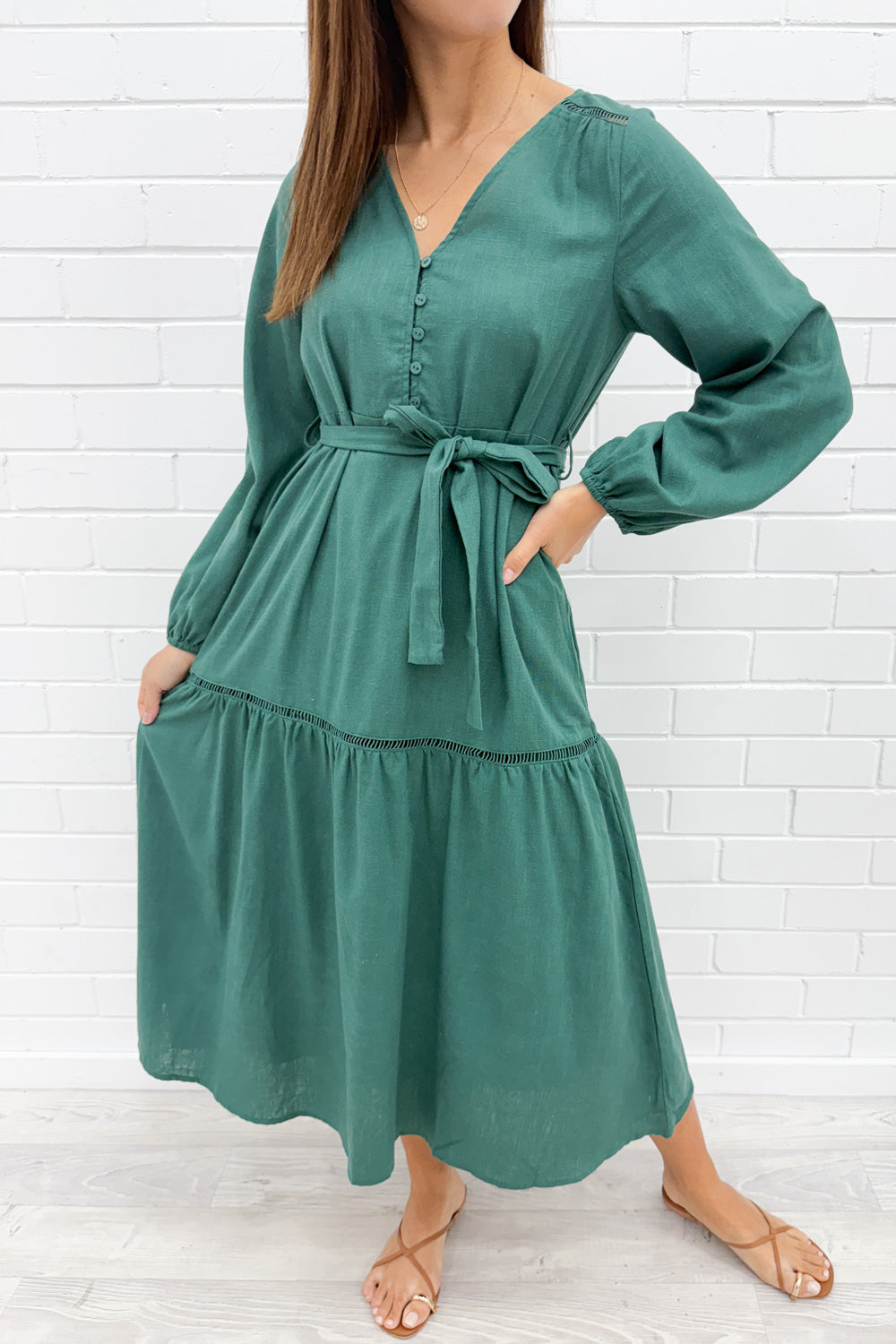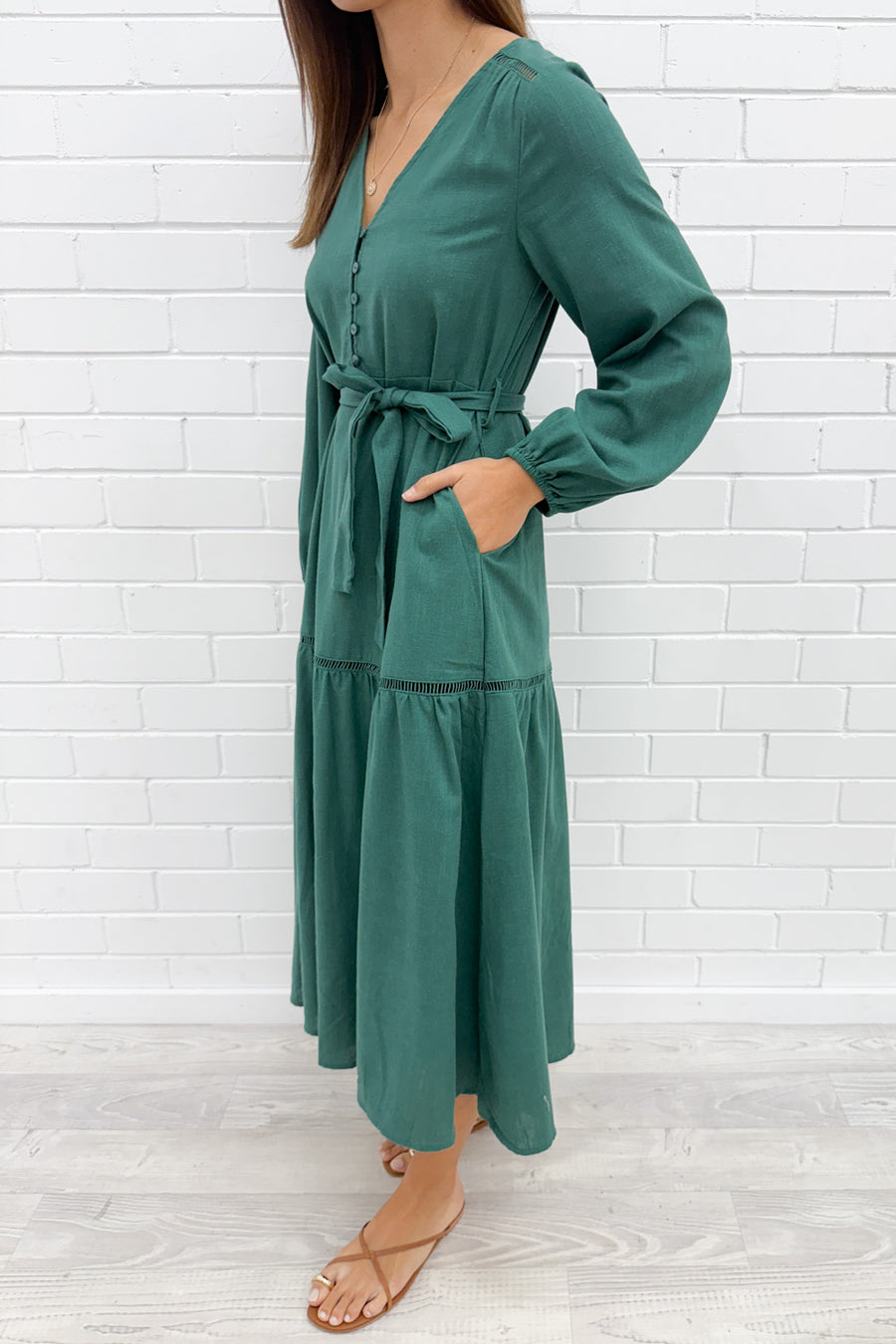 This dress feels effortless, yet delivers a beautiful balance of relaxed yet refined. Drop waist silhouette and a V neck, all of which flatters. Stretchy cuffs and functional buttons at the bust provide just the right amount of detail — perfect for dressing up or down any day of the week.