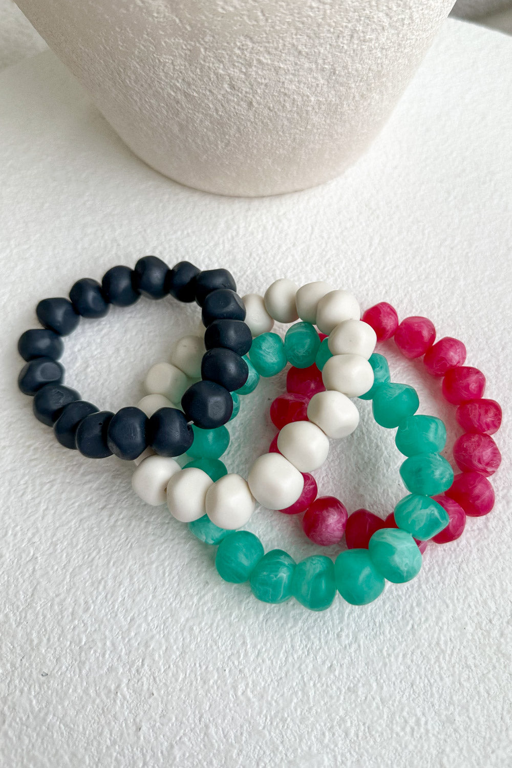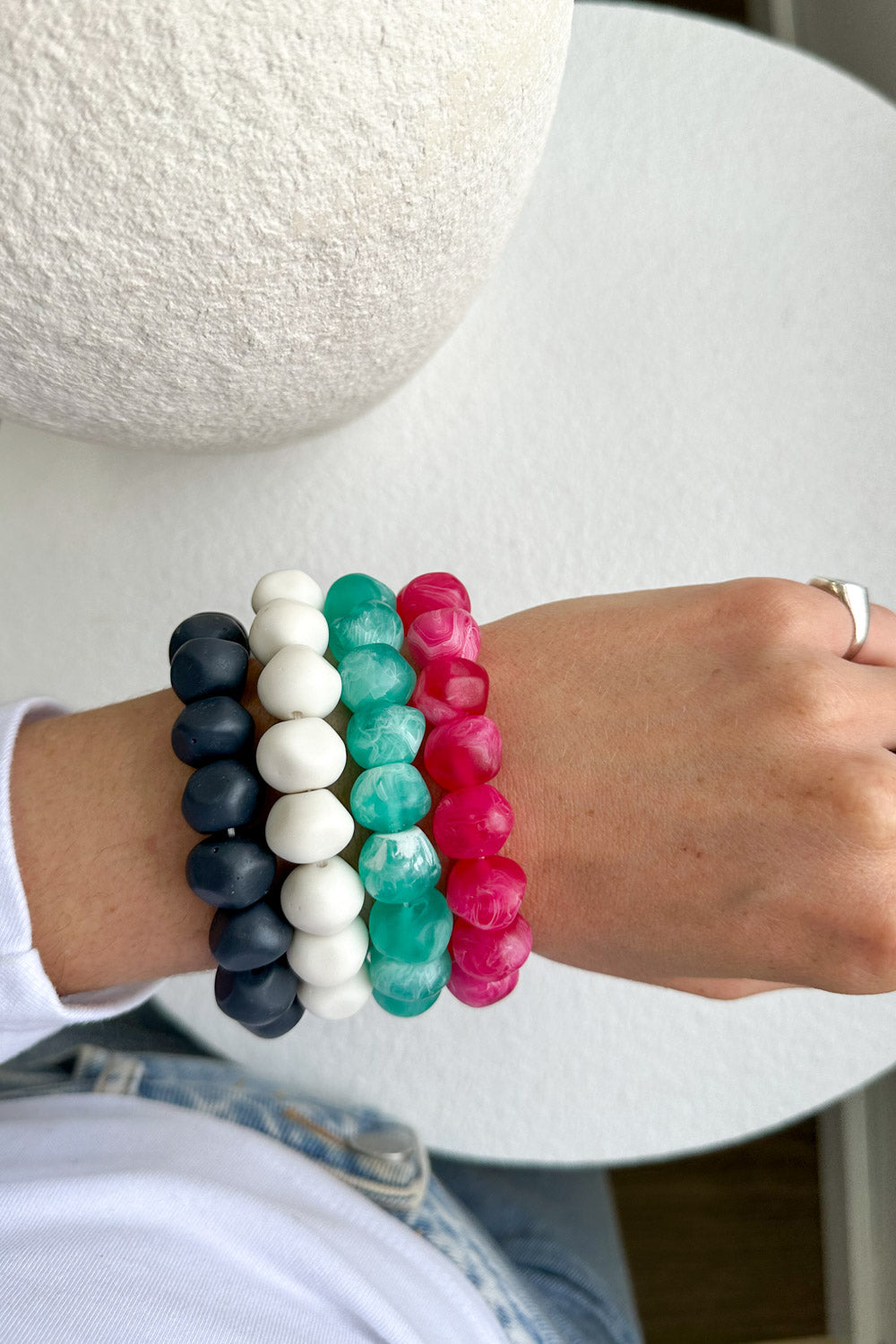 A beautiful, simple bracelet made of resin beads on a stretchy band. Looks lovely on its own, or stack it with other colours to change it up.