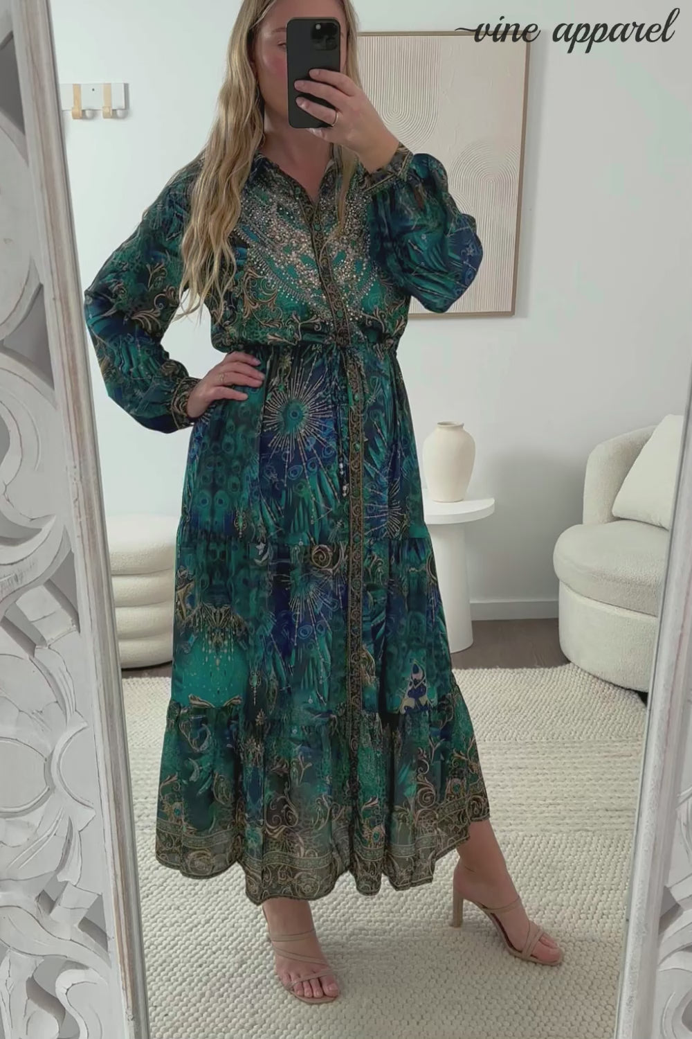 A really simple shape in a beautiful print with diamontes, there’s nothing not to love here. The shape just drops, the buttons are functional all the way down, and it features a drawstring under the bust so you can wear it loose or pull it in to add shape.
