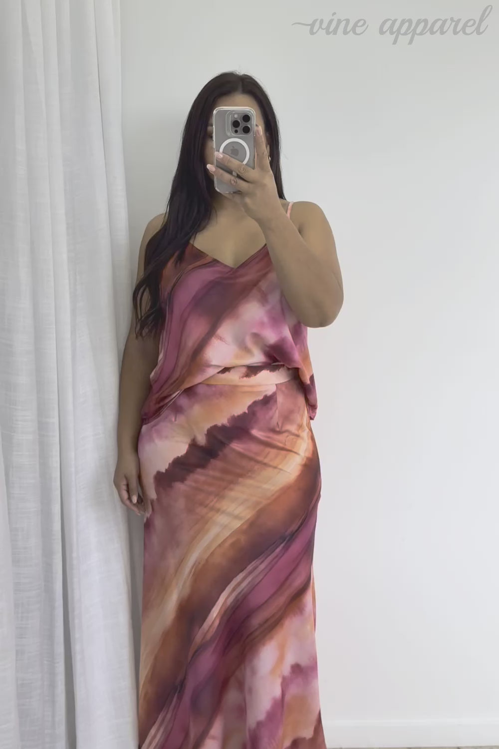A printed kind of version of our Kellie Cami, which is just a really good basic. A good length, loose but not super baggy, has adjustable straps, and comes a fabulous sunset print – win!