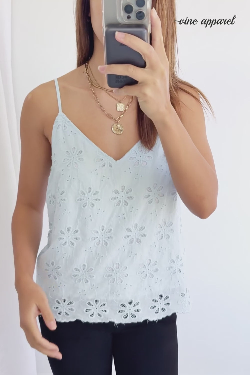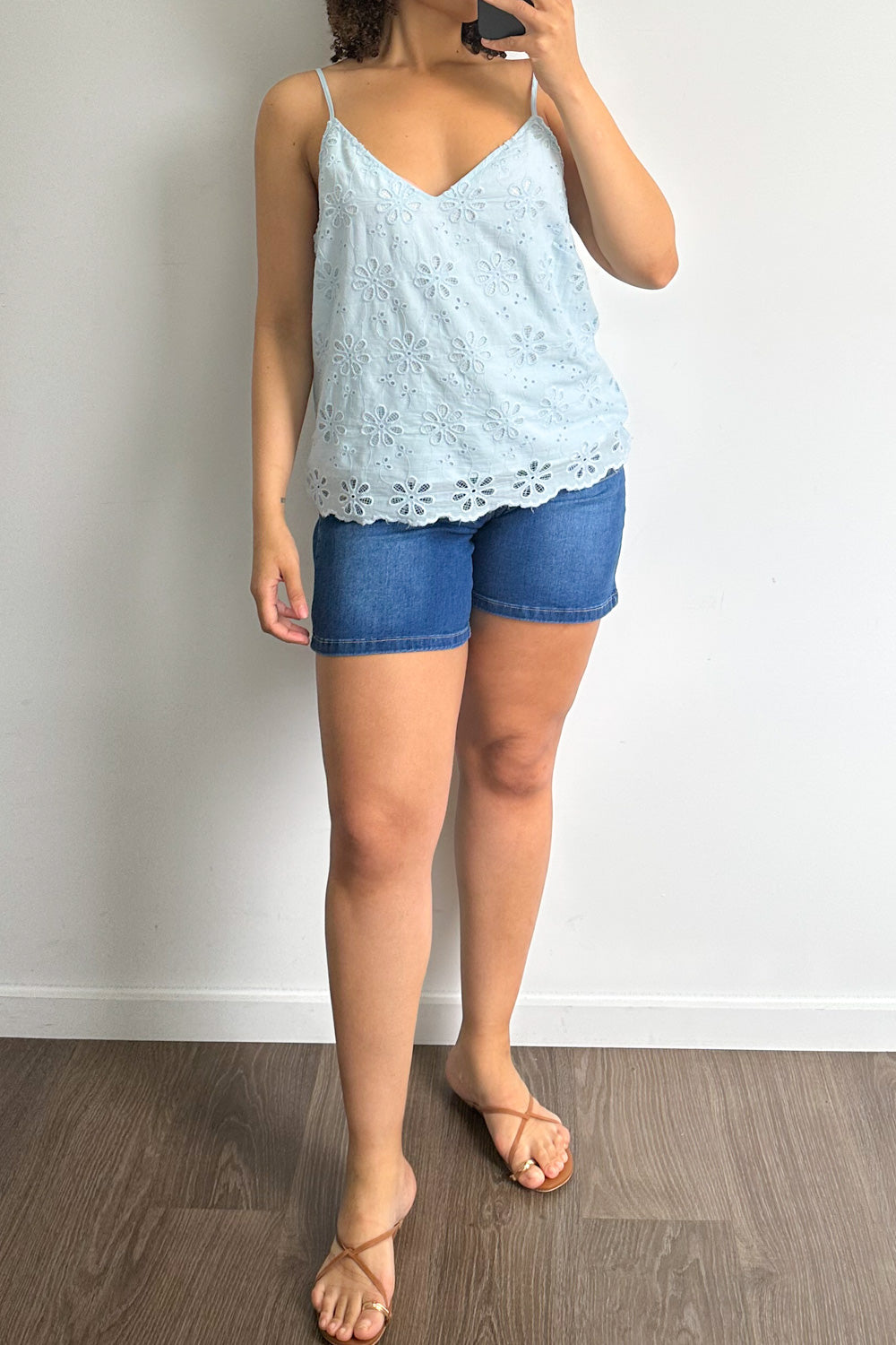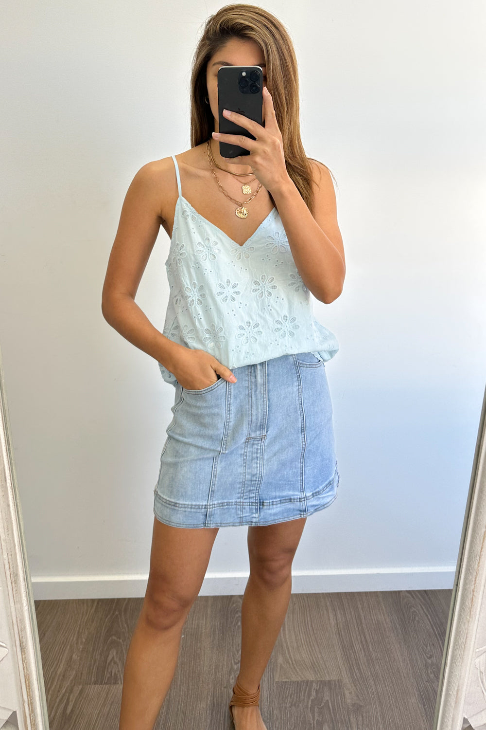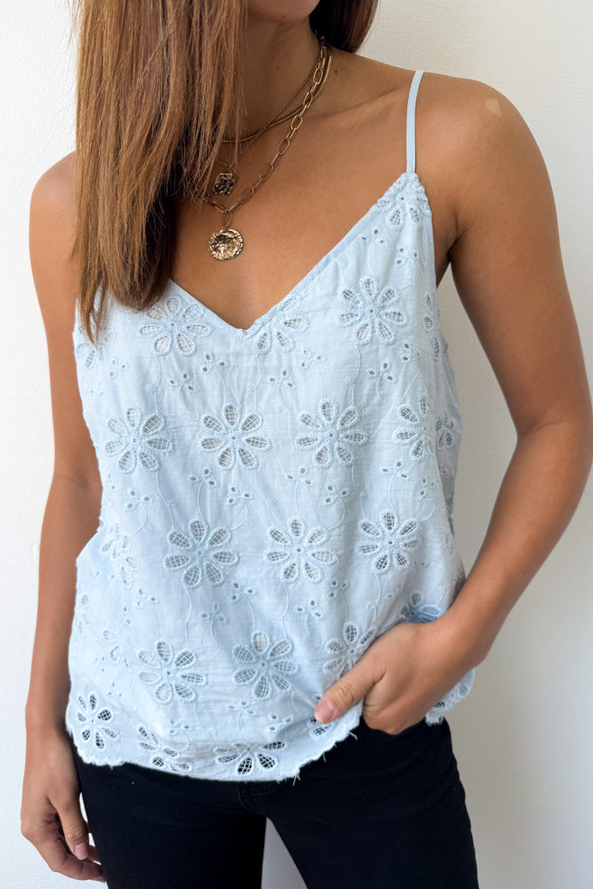 A lace kind of version of our Kellie Cami in Sky Blue, which is just a really good basic. A good length, loose but not super baggy, has adjustable straps, and comes in fabulous colours – win!