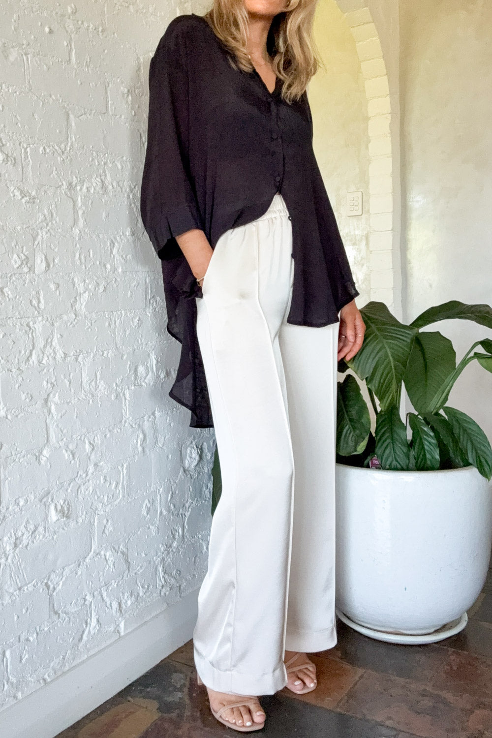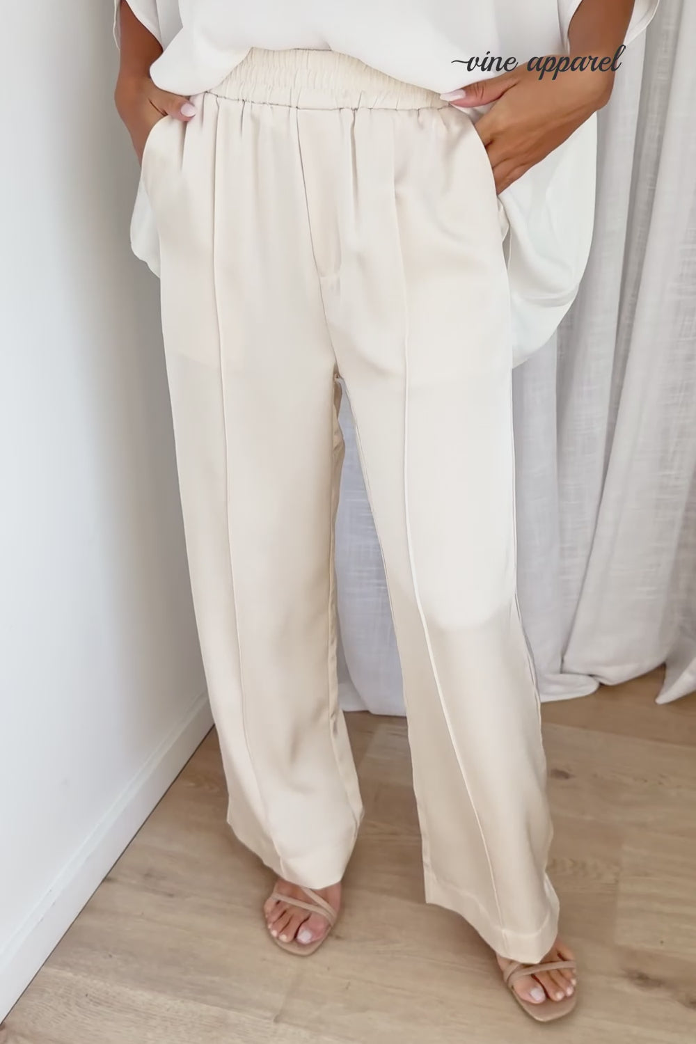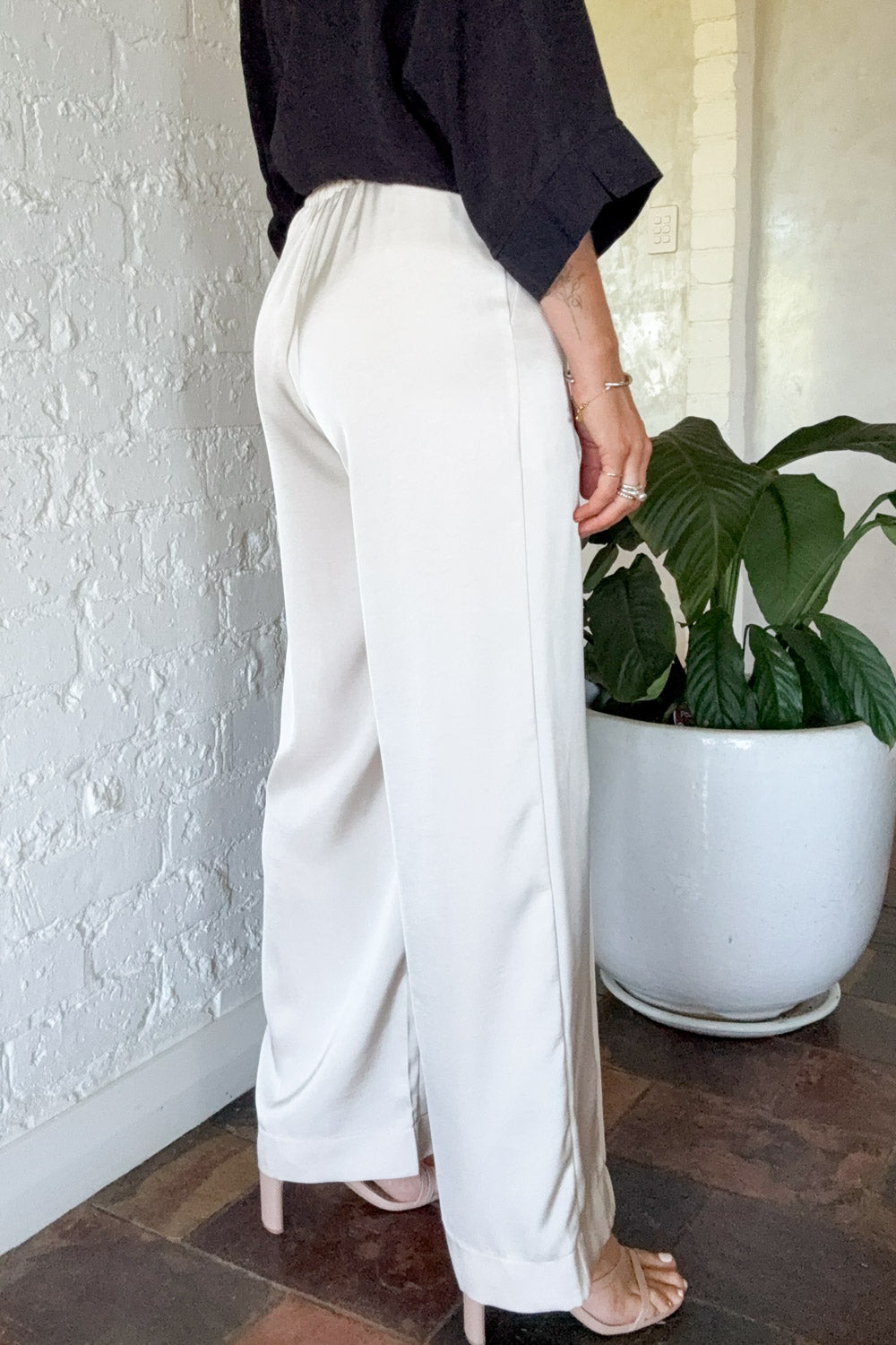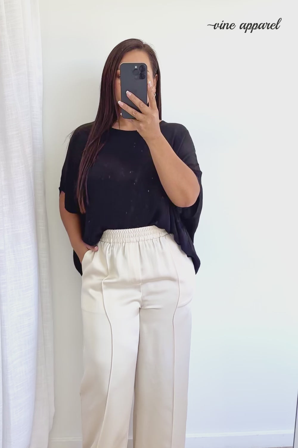 Loose, light and lovely, they have a silky feel, and the shape is super flattering. Featuring an elastic waistband, pockets and the champagne colour is STUNNING. They're dressy but comfy and amazing.