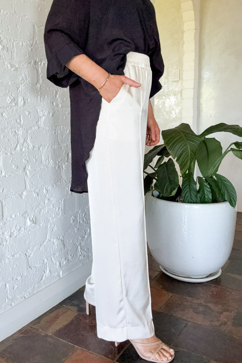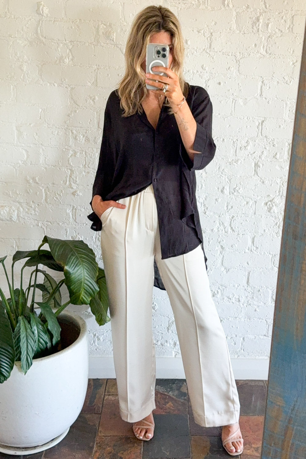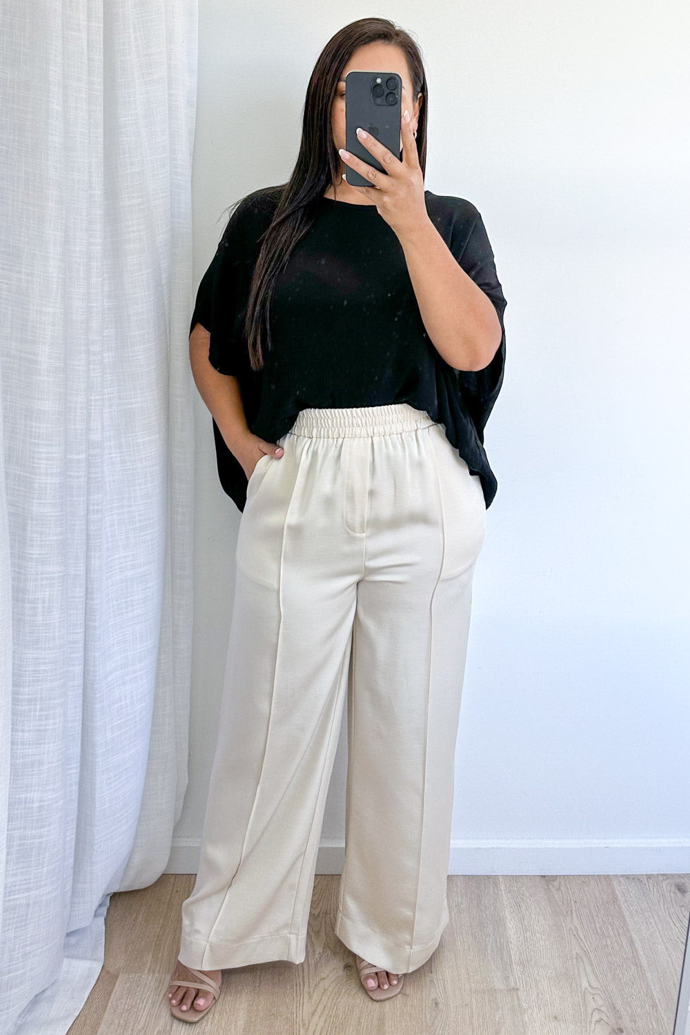 Loose, light and lovely, they have a silky feel, and the shape is super flattering. Featuring an elastic waistband, pockets and the champagne colour is STUNNING. They're dressy but comfy and amazing.