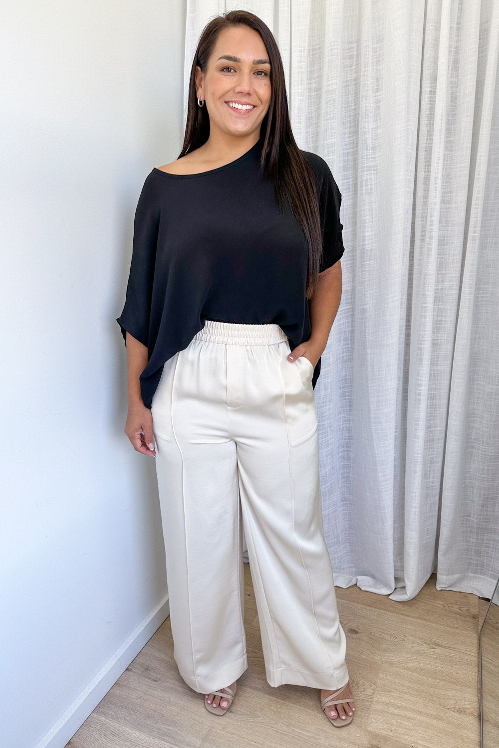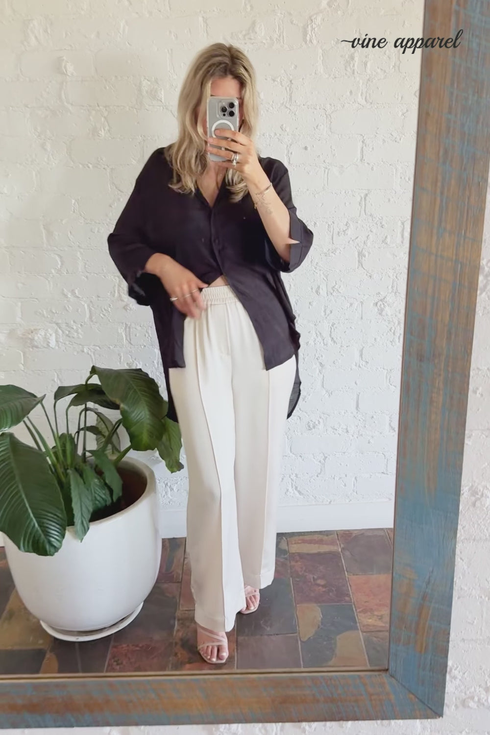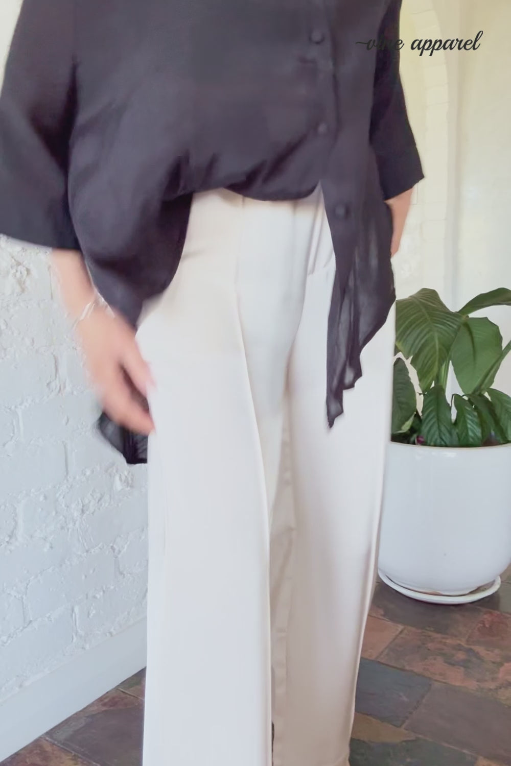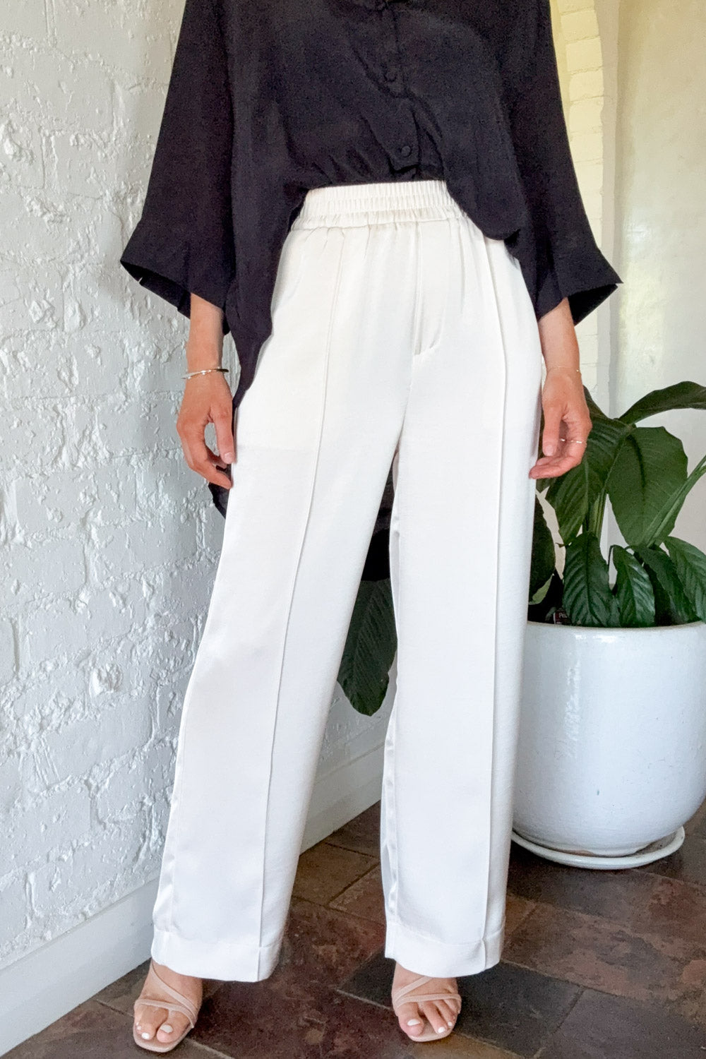 Loose, light and lovely, they have a silky feel, and the shape is super flattering. Featuring an elastic waistband, pockets and the champagne colour is STUNNING. They're dressy but comfy and amazing.