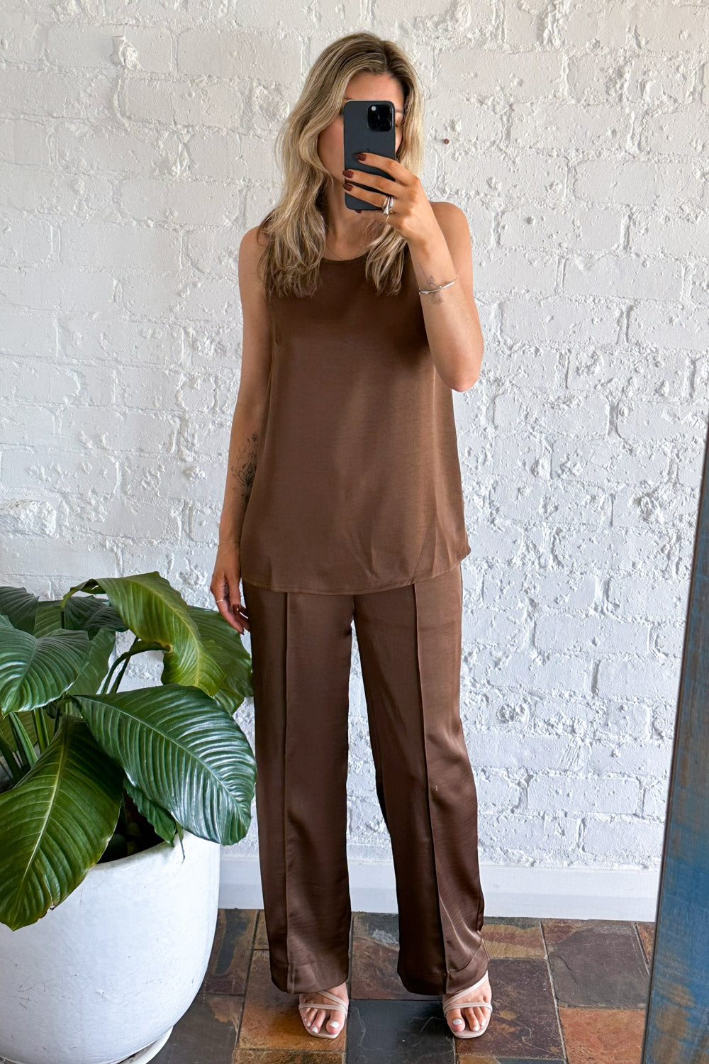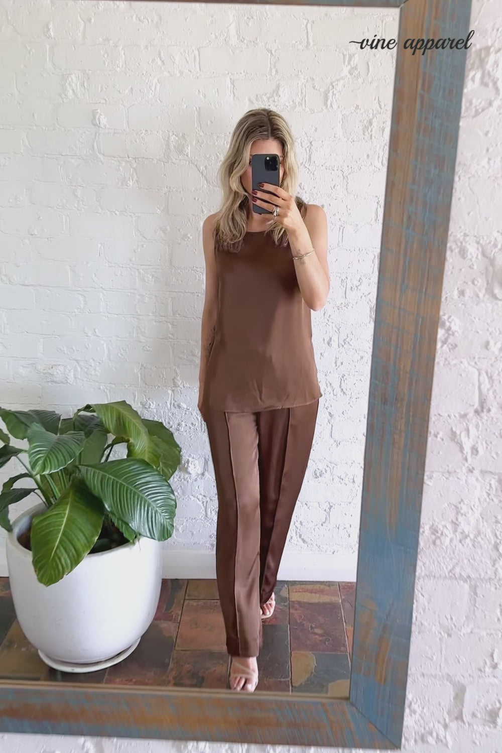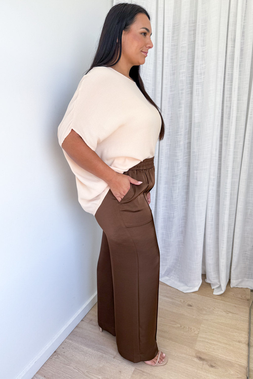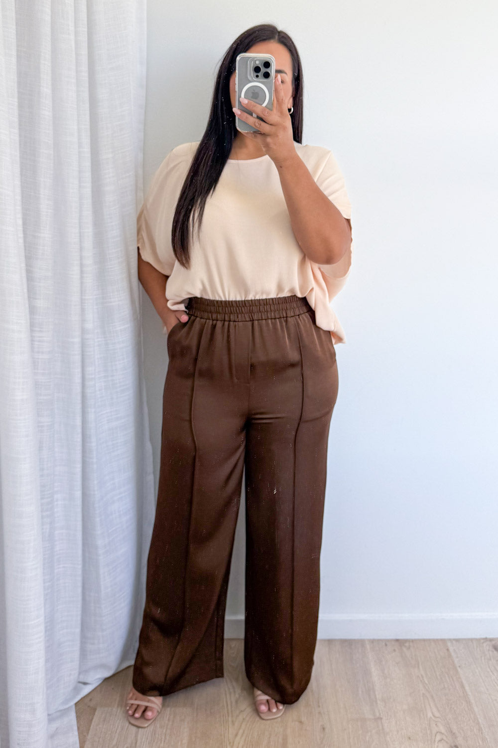 Loose, light and lovely, they have a silky feel, and the shape is super flattering. Featuring an elastic waistband, pockets and the chocolate colour is STUNNING. They're dressy but comfy and amazing.