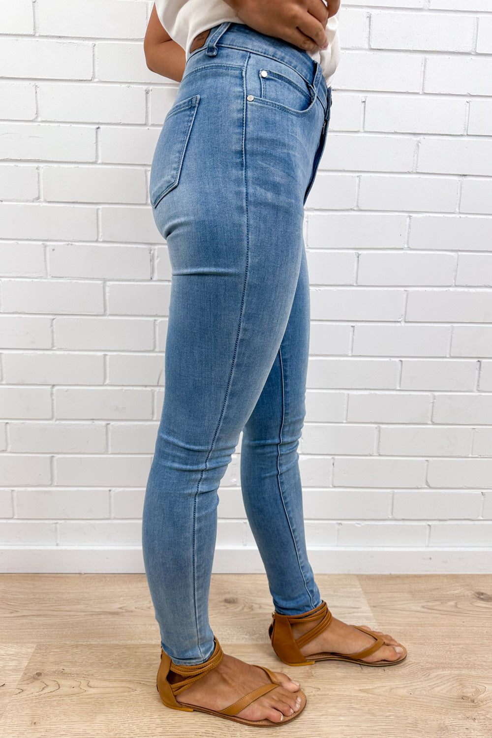 Stretchy, super flattering, and made to move with you – these light wash skinnies look AND feel good. They’re a mid rise and have pockets at the front and back – functional pockets we mean, and the colour is good.