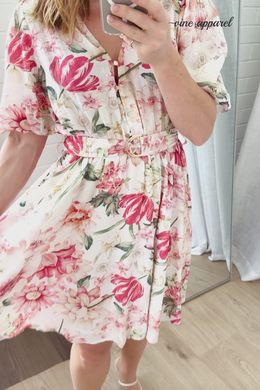 A beautiful soft fabric, functional buttons at the bust and elastic at the cuffs, this pretty dress features elastic under the bust and falls beautifully. It comes with a belt, and looks cute belted, or worn without.