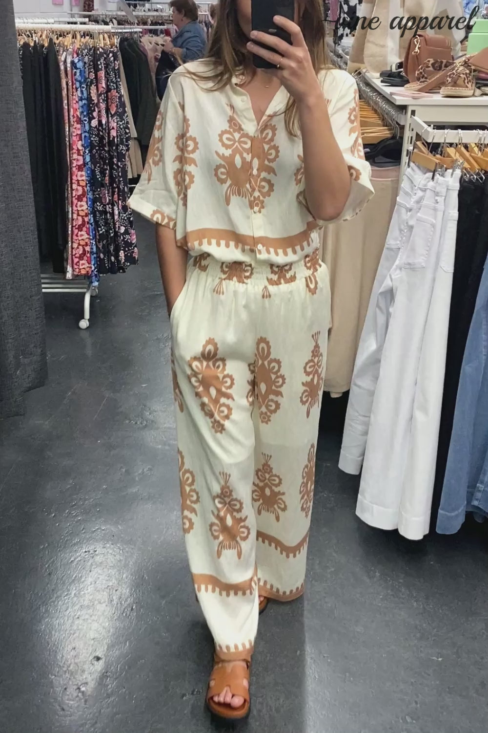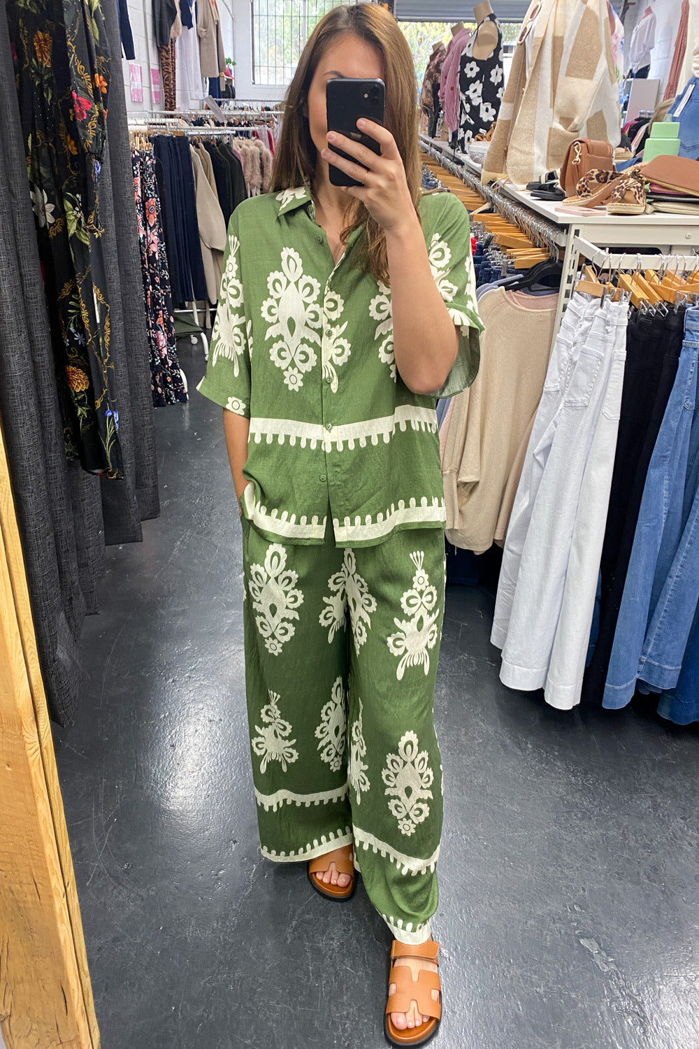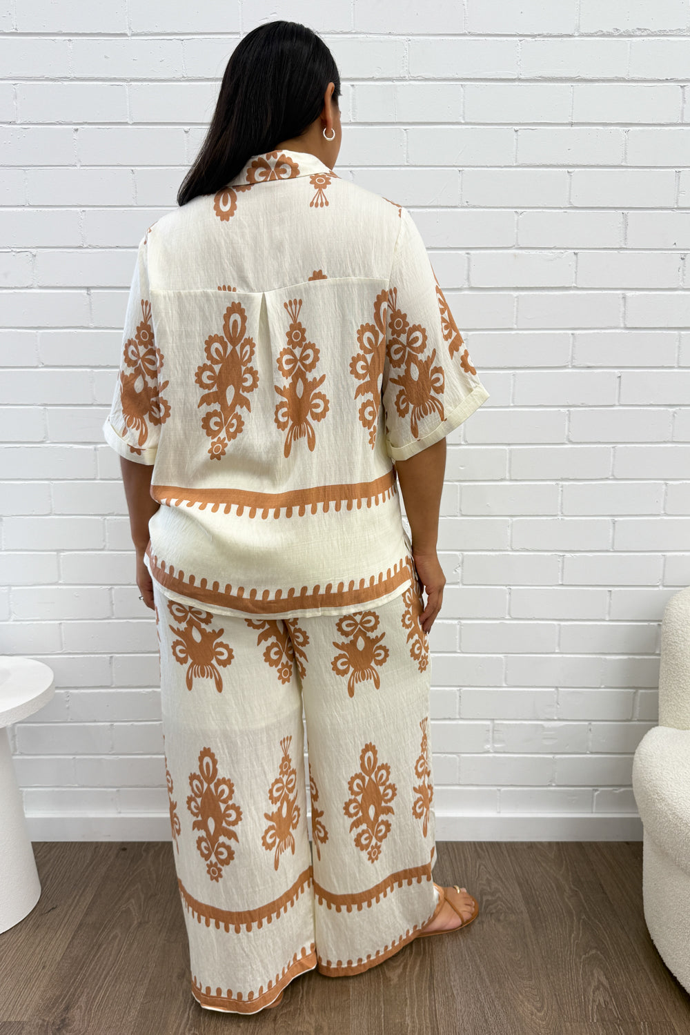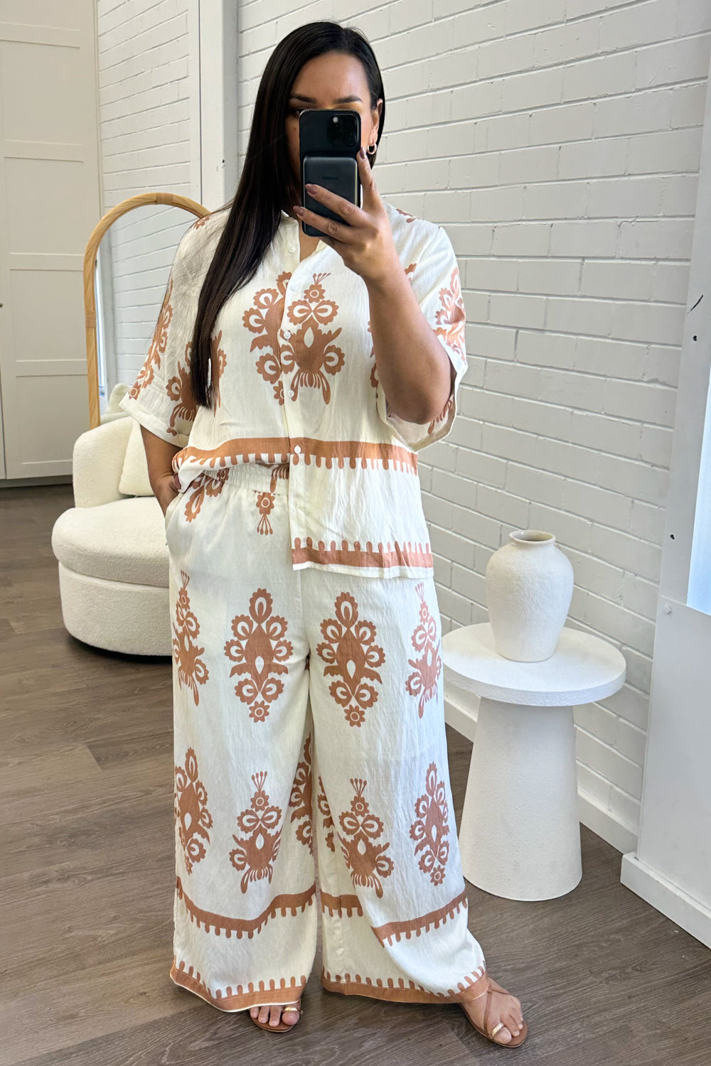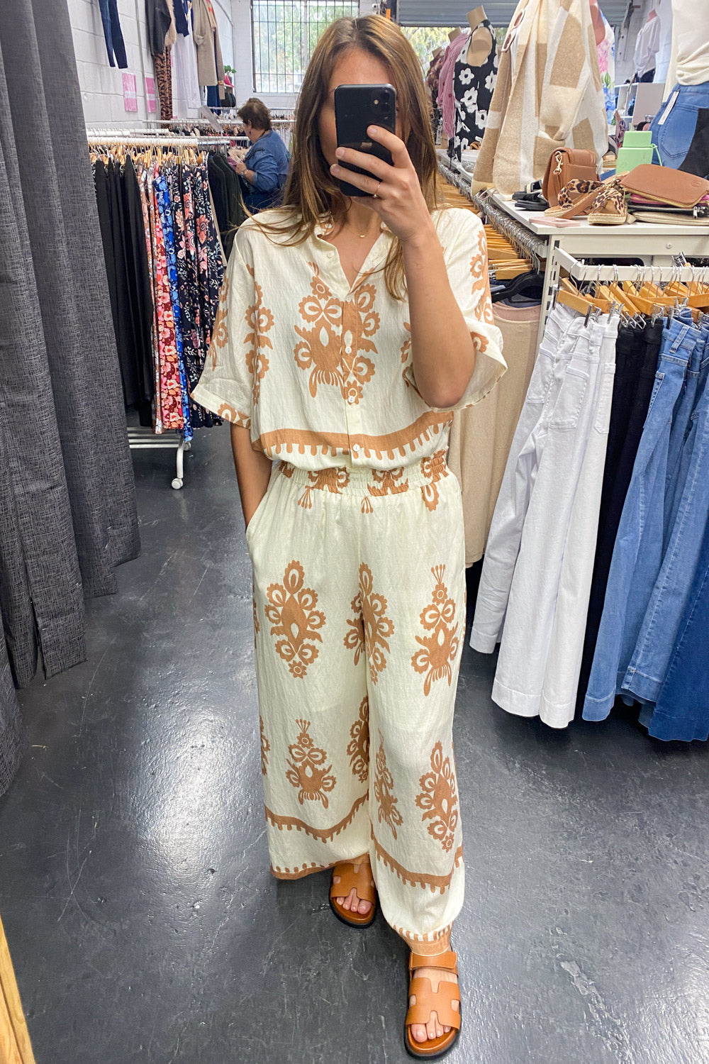 Easy to wear and easy to style, we love the shape. Tuck it in, wear it loose — whatever suits your mood. The boho print makes a statement, and the collar gives it a refined feel. Pair with the matching pants if sets are your thing.