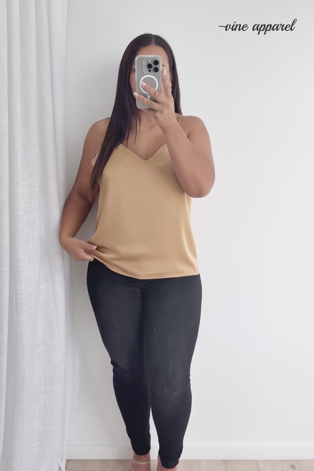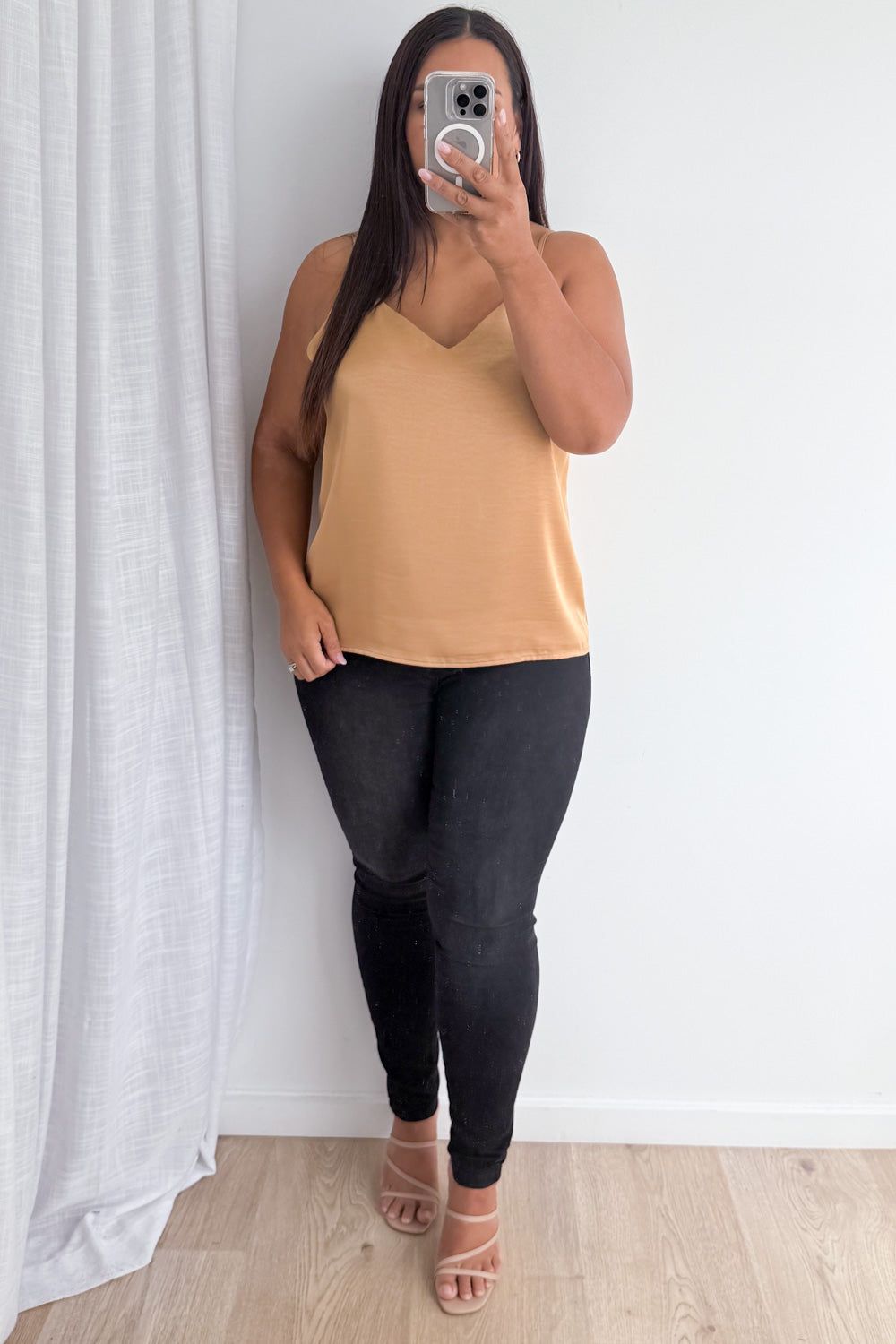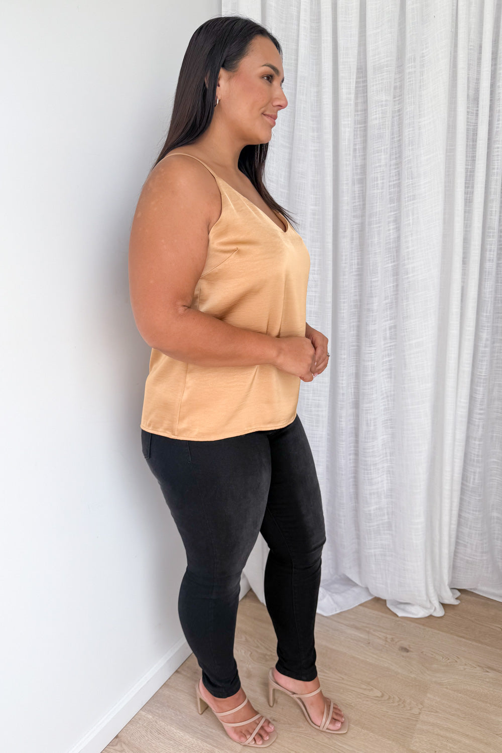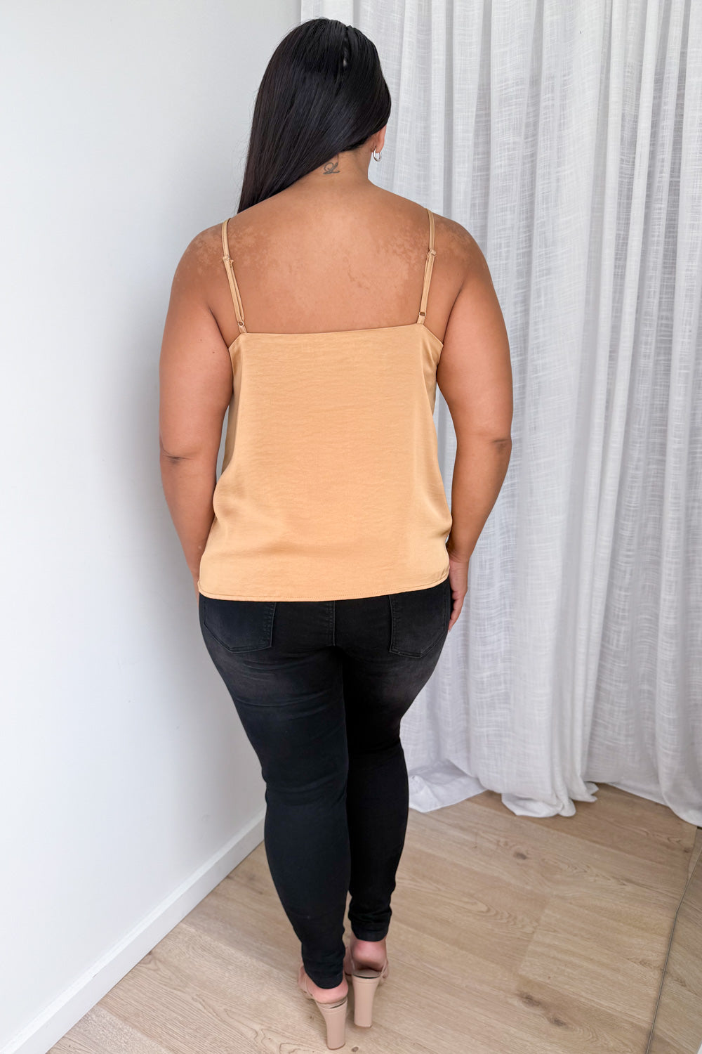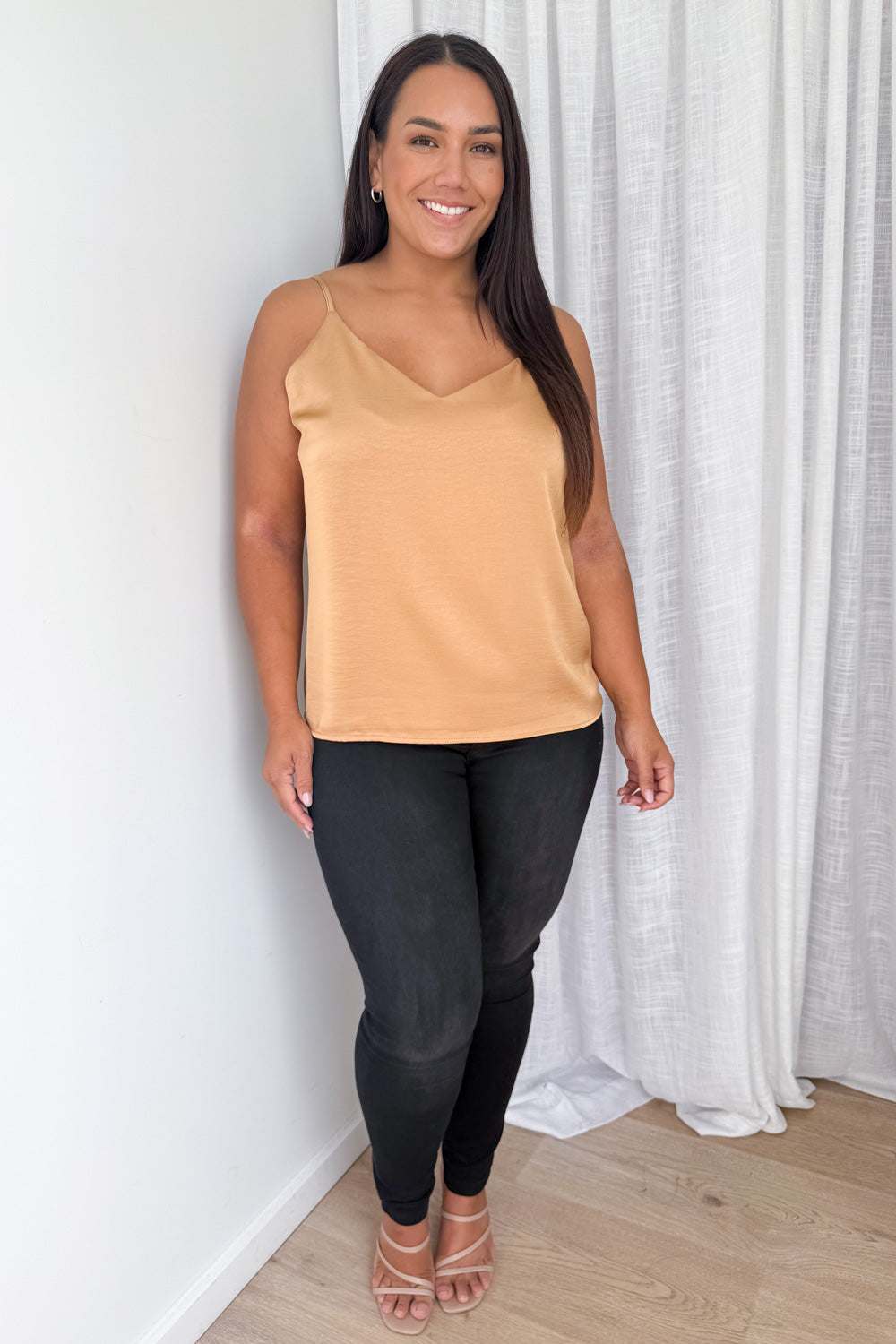 A silky kind of version of our Kellie Cami, which is just a really good basic. A good length, loose but not super baggy and has adjustable straps, a– win!