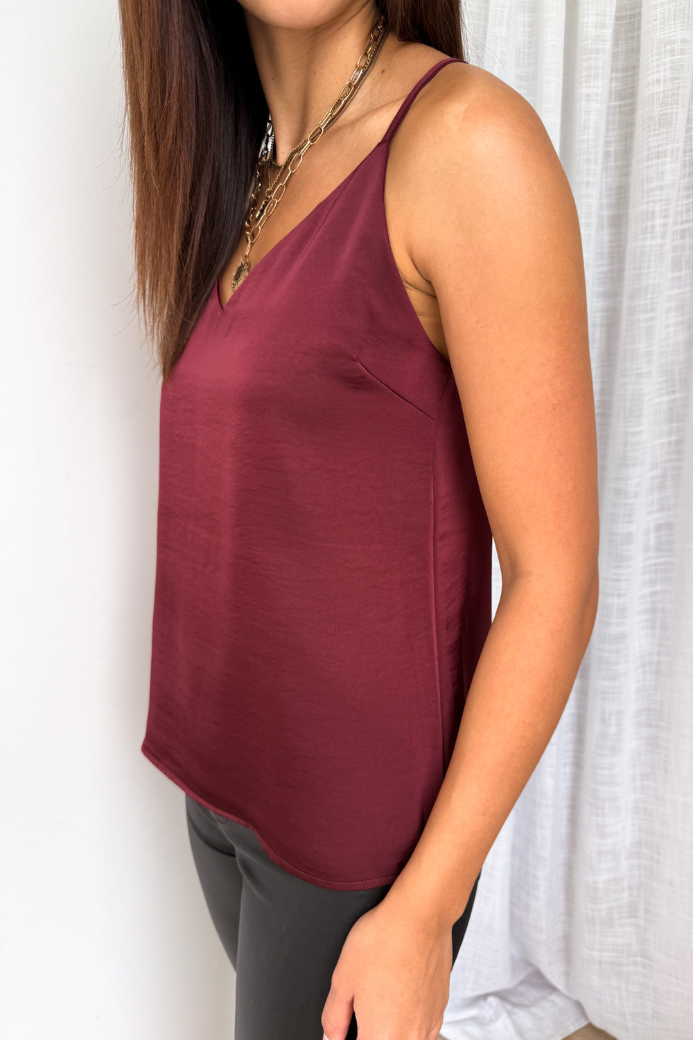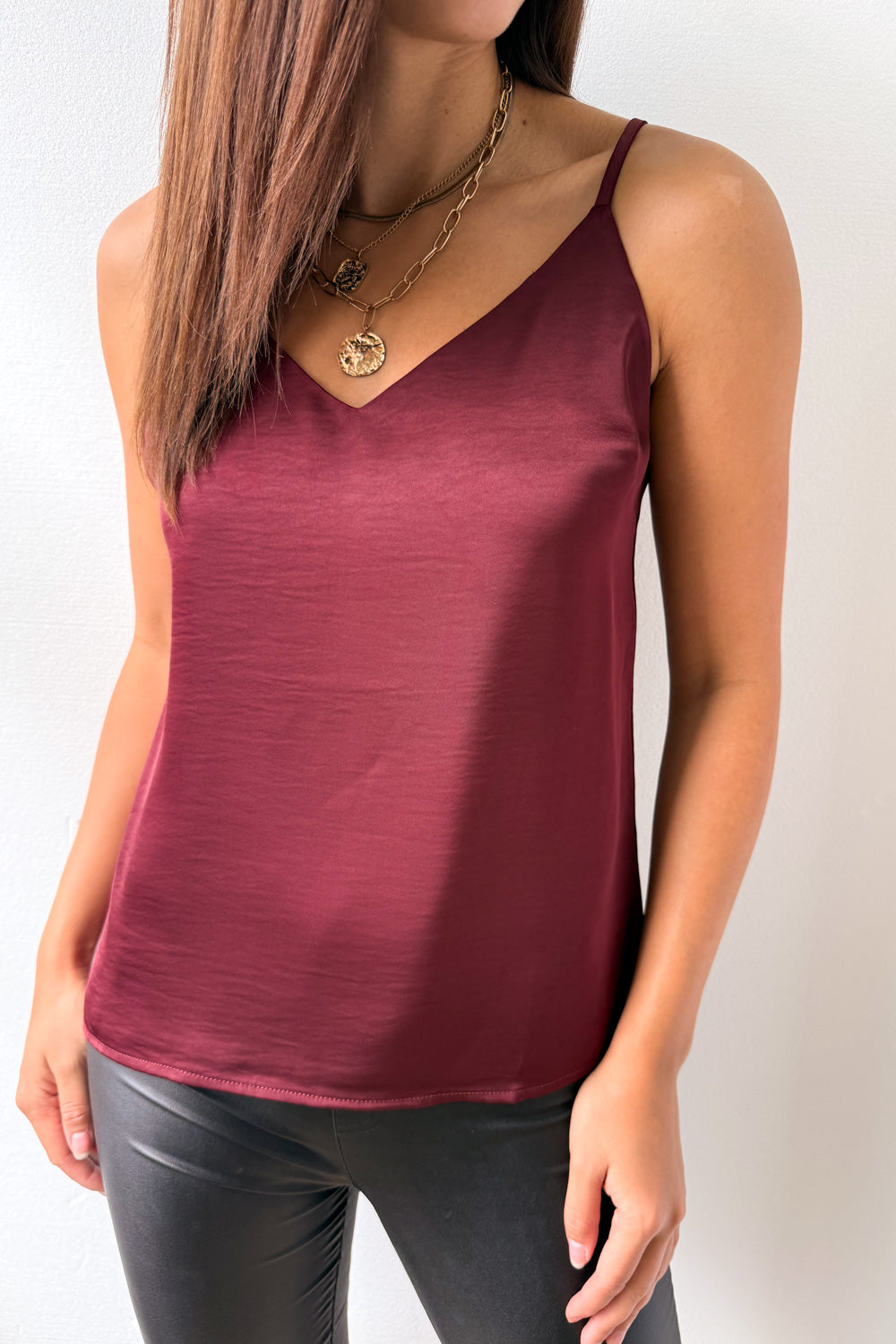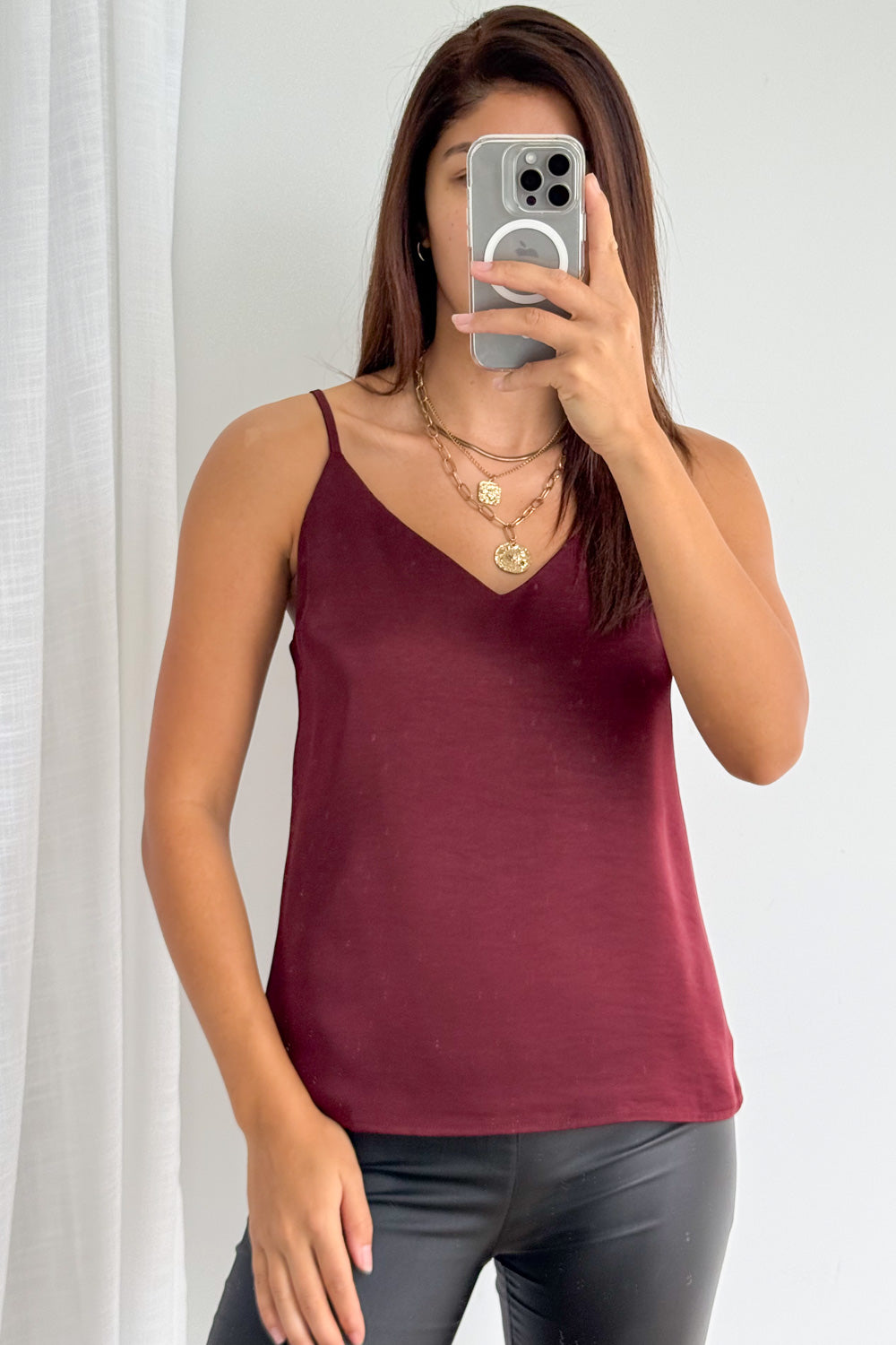 A silky kind of version of our Kellie Cami, which is just a really good basic. A good length, loose but not super baggy and has adjustable straps, a– win!