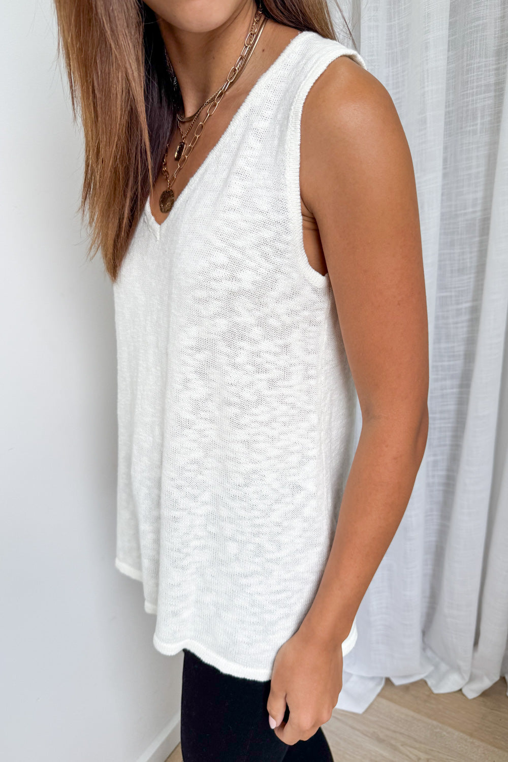 Just a good basic singlet in a knit fabric. The arm hole is good, sits down lower but you can still wear a bra but it’s not so low you can see your underarm muffins, if you have underarm muffins. The neckline is good too. And the fabric is soft.