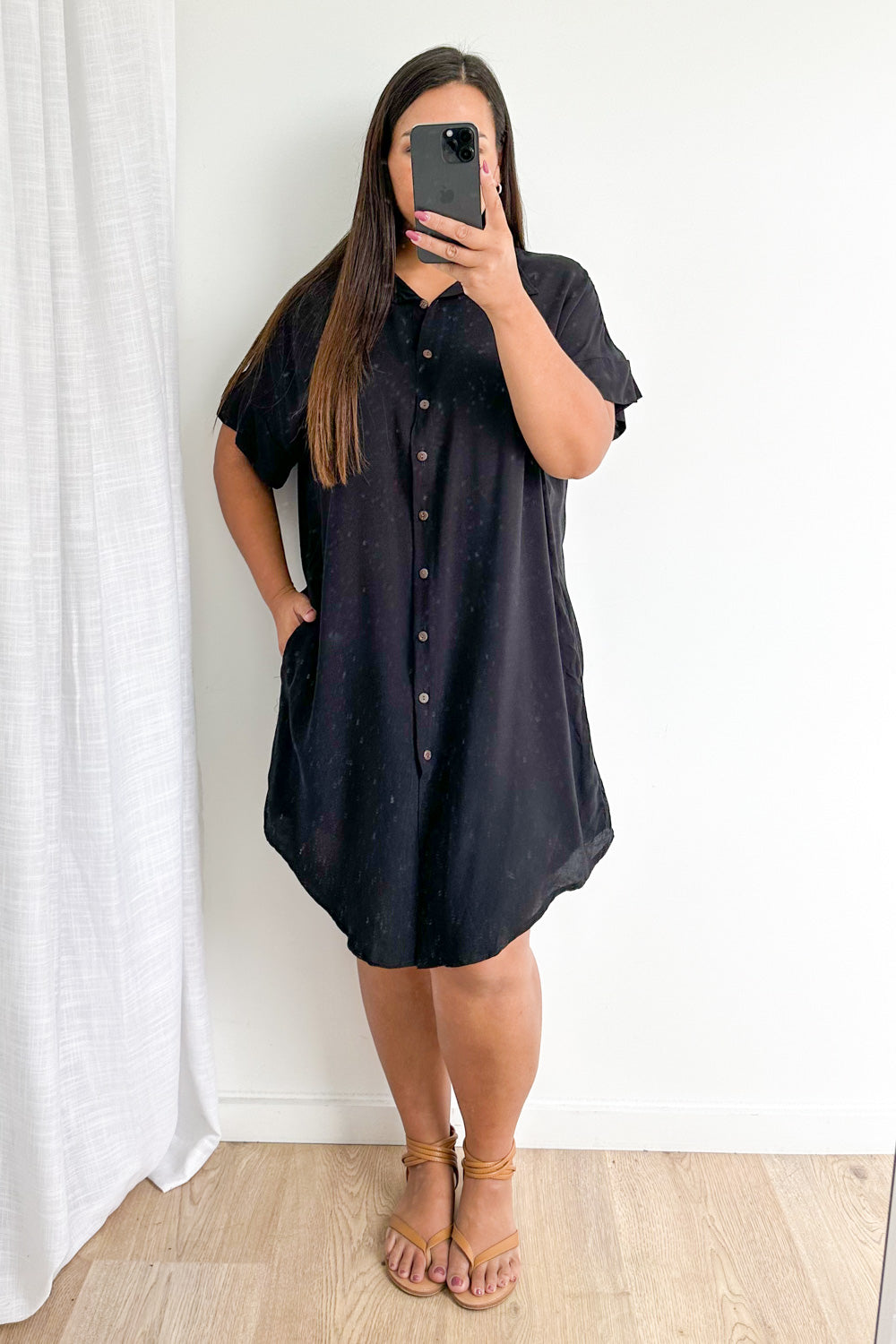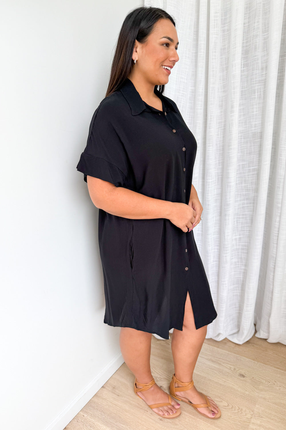 The perfect shirt dress. An easy throw on which is loose yet has shape, with functional buttons all the way down, pockets, and it scoops down lower at the front at back and comes up slightly at the sides. It’s soft, light and just so easy.