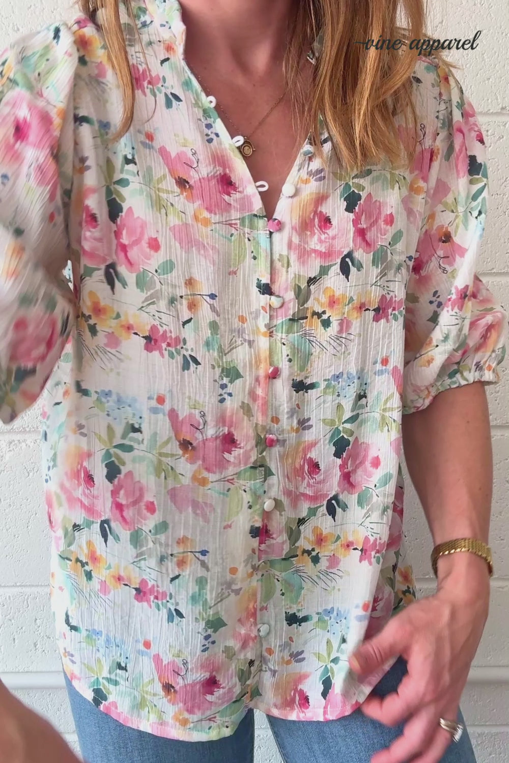 Soft and drapey with lovely fabric buttons, the sleeve is half length with elastic at the cuff. Lovely for work, weekends, and everything in between.
