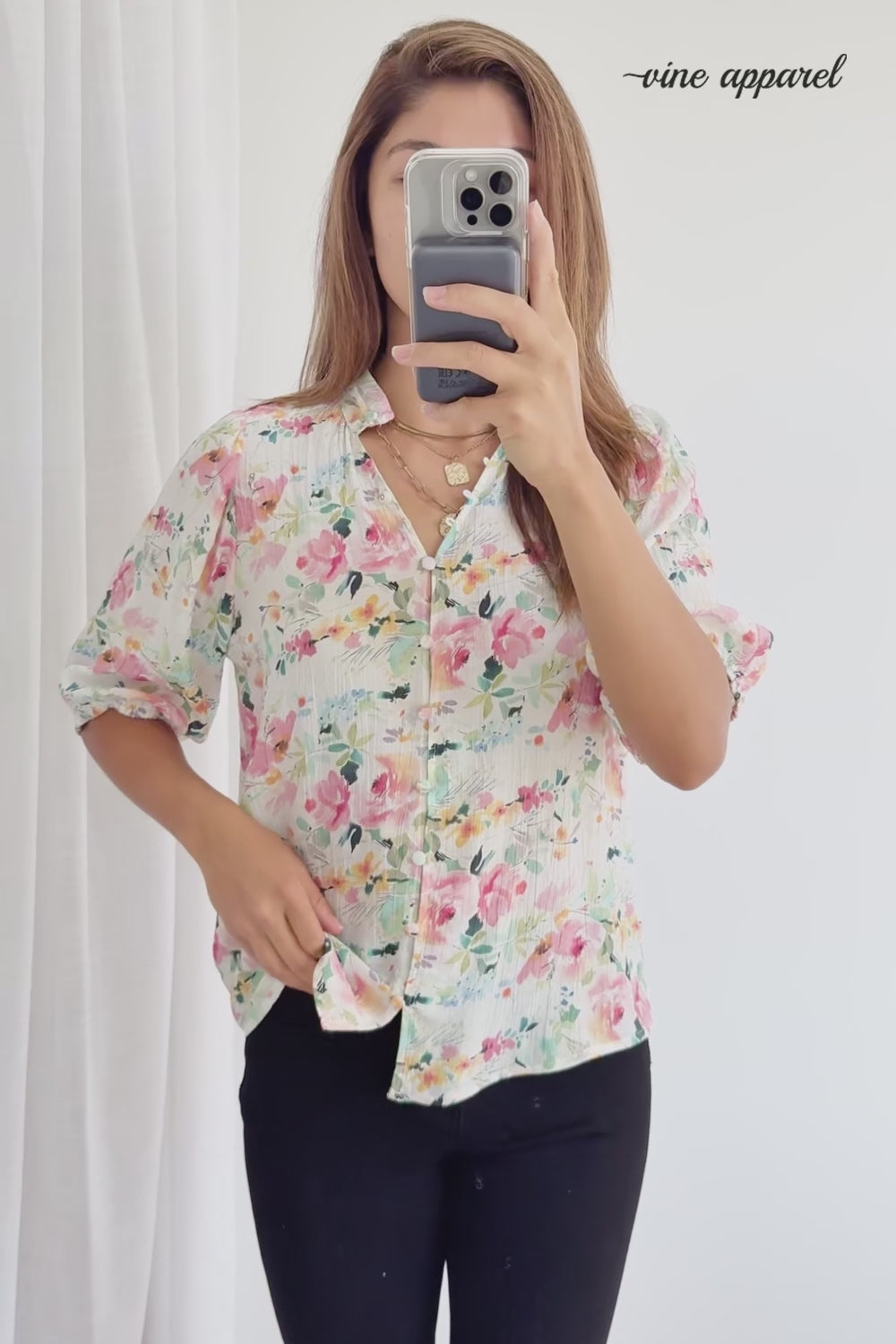 Soft and drapey with lovely fabric buttons, the sleeve is half length with elastic at the cuff. Lovely for work, weekends, and everything in between.