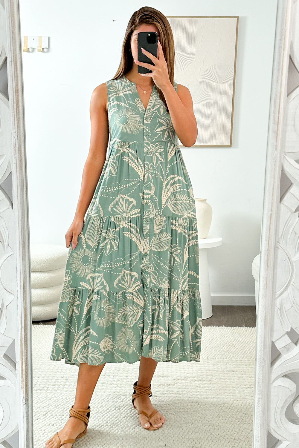 A super cute green palm smock style dress, so loose and easy and breezy and comfy! The buttons are functional, it has pockets, and the print is fab.