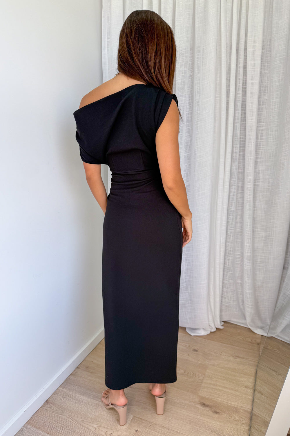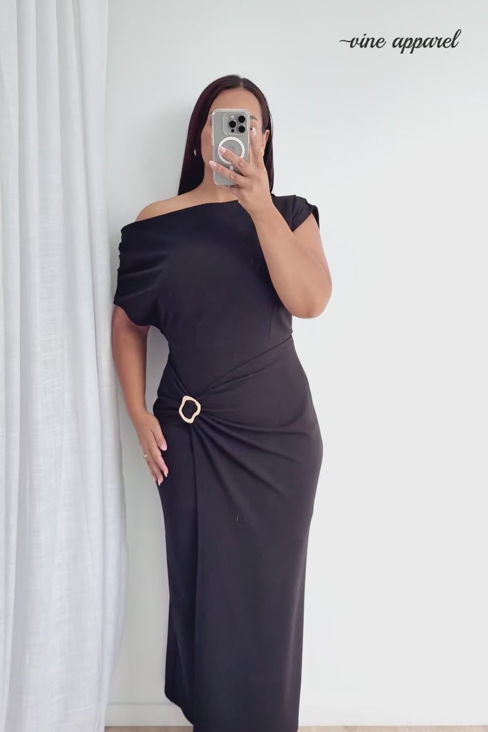 A great maxi dress – a timeless style for every occasion. It has an understated one-shoulder shape, and the fabric drapes from the waist with a slight split to the knee. It’s a little bit stretchy too.