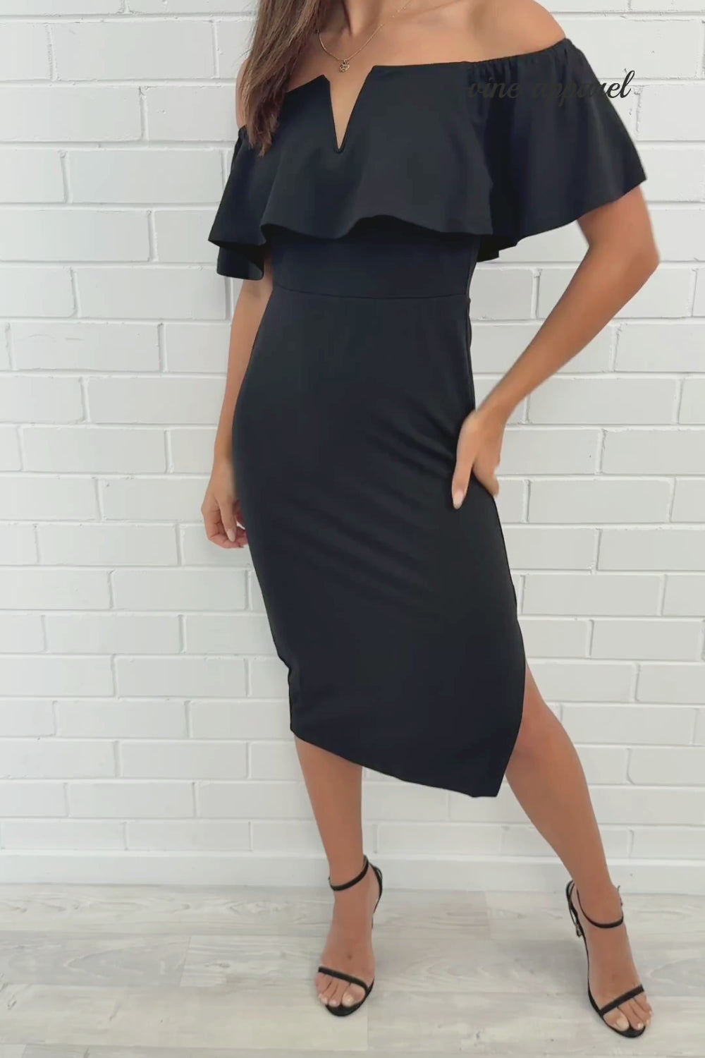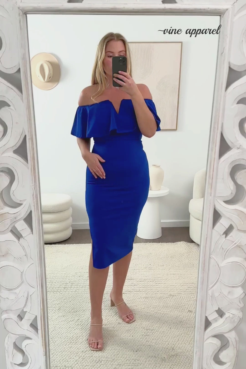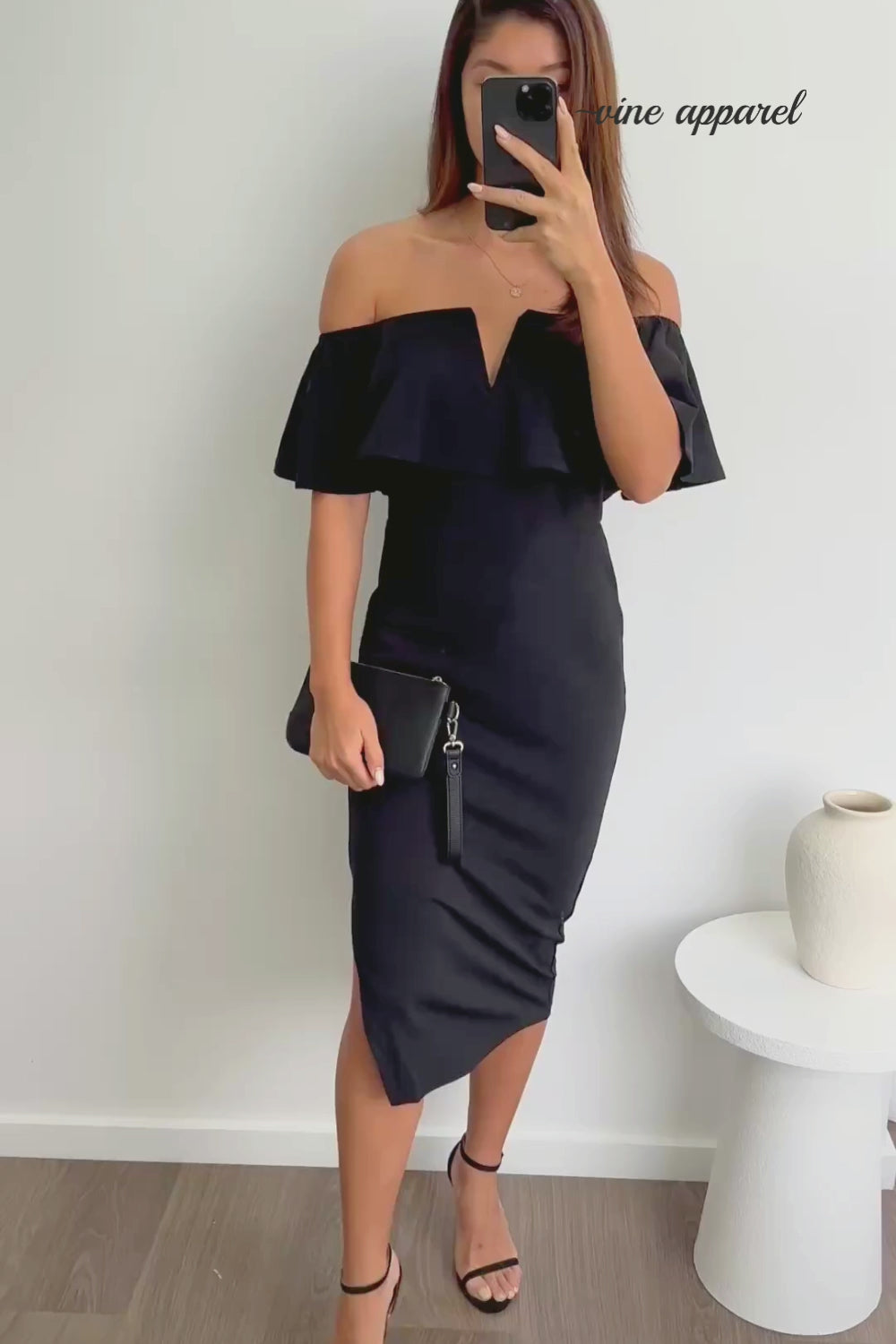A great midi dress! It has an off the shoulder shape with a structured V and frill on the bust. The fabric drapes nice along the body with a slight split to the knee. It’s a little bit stretchy too.