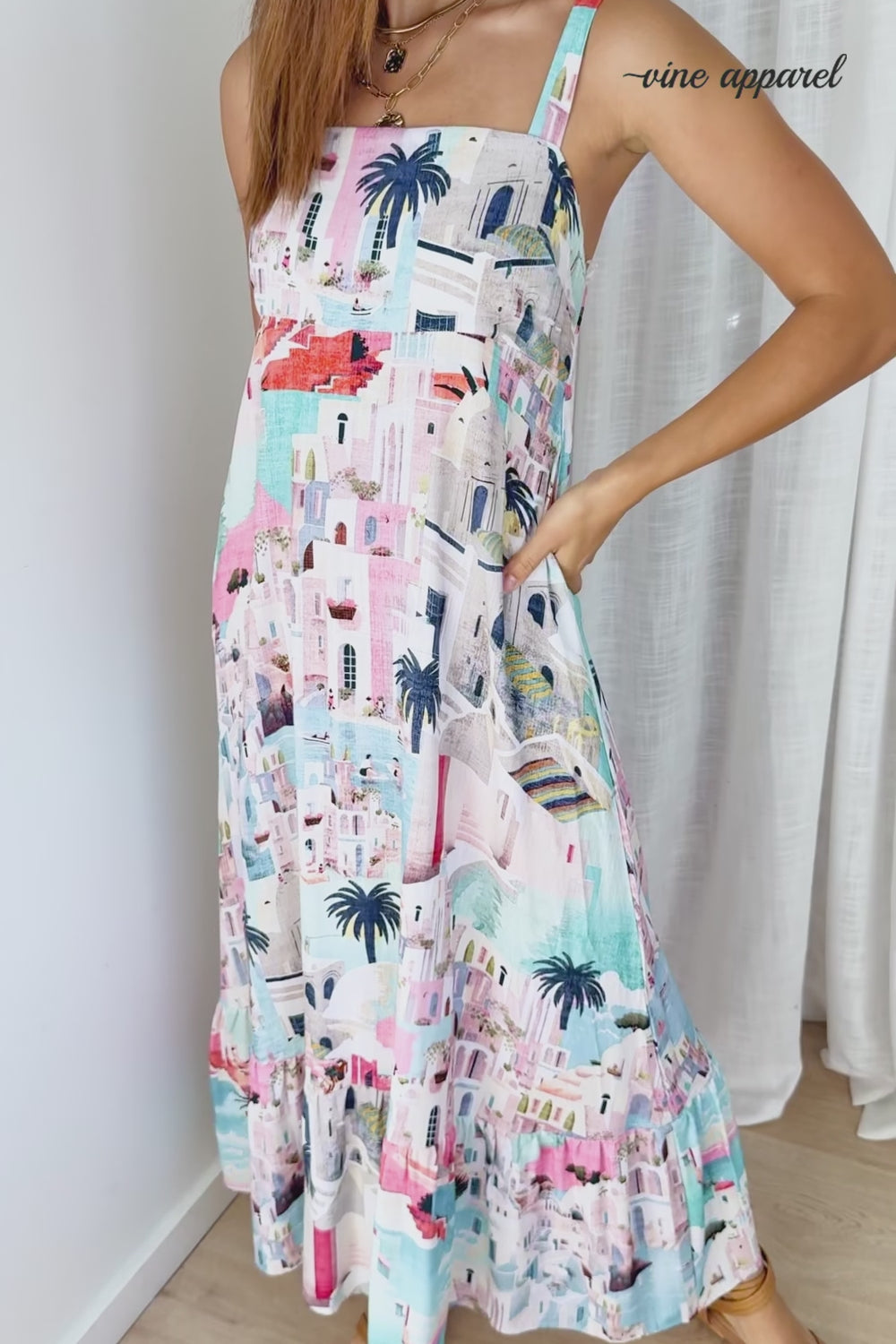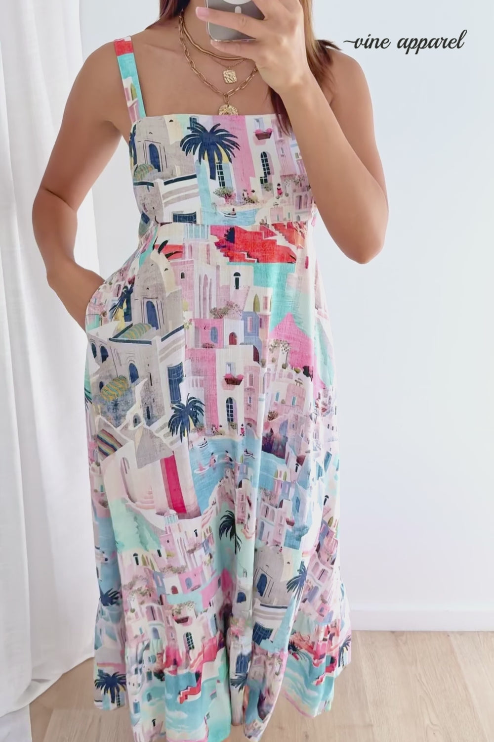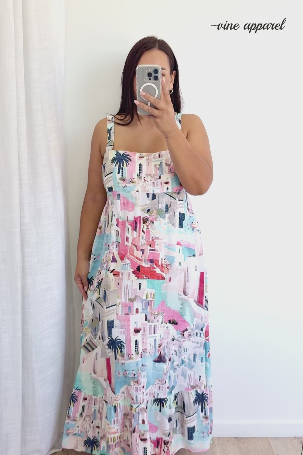 Such a beautiful costal print on an easy to wear dress which ticks all the boxes. Elastic at the back so it falls beautifully and you won't get muffins, and adjustable straps. It floats and flows beautifully, and it's just so beautiful.