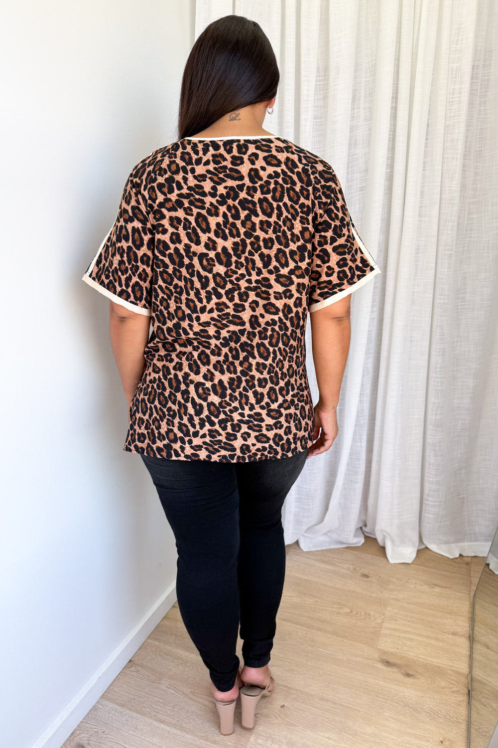 Just an easy tee in a fun leopard print, a beige trim around the sleeves and collar and splits on the side, so it sits nicely. Love.