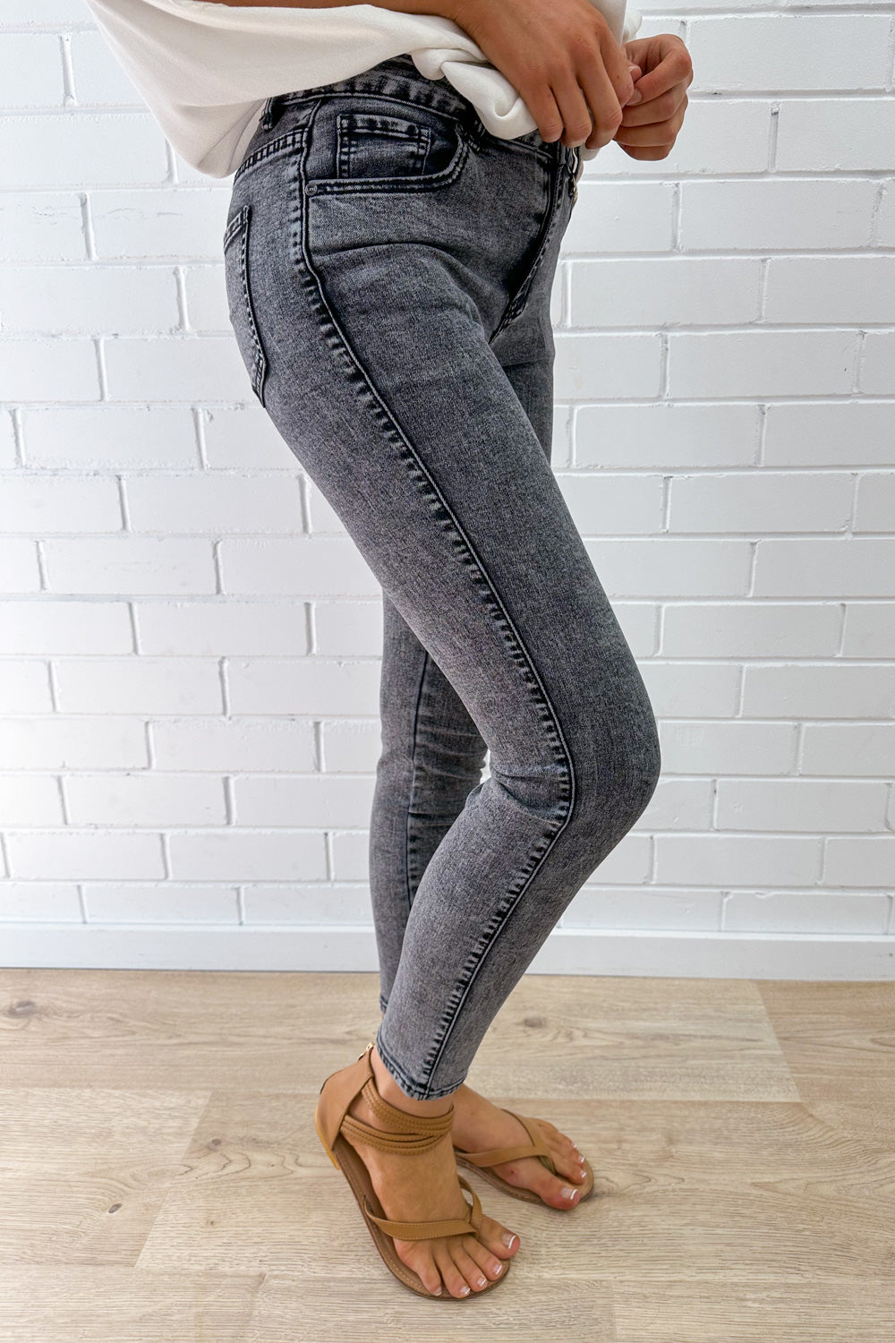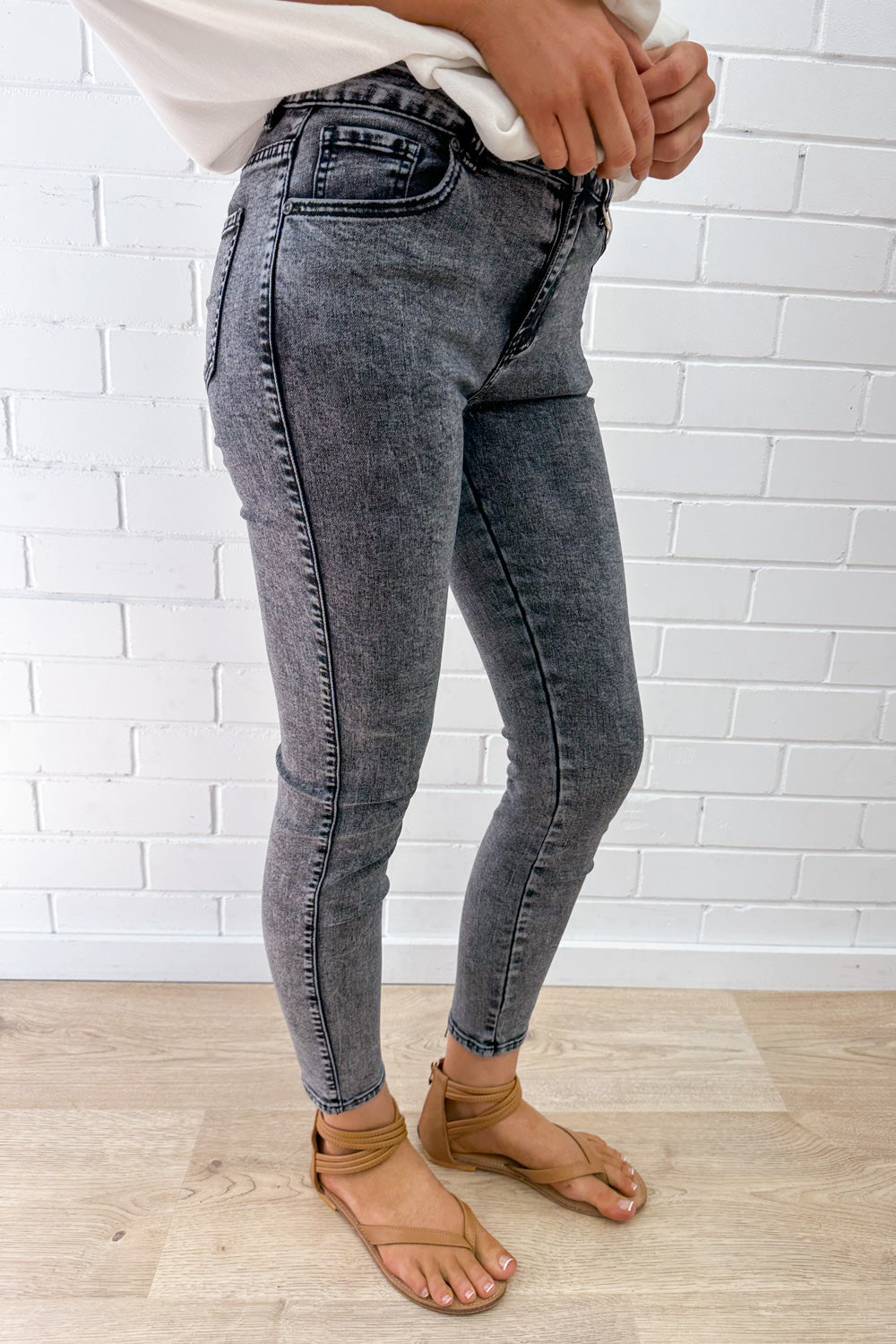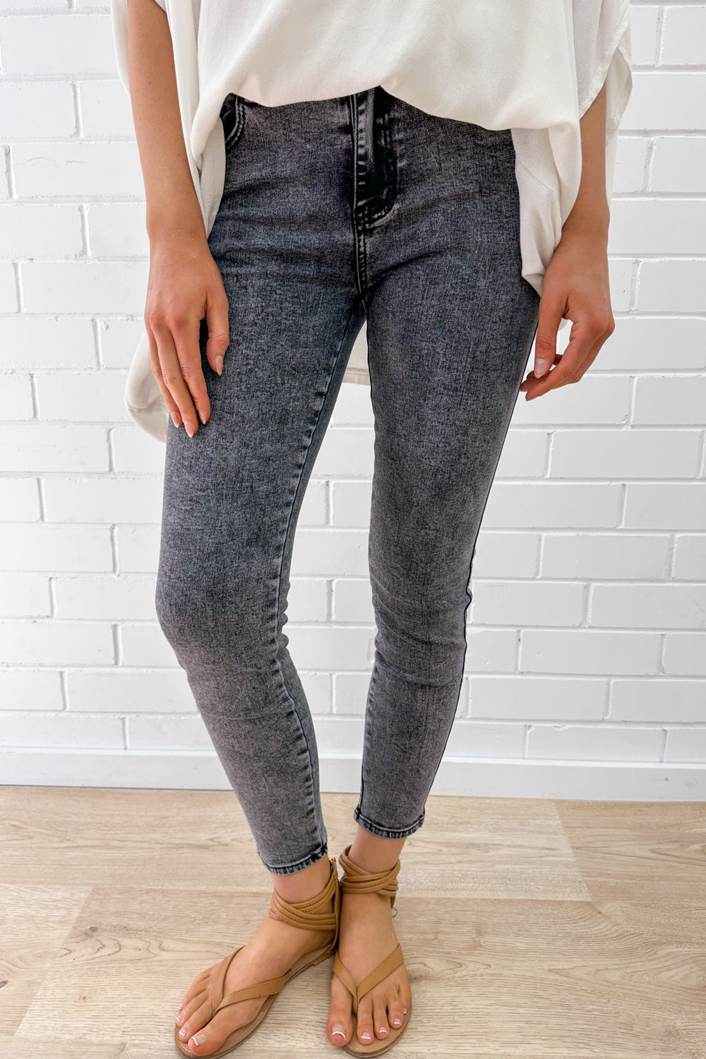 OBSESSED with this colour, I’ve been looking for good stonewash jeans for literally years. So comfy, stretchy, and just amazing. Not super long, they sit above the ankle. Love.