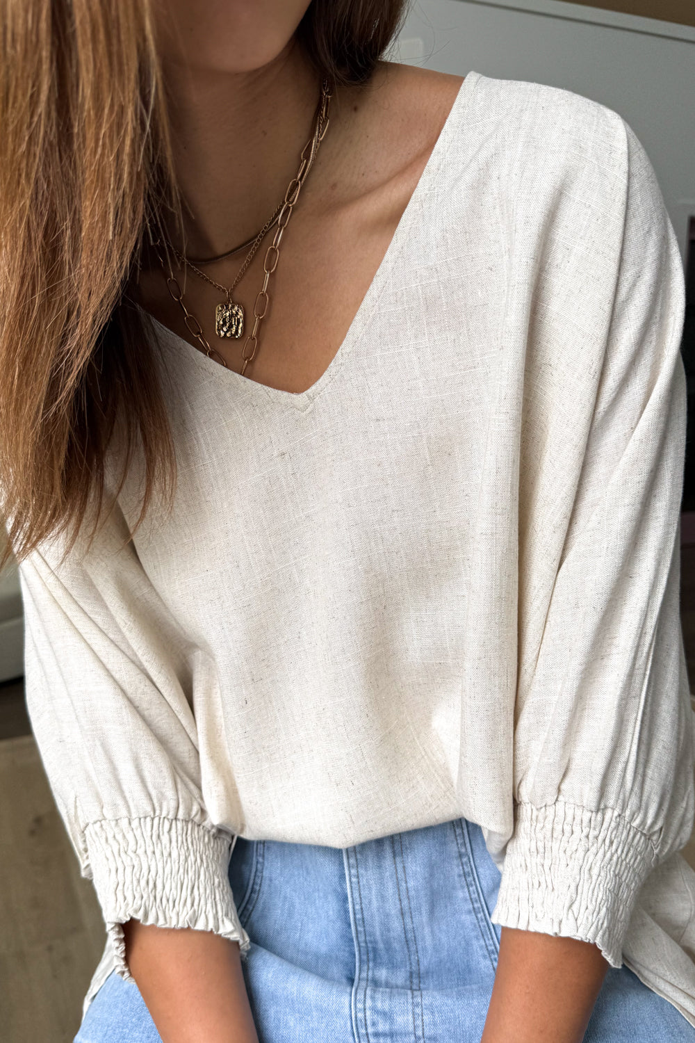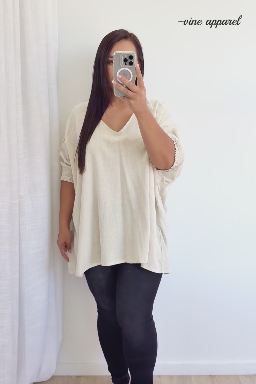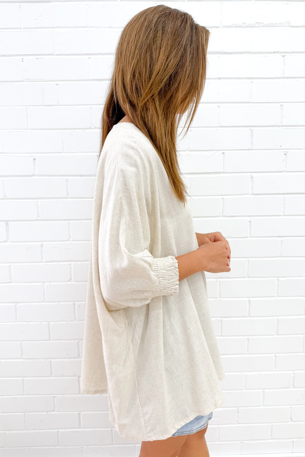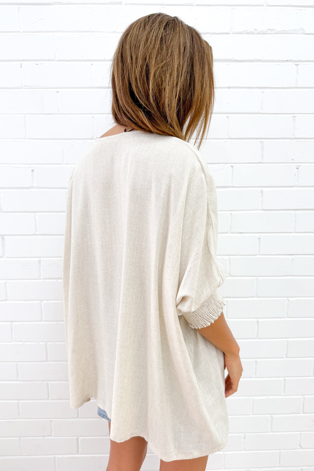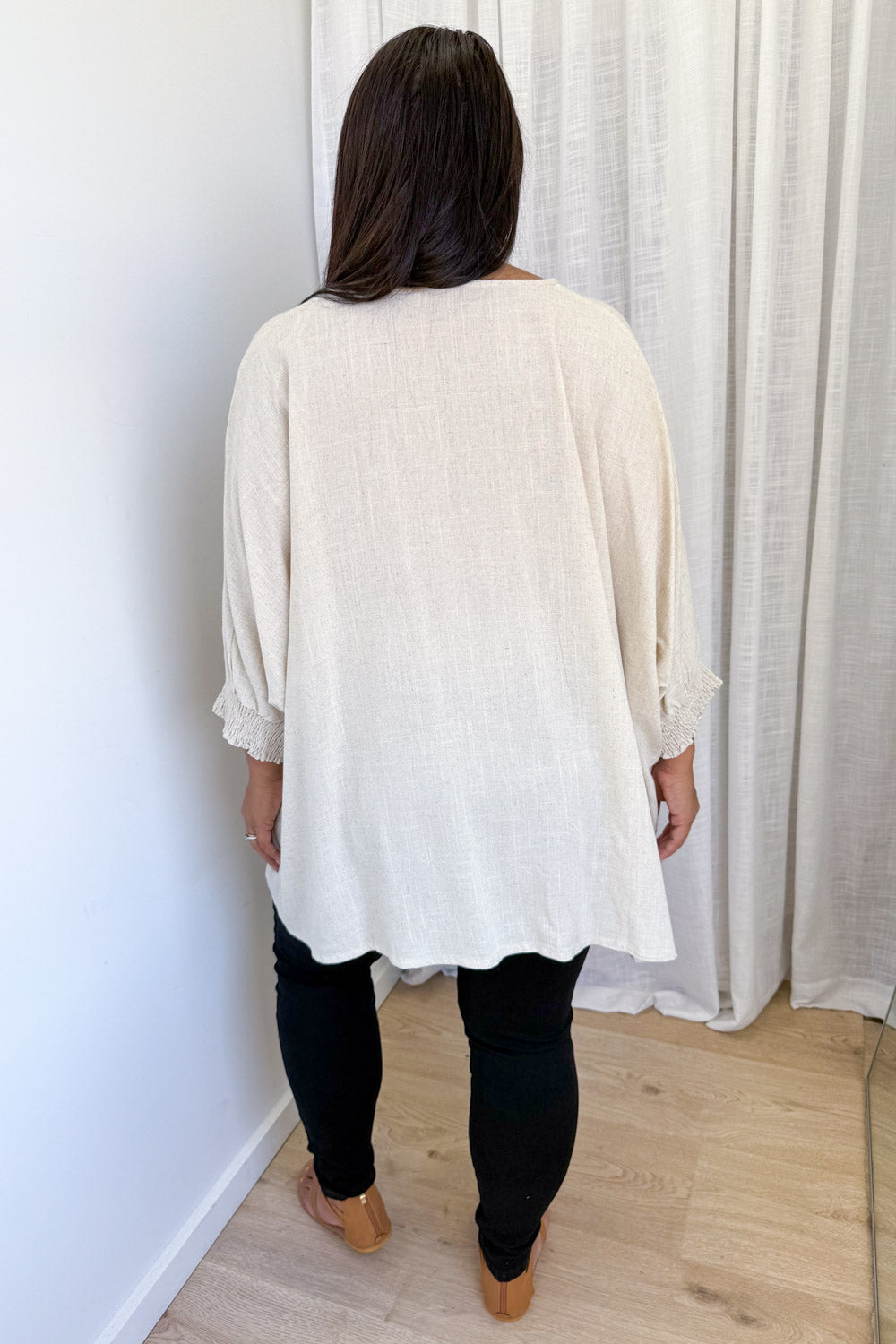 Amazing. Oversize, SO loose and drapey, it looks stunning over tights OR jeans, over a skirt, shorts or any bottoms you want to wear it with. The length is good, the cuffs are stretchy and you can wear them pulled up or down. You can wear it loose or tuck it into something. Ahhh we love it.